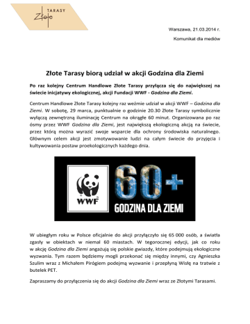 Warszawa, 21.03.2014 r. Komunikat dla mediów Złote Tarasy biorą udział w akcji Godzina dla Ziemi Po raz kolejny Centrum Handlowe Złote Tarasy przyłącza się do największej na świecie inicjatywy ekologicznej, akcji Fundacji WWF - Godzina dla Ziemi. Centrum Handlowe Złote Tarasy kolejny raz weźmie udział w akcji WWF – Godzina dla Ziemi. W sobotę, 29 marca, punktualnie o godzinie 20.30 Złote Tarasy symbolicznie wyłączą zewnętrzną iluminację Centrum na okrągłe 60 minut. Organizowana po raz ósmy przez WWF Godzina dla Ziemi, jest największą ekologiczną akcją na świecie, przez którą można wyrazić swoje wsparcie dla ochrony środowiska naturalnego. Głównym celem akcji jest zmotywowanie ludzi na całym świecie do przyjęcia i kultywowania postaw proekologicznych każdego dnia. W ubiegłym roku w Polsce oficjalnie do akcji przyłączyło się 65 000 osób, a światła zgasły w obiektach w niemal 60 miastach. W tegorocznej edycji, jak co roku w akcję Godzina dla Ziemi angażują się polskie gwiazdy, które podejmują ekologiczne wyzwania. Tym razem będziemy mogli przekonać się między innymi, czy Agnieszka Szulim wraz z Michałem Pirógiem podejmą wyzwanie i przepłyną Wisłę na tratwie z butelek PET. Zapraszamy do przyłączenia się do akcji Godzina dla Ziemi wraz ze Złotymi Tarasami. Złote Tarasy to wielofunkcyjny kompleks, który powstał w samym sercu Warszawy. Obiekt mieści się między ulicami: Złotą i Emilii Plater oraz Dworcem Centralnym i Al. Jana Pawła II. Jego symbolem jest pofalowany szklany dach o powierzchni 1 hektara. Nazwa Złote Tarasy nawiązuje do ulicy Złotej i do architektury budynku. Kaskadowo rozmieszczone tarasy obejmują dwa place miejskie – wewnętrzny z fontanną oraz zewnętrzny, otoczony restauracjami. Na pięciu poziomach centrum klienci znajdą ponad 200 marek handlowych, kilkadziesiąt restauracji i kawiarni, kluby muzyczne, kino, klub fitness oraz szereg punktów usługowych. Projekt i funkcjonalność obiektu zostały już wielokrotnie nagrodzone. Złote Tarasy są zdobywcą tytułu najlepszego projektu komercyjnego na świecie (MIPIM Architectural Review Future Project Awards). Więcej na stronie internetowej www.zlotetarasy.pl Dalszych informacji udzielą: Marta Kucewicz Cohn&Wolfe Sp. z o. o. m:+48 510 089 436 p: +48 (22) 2500 900 [email protected]
