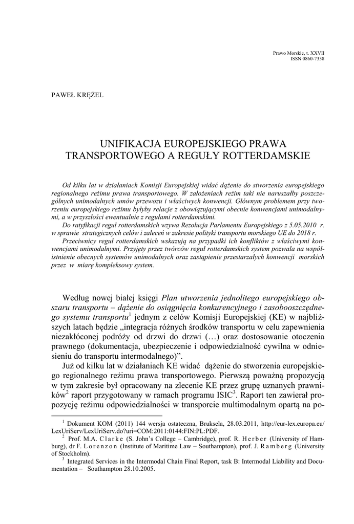 Prawo Morskie, t. XXVII ISSN 0860-7338 PAWEŁ KRĘŻEL UNIFIKACJA EUROPEJSKIEGO PRAWA TRANSPORTOWEGO A REGUŁY ROTTERDAMSKIE Od kilku lat w działaniach Komisji Europejskiej widać dążenie do stworzenia europejskiego regionalnego reżimu prawa transportowego. W założeniach reżim taki nie naruszałby poszczególnych unimodalnych umów przewozu i właściwych konwencji. Głównym problemem przy tworzeniu europejskiego reżimu byłyby relacje z obowiązującymi obecnie konwencjami unimodalnymi, a w przyszłości ewentualnie z regułami rotterdamskimi. Do ratyfikacji reguł rotterdamskich wzywa Rezolucja Parlamentu Europejskiego z 5.05.2010 r. w sprawie strategicznych celów i zaleceń w zakresie polityki transportu morskiego UE do 2018 r. Przeciwnicy reguł rotterdamskich wskazują na przypadki ich konfliktów z właściwymi konwencjami unimodalnymi. Przyjęty przez twórców reguł rotterdamskich system pozwala na współistnienie obecnych systemów unimodalnych oraz zastąpienie przestarzałych konwencji morskich przez w miarę kompleksowy system. Według nowej białej księgi Plan utworzenia jednolitego europejskiego obszaru transportu – dążenie do osiągnięcia konkurencyjnego i zasobooszczędnego systemu transportu1 jednym z celów Komisji Europejskiej (KE) w najbliższych latach będzie „integracja różnych środków transportu w celu zapewnienia niezakłóconej podróży od drzwi do drzwi (…) oraz dostosowanie otoczenia prawnego (dokumentacja, ubezpieczenie i odpowiedzialność cywilna w odniesieniu do transportu intermodalnego)”. Już od kilku lat w działaniach KE widać dążenie do stworzenia europejskiego regionalnego reżimu prawa transportowego. Pierwszą poważną propozycją w tym zakresie był opracowany na zlecenie KE przez grupę uznanych prawników2 raport przygotowany w ramach programu ISIC3. Raport ten zawierał propozycję reżimu odpowiedzialności w transporcie multimodalnym opartą na po1 Dokument KOM (2011) 144 wersja ostateczna, Bruksela, 28.03.2011, http://eur-lex.europa.eu/ LexUriServ/LexUriServ.do?uri=COM:2011:0144:FIN:PL:PDF. 2 Prof. M.A. C l a r k e (S. John’s College – Cambridge), prof. R. H e r b e r (University of Hamburg), dr F. L o r e n z o n (Institute of Maritime Law – Southampton), prof. J. R a m b e r g (University of Stockholm). 3 Integrated Services in the Intermodal Chain Final Report, task B: Intermodal Liability and Documentation – Southampton 28.10.2005. 148 Paweł Krężel strzeganiu kontraktu transportu multimodalnego jako formy transportu sui generis, odrębnej od unimodalnej umowy przewozu. Przewidywał on tzw. uniform system – jednakowe zasady niezależnie od rodzaju transportu, oparte na jednym multimodalnym kontrakcie i dokumencie przewozowym. W założeniu twórców reżim taki nie naruszał postanowień poszczególnych unimodalnych umów przewozu i właściwych dla niego konwencji. Nie poruszał również kwestii relacji takiego przewoźnika multimodalnego (zwanego w projekcie transport integrator4) z jego podwykonawcami – przewoźnikami na poszczególnych odcinkach. Projekt ten przewidywał obiektywną odpowiedzialność takiego przewoźnika multimodalnego oraz limit odpowiedzialności 17 SDR za kilogram (obecnie najwyższy w unimodalnych konwencjach). Zawierał jednak możliwość wyłączenia przez strony jego stosowania – tzw. klauzulę opt-out. Kolejnym dokumentem przedstawionym przez KE w ramach prac nad uproszczeniem zasad regulujących odpowiedzialność przewoźnika i zwiększeniem atrakcyjności transportu multimodalnego było studium opracowane przez hiszpańską kancelarię prawną Gomez-Acebo & Pombo, Abogados SCP5. Studium to oficjalnie zaprezentowane zostało przedstawicielom państw członkowskich na spotkaniu w siedzibie DG TREN (obecnie DG MOVE) w Brukseli, w przededniu podpisania reguł rotterdamskich6 – poniekąd jako alternatywa dla podpisywania reguł. Przewiduje ono opracowanie nowej konwencji transportowej na poziomie europejskim, z możliwością przystąpienia do niej państw trzecich. Twórcy projektu postulują nawet podjęcie działań dyplomatycznych przez KE, mających na celu przyjęcie takiej konwencji również poza UEi w konsekwencji jej jak najszerszy zakres geograficzny. Konwencja taka opierałaby się na tzw. modified uniform regime – zmodyfikowanym jedynie co do wysokości limitów w taki sposób, że strony mogłyby powiązać dany kontrakt multimodalny z limitami odpowiedzialności dla „głównego” środka transportu. Jeśli zatem strony uznałyby, że głównym środkiem transportu dla danego kontraktu multimodalnego jest transport drogowy, następowałoby odesłanie do limitów odpowiedzialności z konwencji CMR7. W razie braku uregulowania przez strony zastosowanie miałyby limity właściwe dla najdłuższego – licząc w kilometrach – odcinka, a w przypadku trudności w ustaleniu najdłuższego odcinka, najwyż4 Definiowany jako podmiot, który undertakes to perform or procure the transport of goods. Dodanie słowa procure rozszerza zakres definicji o sferę organizowania i przygotowania do przewozu, w której działają spedytorzy. 5 Details and added value of establishing a (optional) single transport (electronic) document for all carriage of goods, irrespective of mode, as well as a standard liability clause (voluntary liability regime), with regard to their ability to facilitate multimodal freight transport and enhance the framework offered by multimodal waybills and or multimodal manifests – dostępny na stronie DG MOVE. 6 Konwencja Narodów Zjednoczonych o umowach międzynarodowego przewozu towarów, w całości lub częściowo, drogą morską. Polska podpisała konwencję podczas uroczystej ceremonii, która odbyła się 23.09.2009 r. w Rotterdamie. 7 Konwencja o umowie międzynarodowego przewozu drogowego towarów z 1956 r. (Dz.U. z 1962 r., Nr 49, poz. 238). Unifikacja europejskiego prawa transportowego a reguły rotterdamskie 149 szy ob