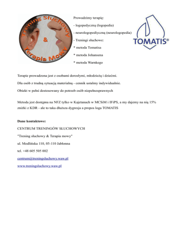 Prowadzimy terapię: - logopedyczną (logopedia) - neurologopediyczną (neurologopedia) - Treningi słuchowe: * metoda Tomatisa * metoda Johansena * metoda Warnkego Terapie prowadzona jest z osobami dorosłymi, młodzieżą i dziećmi. Dla osób z trudną sytuacją materialną - cennik ustalmy indywidualnie. Obiekt w pełni dostosowany do potrzeb osób niepełnosprawnych Metoda jest dostępna na NFZ tylko w Kajetanach w MCSiM i IFiPS, a my dajemy na nią 15% zniżki z KDR - ale to taka dłuższa dygresja a propos loga TOMATIS Dane kontaktowe: CENTRUM TRENINGÓW SŁUCHOWYCH "Trening słuchowy & Terapia mowy" ul. Modlińska 110, 05-110 Jabłonna tel. +48 605 505 002 [email protected] www.treningsluchowy.waw.pl