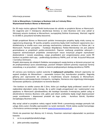 Informacja prasowa Warszawa, 2 kwietnia 2014r. 3 dni w Monachium, 3 miesiące w Business Link za 3 minuty filmu Wystartował konkurs Biznes w Niemczech Do 30 maja można zgłaszać filmiki konkursowe do udziału w projekcie Biznes w Niemczech. Do wygrania jest 3 miesięczna akceleracja biznesu w sieci Business Link oraz udział w 3dniowej wizycie studynej w Monachium, europejskiej Dolinie Krzemowej. Wartość nagród to 10.000 zł, pozyskane kontakty bezcenne. Dzięki projektowi Biznes w Niemczech polskie innowacyjne projekty będą miały szansę na zagraniczną ekspansję. W wyniku projektu uczestnicy będą mieli możliwość zapoznania się z działalnością w strefie euro oraz poznają mechanizmy rynkowe zarówno w Polsce jak i w Niemczech. Partner porojektu - Fundacja Współpracy Polsko-Niemieckiej nie jest jedynie grantodawcą w projektach polsko-niemieckich. Poprzez realizację projektów własnych i wsparcie wartościowych projektów zewnętrznych nasza instytucja pragnie stymulować doskonalenie i rozwój zawodowy, czego przykładem jest zorganizowany przez Justa PR konkurs na polskie start-upy, - podkreślają dyrektorzy FWPN, prof. dr hab. Krzysztof Miszczak i Cornelius Ochmann. Projekt skierowany do młodych Polaków zaczynających swoją karierę w biznesie przyczyni się do profesjonalizacji życia zawodowego, pozwoli młodym ludziom pewniej rozpocząć karierę zawodową, a w przyszłości – działać w świecie profesjonalnym dodają dyrektorzy FWPN. W czerwcu jury konkursu wyłoni autorów 5 najlepszych pomysłów, których zaprosimy na wyjazd studyjny do Monachium – opowiada Justyna Gaj, koordynator projektu. Nagrodą główną jest zaproszenie do udziału w trzydniowej wizycie studyjnej w Monachium. Organizatorzy pokrywają koszty transportu, noclegów, tłumacza oraz organizują interesujące biznesowe spotkania z praktykami na terenie Bawarii. -Ten konkurs to wielka szansa dla 5 firm, które już niedługo będą próbować swoich sił na najbardziej dojrzałym rynku Europy. By w pełni mogły przygotować się i wykorzystać czas spędzony w Niemczech ufundowaliśmy dla każdego laureata 3-miesięczny pakiet usług w akceleratorze biznesu Business Link, gdzie pod okiem praktyków będą mogli doprecyzować swoje oczekiwania i dopasować produkt do tego rynku. - Aureliusz Górski, Dyrektor Zarządzający Business Link. Aby wziąć udział w projekcie należy nagrać krótki filmik z prezentacją swojego pomysłu lub usługi, który autor chciałby wprowadzić na rynek niemiecki. Filmik należy wysłać korzystając z formularza zamieszczonego na stronie www.bizneswniemczech.pl Filmik nie powinien być dłuższy niż 3 minuty. Powinien natomiast odpowiadać na poniższe kwestie: 1. co to za projekt/produkt/usługa 2. jakie potrzeby zaspakaja 3. w czym jest innowacyjny 4. jaka jest konkurencja 5. czym się wyróżnia na tle konkurencji 6. do kogo kierujesz projekt/produkt/usługę 7. stopień zaawansowania prac 8. kanały dystrybucji i sprzedaży 9. polityka cenowa 10. dlaczego właśnie Ty powinieneś pojechać z nami do Monachium Organizatorzy projektu Biznes w Niemczech zapewniają laureatom transport i pobyt oraz aranżują ciekawe spotkania biznesowe w Monachium, europejskiej Dolinie Krzemowej. Prace- filmiki prezentujące pomysł na biznes można zgłaszać do 30 maja. " Zapraszamy do odwiedzenia projektu Biznes w Niemczech w internecie: www.bizneswniemczech.pl www.facebook.com/BizneswNiemczech twitter.com/bizneswniemczec Kontakt: Justyna Gaj - koordynatorka projektu Biznes w Niemczech e-mail: [email protected] tel. 0048 – 509 - 216 - 076