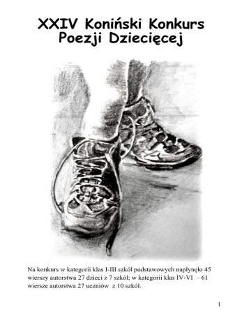 XXIV Koniński Konkurs Poezji Dziecięcej Na konkurs w kategorii klas I-III szkół podstawowych napłynęło 45 wierszy autorstwa 27 dzieci z 7 szkół; w kategorii klas IV-VI – 61 wiersze autorstwa 27 uczniów z 10 szkół. 1 *** Siedzę zamknięta w swoim pokoju, mama obiad gotuje w kuchni. Patrzę bez sensu w okno, za oknem zimno, szaro, ponuro. Czasem zbłąkany ptaszek usiądzie sobie gdzieś na suchej gałęzi pustego drzewa, które wiosną znów pięknie się zazieleni. Zaczyna padać śnieg. Piękne, duże, puszyste płatki lecą z błękitnego nieba. Szybko pokrywają wszystko dookoła. Spod samochodu czmychnął rudy kot, ptaszek odfrunął. Myślę - gdzie schowają się zwierzęta w lesie? Jak im pomóc? Jaki zbudować im dom? Jagoda Jaszczak Klasa II Szkoła Podstawowa nr 9 w Koninie Nagroda 2 Nocne podróże Miś zasypiał po kąpieli na mięciutkiej swej pościeli, gdy zza starej dużej szafy głośny słychać śmiech żyrafy. Z półki na dół zeskakuje lew, co na nic nie poluje. Małpy, słoń i koń z karocy wszyscy ożywają w nocy. I siadają na dywanie, by rozpocząć nim latanie. Podróż ta jest pośród gwiazd, w niej upływa szybko czas. Kiedy zabrzmi dźwięk budzika czas podróży nagle znika. Miś się chowa już pod koc, dziś na szczęście też jest noc. Mikołaj Błaszczak Klasa III Szkoła Podstawowa nr 3 w Koninie Nagroda 3 Jasny świat Woda błyszczy jak Srebrny Kryształ gwiazdy złocą nocną kurtynę nieba księżyc niczym lampa oświetla drogi ludziom a z okien domów światło do nas mruga rankiem wschodzące słońce krańce ziemi opromienia pięknie jest wokół rozmawiam z bliskimi i wesoło się bawię Oliwia Kornowicz Klasa III Szkota Podstawowa w Złotkowie Wyróżnienie 4 Wszechświat Miliard gwiazd na niebie, patrzy wciąż na Ciebie. Gdzieś wysoko nad chmurami, jest nasz księżyc z planetami. To skaliste, to gazowe, karłowate, kolorowe Wciąż wirują wokół Słońca, pewnie mogą tak bez końca. Wszystkie tańczą w jedną stronę, na orbitach położone Jest też galaktyka nasza, Droga Mleczna - co łuną okrasza. A cóż błyska tam w oddali? To warkocz komety się pali! Oto Wszechświat nasz wspaniały, przed piętnastoma miliardami lat powstały! Michał Janiak Klasa I Szkota Podstawowa nr 15 w Koninie Wyróżnienie 5 Nasza szkoła W naszej szkole takie rzeczy: Jaś się śmieje, Kasia beczy. Krysia z Antkiem grają w berka, Ania właśnie je cukierka. Ela tańczy, Basia śpiewa, A tuż obok Bartek ziewa. Chyba w nocy nie spał wcale I wygląda dość niedbale. Stasiek wyjął z worka piłkę, Choć zupełnie przez pomyłkę, Bo w tym worku szukał bułki, Zawiniętej w dwie bibułki. Za to znalazł coś innego, coś zupełnie przedziwnego: Dwa patyki, kłębek sznurka Garść korali i figurka. Skąd to wszystko się tu wzięło? Chyba gdzieś mi worek wcięło. To nie moje rzeczy wcale Na co by mi te korale? Te patyki, kłębek sznurka? Przecież to jest worek Jurka! Nagle dzwonek słyszą dzieci Wnet korytarz pustką świeci. Wszyscy zgodnie w ławkach siedzą Jak być grzecznym dobrze wiedzą. Natalia Domska Klasa II Szkoła Podstawowa nr 9 w Koninie Wyróżnienie 6 Szczeniaczek Ja jestem mały szczeniak I idę sobie w dal I nie wiem dokąd pójdę Czy ktoś mi powie z was. I nagle, co się stało Ktoś podszedł do mnie blisko Powiedział ciepłym głosem „O jakie biedne psisko” No i ten miły człowiek Do domu zabrał mnie I przykrył ciepłym kocem Jak dobrze mi tu jest. Areta Pawlicka Klasa II Szkoła Podstawowa nr 3 w Koninie Wyróżnienie 7 Najjaśniejsza gwiazda Przekomarzały się dwie gwiazdy na niebie: - Ja jestem jaśniejsza, piękniejsza od ciebie! - Ja mocniej się błyszczę! - Ja jestem ładniejsza! - Ja się bardziej mienię! - Ja jestem szczuplejsza! I tak noc się przechwalały, innym spać nie dały. Nawet księżycowi wybierać kazały. Lecz wstający ranek był już kłótni końcem, zbledły wszystkie gwiazdy, wstało piękne słońce. Najjaśniejszą gwiazdą w tym całym wszechświecie jest złociste słońce. Lecz to już wiecie. Zuzanna Stolecka Klasa VI Szkoła Podstawowa w Anielewie Nagroda 8 Żeglarz – mróweczka Gdzieś w podwórkowej kałuży po deszczu i lekkiej burzy buja się z kory łódeczka a na niej żeglarz - mróweczka. Śpiewając piosenki wesołe sterując nietypowym kołem płynie swą lekką łódką raz szybciutko, raz wolniutko. Jak się jest żeglarzem - mrówką umie się pływać żaglówką i nie straszne są kałuże nawet gdy morze duże. Wiaterek w żagiel czerwony z liścia leszczyny zrobiony dmie, a nasz żeglarz maleńki wciąż śpiewa swoje piosenki. Zuzanna Stolecka Klasa VI Szkoła Podstawowa w Anielewie Nagroda 9 Cień – dobrocień Dzisiaj miałam dziwny dzień! Chodził za mną jakiś Cień! Miałam właśnie pisać test Patrzę, a Cień przy mnie jest! Bierze piórko w rączkę z mgiełki i zakreśla mi literki! A co ważne niesłychanie znał odpowiedź na pytanie! Co ja teraz powiem Pani?! Test rozwiązał mi Marsjanin? Może to „Dobrocień" przy mnie stał? Tak! To on - wiarę w siebie dziś mi dał! Dominika Stępniak Klasa V Szkoła Podstawowa w Koszutach Nagroda 10 Muzyczne zapomnienie Na białym fortepianie rzucona bezmyślnie kartka i jakiś motyw zalega w myślach, urwane zdanie, muzyczne zapomnienie Rozcięty palec o krawędź klawisza rozpoczętej melodii przed laty, w niewygranym sensie rezonuje jeszcze harmonią tonów rozbitych w szklance herbaty Kropelkami wrażenia zroszona klawiatura wygięta brzmieniem rzuca po chorym dźwięku w tonalne wyrobisko, przy starej strunie mgła tęsknot zaśpiewa cichutkie requiem, zapłacze i spłynie gdzieś między klawisze, fortepian zamilknie, to wszystko... Szymon Trzos Klasa VI Szkoła Podstawowa nr 3 w Koninie Nagroda 11 Zagubiony przyjaciel Jak wielu z Was w domu mam psa, cała rodzina o niego dba. Jest z nami zawsze i wszędzie, jak go zabraknie, nie wiem, co będzie. Moja następna pasja to ko