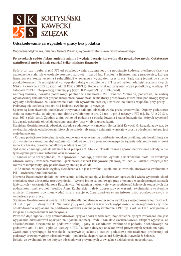 Odszkodowanie za wypadek w pracy bez podatku Magdalena Majkowska, Dziennik Gazeta Prawna, wypowiedź Stanisława Gordziałkowskiego Po wyrokach sądów fiskus zmienia zdanie i wydaje decyzje korzystne dla poszkodowanych. Ostateczne wątpliwości może jednak rozwiać tylko minister finansów Spór o to, czy trzeba płacić PIT od odszkodowania otrzymanego na podstawie kodeksu cywilnego (k.c.) za uszkodzenie ciała lub wywołanie rozstroju zdrowia, trwa od lat. Problem z fiskusem mają pracownicy, którym firma zwraca koszty leczenia i rehabilitacji w związku z wypadkiem przy pracy. Sądy stają jednak po stronie poszkodowanych. Przedsiębiorstwo wygrało batalię o zwolnienie z PIT przed sądem administracyjnym (wyrok NSA z 7 czerwca 2013 r., sygn. akt II FSK 2008/11). Rację musiał mu przyznać organ podatkowy, wydając 12 listopada 2013 r. interpretację zmieniającą (sygn. ILPB2/415-930/10/13-S/WM). Andrzej Pośniak, doradca podatkowy, partner w kancelarii CMS Cameron McKenna, podkreśla, że rodzaj wykonywanej działalności gospodarczej może powodować, iż niektórzy pracodawcy muszą brać pod uwagę ryzyko wypłaty odszkodowań za uszkodzenie ciała lub wywołanie rozstroju zdrowia na skutek wypadku przy pracy. – Podstawą ich ustalenia jest art. 444 kodeksu cywilnego – precyzuje. Sporne są konsekwencje podatkowe otrzymania takiego odszkodowania przez pracownika. Organy podatkowe stoją na stanowisku, że nie jest ono objęte zwolnieniem z art. 21 ust. 1 pkt 3 ustawy o PIT (t.j. Dz. U. z 2013 r. poz. 361 z późn. zm.). Zgodnie z nim wolne od podatku są odszkodowania i zadośćuczynienia, których wysokość lub zasady ustalania określają odrębne przepisy (ustaw lub rozporządzeń). Stanisław Gordziałkowski, adwokat, doradca podatkowy w kancelarii Sołtysiński Kawecki & Szlęzak, zauważa, że wykładnia pojęcia odszkodowań, których wysokość lub zasady ustalania wynikają wprost z odrębnych ustaw, jest niejednoznaczna. – Organy podatkowe twierdzą, że odszkodowania wypłacane na podstawie kodeksu cywilnego nie kwalifi kują się do zwolnienia z uwagi na zbyt ogólnie sformułowane prawo poszkodowanego do żądania odszkodowania – mówi Anna Kucharska, doradca podatkowy w Mazars Audyt. Sąd mówi co innego Jednak zdaniem NSA przepis art. 444 k.c. określa zakres i sposób naprawienia szkody, a nie tylko ogólne przesłanki ustalenia odszkodowania. – Stanowi on w szczególności, że naprawieniu podlegają wszelkie wynikłe z uszkodzenia ciała lub rozstroju zdrowia koszty – zaznacza Marzena Rączkiewicz, ekspert księgowości płacowej w Roedl & Partner. Precyzuje też zakres rekompensaty, gdy poszkodowany stał się inwalidą. – NSA uznał, że wysokość wypłaty świadczenia nie jest dowolna i spełnione są warunki stosowania zwolnienia z PIT – stwierdza Anna Kucharska. Marzena Rączkiewicz dodaje, że orzeczenia sądów zapadają w konkretnych sprawach i wiążą wyłącznie skład orzekający oraz adresatów rozstrzygnięcia. – Wyroki brane są pod uwagę przy orzekaniu w analogicznych stanach faktycznych – wskazuje Marzena Rączkiewicz. Jej zdaniem możemy się więc spodziewać kolejnych korzystnych dla podatników rozstrzygnięć. Według Anny Kucharskiej należy doprecyzować warunki zwolnienia, ewentualnie minister finansów powinien wydać interpretację ogólną, zważywszy na interes osób poszkodowanych w wypadkach przy pracy. Stanisław Gordziałkowski uważa, że korzystne dla podatników orzeczenia wynikają z niejednoznacznej treści art. 21 ust. 1 pkt 3 ustawy o PIT. Nie rozwiązują one jednak wszystkich wątpliwości, w szczególności czy inne odszkodowania wypłacane na podstawie kodeksu cywilnego są zwolnione z PIT, np. z art. 471 k.c. otrzymane w związku z niewykonaniem zobowiązania. Pewność daje ugoda – Aby zminimalizować ryzyko sporu z fiskusem, najbezpieczniejszym rozwiązaniem jest wypłacanie odszkodowań opartych na ugodzie sądowej – radzi Stanisław Gordziałkowski. Ekspert wyjaśnia, że odszkodowania otrzymane na podstawie takiej ugody są zasadniczo zwolnione z podatku dochodowego na podstawie art. 21 ust. 1 pkt 3b ustawy o PIT. To samo dotyczy odszkodowań przyznanych wyrokiem sądu. – Zwolnienie przysługuje do wysokości rzeczywistej szkody i ustawa podatkowa nie uzależnia preferencji od podstawy prawnej wypłaty odszkodowania – podkreśla ekspert kancelarii Sołtysiński Kawecki & Szlęzak. Dodaje, że zwolnienie to nie dotyczy odszkodowań przyznanych w związku z działalnością gospodarczą.