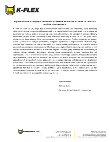 Ogólne informacje dotyczące stosowania materiałów akustycznych K-Fonik K Fonik GK i STGK na podłożach budowlanych. K-Fonik GK oraz ST GK, mogą być z powodzeniem zastosowane jako materiały, które podnoszą izolacyjność akustyczną przegród budowlanych – w szczególności ścian działowych oraz stropów. W zależności od rodzaju podłoża stosuje się różne techniki montażu. Do istniejących istniejąc przegród (ściany murowane, stropy, sucha zabudowa) należy montować materiały K-Fonik K Fonik GK i ST GK przy użyciu elastycznego, budowlanego kleju montażowego na bazie cementu. Podłoże powinno być czyste, suche i pozbawione luźnych elementów, wstępnie wyrównane wyrównane i zagruntowane. Warstwa kleju powinna być nakładana w równej warstwie przy użyciu packi grzebieniastej na obydwie klejone powierzchnie, następnie warstwa gumy K-Fonik K Fonik powinna być dokładnie dociśnięta do podłoża w taki sposób aby nie zamykać powietrza w warstwie klejonej. Arkusze gumy powinny być montowane jak najbliżej siebie, najlepiej doczołowo. Miejsca styku sąsiadujących arkuszy powinny być jak najmniejsze i zawsze wypełnione warstwą kleju, silikonu lub innego szczeliwa. Miejsca styku można także pokrywać rywać taśmą, tak aby zapewnić jak najlepszą szczelność i ciągłość warstwy izolacyjnej. W uzasadnionych przypadkach można opcjonalnie stosować pomocniczo kołki talerzykowe z trzpieniem wykonanym z tworzywa sztucznego lub listwy podłużne. Ilość kołków na m2 powinna być ograniczona do niezbędnego minimum, ponieważ każdy otwór będzie obniżał izolacyjność akustyczną warstwy. Zasadniczo ten typ mocowania należy traktować jako dodatkowy, a nie podstawowy. Do tak przymocowanych powłok K-Fonik Fonik GK, po ich związaniu z podłożem można przyklejać inne materiały K-Fonik np.: 160, 240 - stosując klej systemowy: K-414 K Z poważaniem Tomasz Kulik Dyrektor ds. technicznych i marketingu K-FLEX Polska Sp. z o.o. K-FLEX Polska Sp. z o.o. ul. Pucka 112, 81-154 Gdynia tel: +48 63 288 02 00 fax: +48 63 288 02 36 www.k-flex.pl email: [email protected] Numer NIP: 958-15-06-813 Numer KRS: 0000117734 Sąd Rejonowy Gdańsk Północ w Gdańsku VIII Wydział Krajowego Rejestru Sądowego Kapitał zakładowy w wysokości 22.137.000,00 PLN