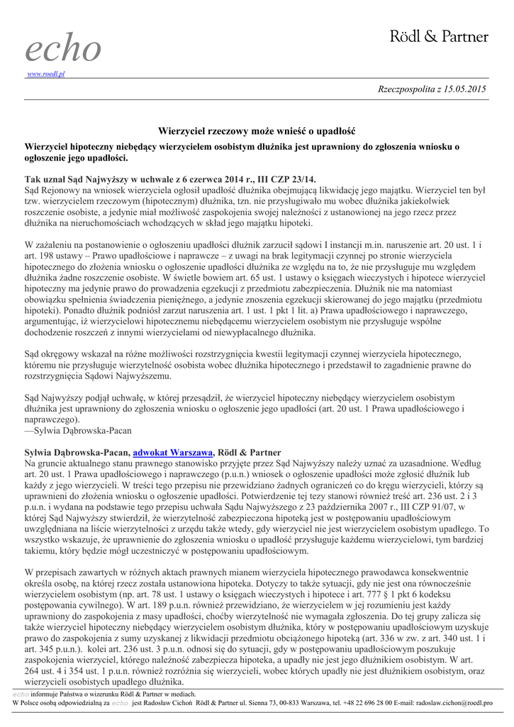 echo www.roedl.pl Rzeczpospolita z 15.05.2015 Wierzyciel rzeczowy może wnieść o upadłość Wierzyciel hipoteczny niebędący wierzycielem osobistym dłużnika jest uprawniony do zgłoszenia wniosku o ogłoszenie jego upadłości. Tak uznał Sąd Najwyższy w uchwale z 6 czerwca 2014 r., III CZP 23/14. Sąd Rejonowy na wniosek wierzyciela ogłosił upadłość dłużnika obejmującą likwidację jego majątku. Wierzyciel ten był tzw. wierzycielem rzeczowym (hipotecznym) dłużnika, tzn. nie przysługiwało mu wobec dłużnika jakiekolwiek roszczenie osobiste, a jedynie miał możliwość zaspokojenia swojej należności z ustanowionej na jego rzecz przez dłużnika na nieruchomościach wchodzących w skład jego majątku hipoteki. W zażaleniu na postanowienie o ogłoszeniu upadłości dłużnik zarzucił sądowi I instancji m.in. naruszenie art. 20 ust. 1 i art. 198 ustawy – Prawo upadłościowe i naprawcze – z uwagi na brak legitymacji czynnej po stronie wierzyciela hipotecznego do złożenia wniosku o ogłoszenie upadłości dłużnika ze względu na to, że nie przysługuje mu względem dłużnika żadne roszczenie osobiste. W świetle bowiem art. 65 ust. 1 ustawy o księgach wieczystych i hipotece wierzyciel hipoteczny ma jedynie prawo do prowadzenia egzekucji z przedmiotu zabezpieczenia. Dłużnik nie ma natomiast obowiązku spełnienia świadczenia pieniężnego, a jedynie znoszenia egzekucji skierowanej do jego majątku (przedmiotu hipoteki). Ponadto dłużnik podniósł zarzut naruszenia art. 1 ust. 1 pkt 1 lit. a) Prawa upadłościowego i naprawczego, argumentując, iż wierzycielowi hipotecznemu niebędącemu wierzycielem osobistym nie przysługuje wspólne dochodzenie roszczeń z innymi wierzycielami od niewypłacalnego dłużnika. Sąd okręgowy wskazał na różne możliwości rozstrzygnięcia kwestii legitymacji czynnej wierzyciela hipotecznego, któremu nie przysługuje wierzytelność osobista wobec dłużnika hipotecznego i przedstawił to zagadnienie prawne do rozstrzygnięcia Sądowi Najwyższemu. Sąd Najwyższy podjął uchwałę, w której przesądził, że wierzyciel hipoteczny niebędący wierzycielem osobistym dłużnika jest uprawniony do zgłoszenia wniosku o ogłoszenie jego upadłości (art. 20 ust. 1 Prawa upadłościowego i naprawczego). —Sylwia Dąbrowska-Pacan Sylwia Dąbrowska-Pacan, adwokat Warszawa, Rödl & Partner Na gruncie aktualnego stanu prawnego stanowisko przyjęte przez Sąd Najwyższy należy uznać za uzasadnione. Według art. 20 ust. 1 Prawa upadłościowego i naprawczego (p.u.n.) wniosek o ogłoszenie upadłości może zgłosić dłużnik lub każdy z jego wierzycieli. W treści tego przepisu nie przewidziano żadnych ograniczeń co do kręgu wierzycieli, którzy są uprawnieni do złożenia wniosku o ogłoszenie upadłości. Potwierdzenie tej tezy stanowi również treść art. 236 ust. 2 i 3 p.u.n. i wydana na podstawie tego przepisu uchwała Sądu Najwyższego z 23 października 2007 r., III CZP 91/07, w której Sąd Najwyższy stwierdził, że wierzytelność zabezpieczona hipoteką jest w postępowaniu upadłościowym uwzględniana na liście wierzytelności z urzędu także wtedy, gdy wierzyciel nie jest wierzycielem osobistym upadłego. To wszystko wskazuje, że uprawnienie do zgłoszenia wniosku o upadłość przysługuje każdemu wierzycielowi, tym bardziej takiemu, który będzie mógł uczestniczyć w postępowaniu upadłościowym. W przepisach zawartych w różnych aktach prawnych mianem wierzyciela hipotecznego prawodawca konsekwentnie określa osobę, na której rzecz została ustanowiona hipoteka. Dotyczy to także sytuacji, gdy nie jest ona równocześnie wierzycielem osobistym (np. art. 78 ust. 1 ustawy o księgach wieczystych i hipotece i art. 777 § 1 pkt 6 kodeksu postępowania cywilnego). W art. 189 p.u.n. również przewidziano, że wierzycielem w jej rozumieniu jest każdy uprawniony do zaspokojenia z masy upadłości, choćby wierzytelność nie wymagała zgłoszenia. Do tej grupy zalicza się także wierzyciel hipoteczny niebędący wierzycielem osobistym dłużnika, który w postępowaniu upadłościowym uzyskuje prawo do zaspokojenia z sumy uzyskanej z likwidacji przedmiotu obciążonego hipoteką (art. 336 w zw. z art. 340 ust. 1 i art. 345 p.u.n.). kolei art. 236 ust. 3 p.u.n. odnosi się do sytuacji, gdy w postępowaniu upadłościowym poszukuje zaspokojenia wierzyciel, którego należność zabezpiecza hipoteka, a upadły nie jest jego dłużnikiem osobistym. W art. 264 ust. 4 i 354 ust. 1 p.u.n. również rozróżnia się wierzycieli, wobec których upadły nie jest dłużnikiem osobistym, oraz wierzycieli osobistych upadłego dłużnika. echo informuje Państwa o wizerunku Rödl & Partner w mediach. W Polsce osobą odpowiedzialną za echo jest Radosław Cichoń Rödl & Partner ul. Sienna 73, 00-833 Warszawa, tel. +48 22 696 28 00 E-mail: [email protected] Za potwierdzeniem tezy wyrażonej w komentowanej uchwale Sądu Najwyższego przemawiają również regulacje prawne, w których uprawnienie osoby niebędącej wierzycielem osobistym do zaspokojenia z przedmiotu, na którym jest ustanowiona hipoteka, łączy się z pojęciem wierzytelności. W myśl art. 236 ust. 2 p.u.n. prawa wynikające z tego tytułu powinny zostać umieszczone na liście wierzytelności. Należy uznać, że wierzyciel hipoteczny niebędący wierzycielem osobistym powinien mieć możliwość wyboru postępowania upadłościowego albo postępowania egzekucyjnego jako właściwej drogi zaspokojenia swoich roszczeń. O wyborze przez wierzyciela hipotecznego postępowania mającego na celu przymusowe zaspokojenie przysługującego mu roszczenia mogą decydować różne względy. Wskazuje na to również art. 236 ust. 3 p.u.n., zgodnie z którym wierzytelność zabezpieczona hipoteką na rzeczach wchodzących w skład masy upadłości, jeżeli upadły nie jest dłużnikiem osobistym, podlega uwzględnieniu na liście wierzytelnośc