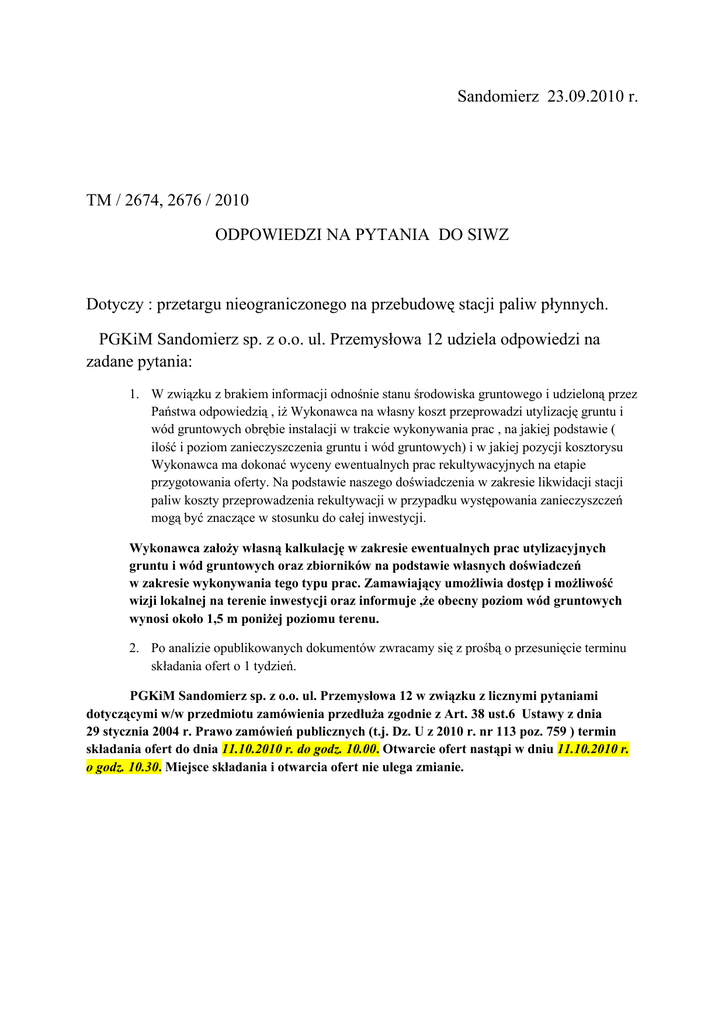 Sandomierz 23.09.2010 r. TM / 2674, 2676 / 2010 ODPOWIEDZI NA PYTANIA DO SIWZ Dotyczy : przetargu nieograniczonego na przebudowę stacji paliw płynnych. PGKiM Sandomierz sp. z o.o. ul. Przemysłowa 12 udziela odpowiedzi na zadane pytania: 1. W związku z brakiem informacji odnośnie stanu środowiska gruntowego i udzieloną przez Państwa odpowiedzią , iż Wykonawca na własny koszt przeprowadzi utylizację gruntu i wód gruntowych obrębie instalacji w trakcie wykonywania prac , na jakiej podstawie ( ilość i poziom zanieczyszczenia gruntu i wód gruntowych) i w jakiej pozycji kosztorysu Wykonawca ma dokonać wyceny ewentualnych prac rekultywacyjnych na etapie przygotowania oferty. Na podstawie naszego doświadczenia w zakresie likwidacji stacji paliw koszty przeprowadzenia rekultywacji w przypadku występowania zanieczyszczeń mogą być znaczące w stosunku do całej inwestycji. Wykonawca założy własną kalkulację w zakresie ewentualnych prac utylizacyjnych gruntu i wód gruntowych oraz zbiorników na podstawie własnych doświadczeń w zakresie wykonywania tego typu prac. Zamawiający umożliwia dostęp i możliwość wizji lokalnej na terenie inwestycji oraz informuje ,że obecny poziom wód gruntowych wynosi około 1,5 m poniżej poziomu terenu. 2. Po analizie opublikowanych dokumentów zwracamy się z prośbą o przesunięcie terminu składania ofert o 1 tydzień. PGKiM Sandomierz sp. z o.o. ul. Przemysłowa 12 w związku z licznymi pytaniami dotyczącymi w/w przedmiotu zamówienia przedłuża zgodnie z Art. 38 ust.6 Ustawy z dnia 29 stycznia 2004 r. Prawo zamówień publicznych (t.j. Dz. U z 2010 r. nr 113 poz. 759 ) termin składania ofert do dnia 11.10.2010 r. do godz. 10.00. Otwarcie ofert nastąpi w dniu 11.10.2010 r. o godz. 10.30. Miejsce składania i otwarcia ofert nie ulega zmianie.