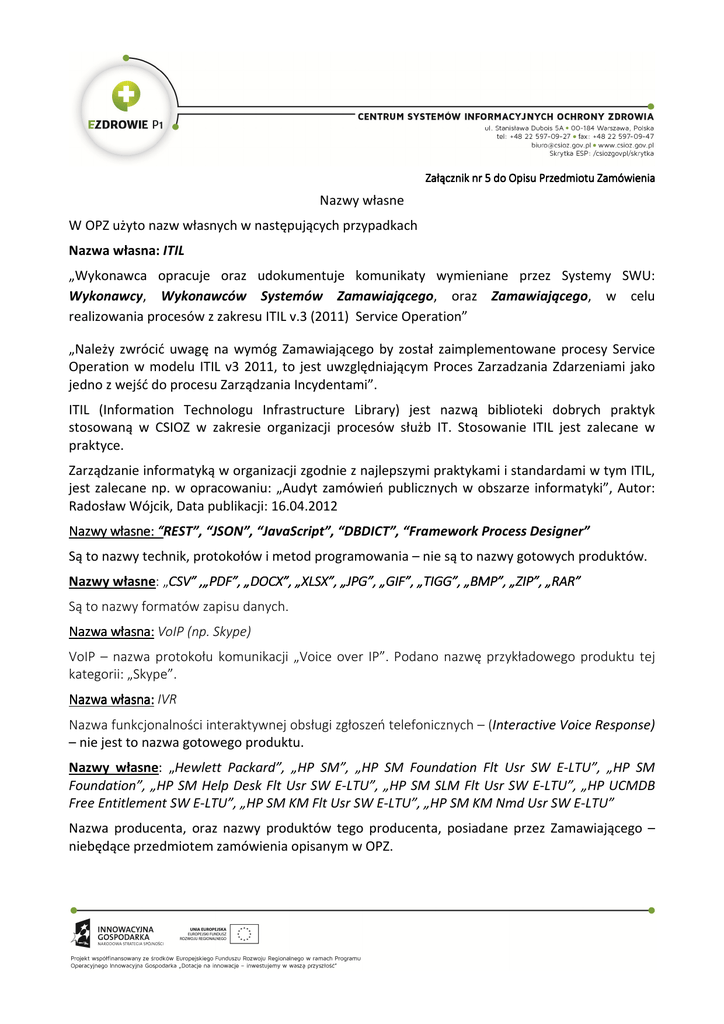 Załącznik nr 5 do Opisu Przedmiotu Zamówienia Nazwy własne W OPZ użyto nazw własnych w następujących przypadkach Nazwa własna: ITIL „Wykonawca opracuje oraz udokumentuje komunikaty wymieniane przez Systemy SWU: Wykonawcy, Wykonawców Systemów Zamawiającego, oraz Zamawiającego, w celu realizowania procesów z zakresu ITIL v.3 (2011) Service Operation” „Należy zwrócić uwagę na wymóg Zamawiającego by został zaimplementowane procesy Service Operation w modelu ITIL v3 2011, to jest uwzględniającym Proces Zarzadzania Zdarzeniami jako jedno z wejść do procesu Zarządzania Incydentami”. ITIL (Information Technologu Infrastructure Library) jest nazwą biblioteki dobrych praktyk stosowaną w CSIOZ w zakresie organizacji procesów służb IT. Stosowanie ITIL jest zalecane w praktyce. Zarządzanie informatyką w organizacji zgodnie z najlepszymi praktykami i standardami w tym ITIL, jest zalecane np. w opracowaniu: „Audyt zamówień publicznych w obszarze informatyki”, Autor: Radosław Wójcik, Data publikacji: 16.04.2012 Nazwy własne: “REST”, “JSON”, “JavaScript”, “DBDICT”, “Framework Process Designer” Są to nazwy technik, protokołów i metod programowania – nie są to nazwy gotowych produktów. Nazwy własne: „CSV” CSV” ,„PDF”, „DOCX”, „XLSX”, „JPG”, „GIF”, „TIGG”, „BMP”, „ZIP”, „RAR” Są to nazwy formatów zapisu danych. Nazwa własna: VoIP (np. Skype) VoIP – nazwa protokołu komunikacji „Voice over IP”. Podano nazwę przykładowego produktu tej kategorii: „Skype”. Nazwa własna: IVR Nazwa funkcjonalności interaktywnej obsługi zgłoszeń telefonicznych – (Interactive Voice Response) – nie jest to nazwa gotowego produktu. Nazwy własne: „Hewlett Packard”, „HP SM”, „HP SM Foundation Flt Usr SW E-LTU”, „HP SM Foundation”, „HP SM Help Desk Flt Usr SW E-LTU”, „HP SM SLM Flt Usr SW E-LTU”, „HP UCMDB Free Entitlement SW E-LTU”, „HP SM KM Flt Usr SW E-LTU”, „HP SM KM Nmd Usr SW E-LTU” Nazwa producenta, oraz nazwy produktów tego producenta, posiadane przez Zamawiającego – niebędące przedmiotem zamówienia opisanym w OPZ.