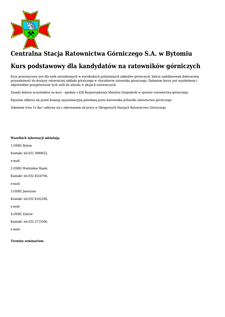 Centralna Stacja Ratownictwa Górniczego S.A. w Bytomiu Kurs podstawowy dla kandydatów na ratowników górniczych Kurs przeznaczony jest dla osób zatrudnionych w wyrobiskach podziemnych zakładów górniczych, którzy zadeklarowali dobrowolną przynależność do drużyny ratowniczej zakładu górniczego w charakterze ratownika górniczego. Zadaniem kursu jest wyszkolenie i odpowiednie przygotowanie tych osób do udziału w akcjach ratowniczych. Zasady doboru uczestników na kurs - zgodnie z §28 Rozporządzenia Ministra Gospodarki w sprawie ratownictwa górniczego. Egzamin odbywa się przed komisją egzaminacyjną powołaną przez kierownika jednostki ratownictwa górniczego. Szkolenie trwa 12 dni i odbywa się z oderwaniem od pracy w Okręgowych Stacjach Ratownictwa Górniczego. Wszelkich informacji udzielają: 1.OSRG Bytom Kontakt: tel.032 3880622, e-mail: 2.OSRG Wodzisław Śląski Kontakt: tel.032 4554706, e-mail: 3.OSRG Jaworzno Kontakt: tel.032 6162286, e-mail: 4.OSRG Zabrze Kontakt: tel.032 2713506, e-mail: Terminy seminarium