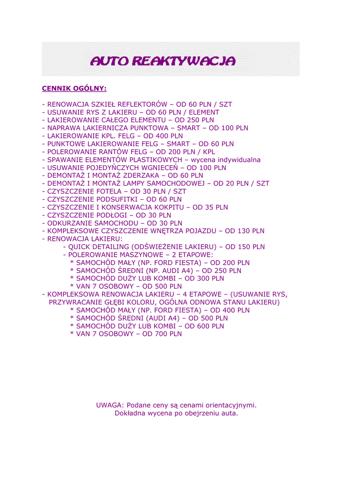 CENNIK OGÓLNY: - RENOWACJA SZKIEŁ REFLEKTORÓW – OD 60 PLN / SZT USUWANIE RYS Z LAKIERU – OD 60 PLN / ELEMENT LAKIEROWANIE CAŁEGO ELEMENTU – OD 250 PLN NAPRAWA LAKIERNICZA PUNKTOWA – SMART – OD 100 PLN LAKIEROWANIE KPL. FELG – OD 400 PLN PUNKTOWE LAKIEROWANIE FELG – SMART – OD 60 PLN POLEROWANIE RANTÓW FELG – OD 200 PLN / KPL SPAWANIE ELEMENTÓW PLASTIKOWYCH – wycena indywidualna USUWANIE POJEDYŃCZYCH WGNIECEŃ – OD 100 PLN DEMONTAŻ I MONTAŻ ZDERZAKA – OD 60 PLN DEMONTAŻ I MONTAŻ LAMPY SAMOCHODOWEJ – OD 20 PLN / SZT CZYSZCZENIE FOTELA – OD 30 PLN / SZT CZYSZCZENIE PODSUFITKI – OD 60 PLN CZYSZCZENIE I KONSERWACJA KOKPITU – OD 35 PLN CZYSZCZENIE PODŁOGI – OD 30 PLN ODKURZANIE SAMOCHODU – OD 30 PLN KOMPLEKSOWE CZYSZCZENIE WNĘTRZA POJAZDU – OD 130 PLN RENOWACJA LAKIERU: - QUICK DETAILING (ODŚWIEŻENIE LAKIERU) – OD 150 PLN - POLEROWANIE MASZYNOWE – 2 ETAPOWE: * SAMOCHÓD MAŁY (NP. FORD FIESTA) – OD 200 PLN * SAMOCHÓD ŚREDNI (NP. AUDI A4) – OD 250 PLN * SAMOCHÓD DUŻY LUB KOMBI – OD 300 PLN * VAN 7 OSOBOWY – OD 500 PLN - KOMPLEKSOWA RENOWACJA LAKIERU – 4 ETAPOWE – (USUWANIE RYS, PRZYWRACANIE GŁĘBI KOLORU, OGÓLNA ODNOWA STANU LAKIERU) * SAMOCHÓD MAŁY (NP. FORD FIESTA) – OD 400 PLN * SAMOCHÓD ŚREDNI (AUDI A4) – OD 500 PLN * SAMOCHÓD DUŻY LUB KOMBI – OD 600 PLN * VAN 7 OSOBOWY – OD 700 PLN UWAGA: Podane ceny są cenami orientacyjnymi. Dokładna wycena po obejrzeniu auta.