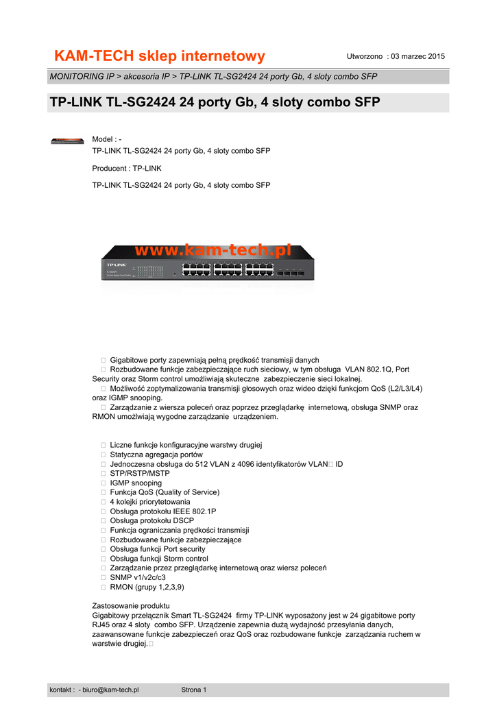 KAM-TECH sklep internetowy Utworzono : 03 marzec 2015 MONITORING IP > akcesoria IP > TP-LINK TL-SG2424 24 porty Gb, 4 sloty combo SFP TP-LINK TL-SG2424 24 porty Gb, 4 sloty combo SFP Model : TP-LINK TL-SG2424 24 porty Gb, 4 sloty combo SFP Producent : TP-LINK TP-LINK TL-SG2424 24 porty Gb, 4 sloty combo SFP � Gigabitowe porty zapewniają pełną prędkość transmisji danych � Rozbudowane funkcje zabezpieczające ruch sieciowy, w tym obsługa VLAN 802.1Q, Port Security oraz Storm control umożliwiają skuteczne zabezpieczenie sieci lokalnej. � Możliwość zoptymalizowania transmisji głosowych oraz wideo dzięki funkcjom QoS (L2/L3/L4) oraz IGMP snooping. � Zarządzanie z wiersza poleceń oraz poprzez przeglądarkę internetową, obsługa SNMP oraz RMON umożlwiają wygodne zarządzanie urządzeniem. � Liczne funkcje konfiguracyjne warstwy drugiej � Statyczna agregacja portów � Jednoczesna obsługa do 512 VLAN z 4096 identyfikatorów VLAN�ID � STP/RSTP/MSTP � IGMP snooping � Funkcja QoS (Quality of Service) � 4 kolejki priorytetowania � Obsługa protokołu IEEE 802.1P � Obsługa protokołu DSCP � Funkcja ograniczania prędkości transmisji � Rozbudowane funkcje zabezpieczające � Obsługa funkcji Port security � Obsługa funkcji Storm control � Zarządzanie przez przeglądarkę internetową oraz wiersz poleceń � SNMP v1/v2c/c3 � RMON (grupy 1,2,3,9) Zastosowanie produktu Gigabitowy przełącznik Smart TL-SG2424 firmy TP-LINK wyposażony jest w 24 gigabitowe porty RJ45 oraz 4 sloty combo SFP. Urządzenie zapewnia dużą wydajność przesyłania danych, zaawansowane funkcje zabezpieczeń oraz QoS oraz rozbudowane funkcje zarządzania ruchem w warstwie drugiej.� kontakt : - [email protected] Strona 1 KAM-TECH sklep internetowy Utworzono : 03 marzec 2015 MONITORING IP > akcesoria IP > TP-LINK TL-SG2424 24 porty Gb, 4 sloty combo SFP TP-LINK TL-SG2424 24 porty Gb, 4 sloty combo SFP Przełącznik TL-SG2424 jest ekonomicznym rozwiązaniem przeznaczonym dla małych i średnich firm. Posiada użyteczne funkcje zabezpieczające. Funkcja Storm control chroni przed występowaniem zjawiska burzy rozgłoszeniowej pakietów Broadcast, Multicast oraz Unicast. Funkcja QoS (Quality of Service) dla warstw 2 do 4 zapewnia rozszerzone możliwości optymalizowania transmisji danych. Ponadto możliwość łatwego zarządzania poprzez przeglądarkę internetową, wiersz poleceń, oraz obsługa protokołów SNMP i RMON umożliwia szybką konfigurację i ograniczenie przestojów. Przełącznik TL-SG2424 stanowi idealne rozwiązanie dla grup roboczych i działów poszukujących ekonomicznych, szybkich przełączników brzegowych. Zaawansowane funkcje QoS Aby umożliwić jednoczesne płynne transmisje danych, głosowe oraz wideo, przełącznik wyposażony jest w rozbudowane funkcje QoS. W celu zapewnienia płynności przesyłania danych administrator może ustalić priorytety transmisji danych w oparciu o priorytet portów, protokoły 802.1P oraz DSCP.� Liczne funkcje konfiguracyjne warstwy drugiej W celu zwiekszenia ilości możliwych zastosowań przełączniki TL-SG2424 wyposażone są w szereg funkcji zarządzania ruchem w warstwie drugiej, obejmujący obsługę VLAN 802.1Q, izolację portów, mirroring portów, STP/RSTP/MSTP, agregację portów oraz funkcję kontroli przepływu 802.3x. Dodatkowo wyposażony jest w liczne funkcje konserwacyjne, takie jak wykrywanie połączeń loop back, diagnostyka kabli oraz IGMP snooping. Funkcja IGMP snooping umożliwia inteligentne przesyłanie transmisji strumieniowych multicast tylko do określonych subskrybentów, a funkcje IGMP throttling oraz IGMP filtering skutecznie ograniczają dostęp do transmisji multicast dla niepowołanych użytkowników.� Rozbudowane możliwości zarządzania urządzeniem Przełącznik TL-SG2424 jest urządzeniem łatwym w użytkowaniu i zarządzaniu. Oferuje wiele przyjaznych dla użytkownika możliwosci zarzadzania, takich jak intuicyjny graficzny interfejs użytkownika (GUI) obsługiwany poprzez przeglądarkę internetową oraz interfejs wiersza poleceń (CLI). Obsługa protokołów SNMP (v1/2/3) oraz RMON umożliwiają urządzeniu wysyłanie komunikatów o nieprzewidzianych zdarzeniach oraz monitoring statusu urządzenia. � CECHY SPRZĘTOWE Standardy i protokoły IEEE 802.3i, IEEE 802.3u, IEEE 802.3ab, IEEE802.3z, IEEE 802.3x, IEEE 802.1d, IEEE 802.1s, IEEE 802.1w, IEEE 802.1q, IEEE 802.1p Porty 24 porty RJ45 10/100/1000Mb/s (Auto negocjacja/Auto MDI/MDIX) 4 sloty combo SFP 100/1000Mb/s Okablowanie sieciowe 10BASE-T: Kabel UTP kat. 3, 4 lub 5 (do 100m) 100BASE-TX/1000Base-T: Kabel UTP kat. 5, 5e, lub wyższej (do 100m) 100BASE-FX:MMF,SMF kontakt : - [email protected] Strona 2 KAM-TECH sklep internetowy Utworzono : 03 marzec 2015 MONITORING IP > akcesoria IP > TP-LINK TL-SG2424 24 porty Gb, 4 sloty combo SFP TP-LINK TL-SG2424 24 porty Gb, 4 sloty combo SFP 1000BASE-X: MMF, SMF Bezwentylatorowy Bezwentylatorowy Wymiary (SxGxW) 440*180*44 mm (17.3*7.1*1.7 cala) Pobór prądu Maximum: 22.3W (220V/50Hz) Zasilanie 100~240VAC, 50/60Hz WYDAJNOŚĆ Przepustowość 48Gb/s Tablica adresów MAC 8192 Szybkość przekierowań pakietów 35.7 Mp/s Ramka Jumbo 10240 Bajtów FUNKCJE OPROGRAMOWNIA Funkcja Quality of Service Obsługa priorytetowania 802.1p CoS/DSCP kontakt : - [email protected] Strona 3 KAM-TECH sklep internetowy Utworzono : 03 marzec 2015 MONITORING IP > akcesoria IP > TP-LINK TL-SG2424 24 porty Gb, 4 sloty combo SFP TP-LINK TL-SG2424 24 porty Gb, 4 sloty combo SFP Obsługa 4 kolejek priorytetowania Harmonogram kolejek: SP, WRR, SP+WRR Ograniczanie prędkości transferu w oparciu o port/przepływ danych Cechy przełącznika warstwy 2 IGMP Snooping V1/V2/V3 Agregacja portów(Do 6 grup agregacji obejmujących do 4 portów każda) STP/RSTP/MSTP Filtrowanie/ochrona BPDU Ochrona TC/Root Wykrywanie połączeń loopback Kontrola przepływu 802.3x Sieci VLAN Obsługa protokołu IEEE802.1Q, jednocz