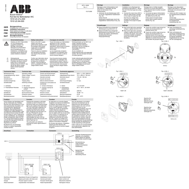 15.07.2008 ® Busch-Infoline Ruf-Set für Behinderten WC 1510 UC-21x-500 1510 UC-84-500 Pos: 1 /35x28/35 Mehrsprachig/Art und Sprache der Doku/Montageanleitung/Montageanleitung ger-eng-fre-dut @ 0\mod123_1.doc @ 1103 GER Montageanleitung ENG Installation Instructions FRE Instructions de montage DUT Montagehandleiding Sorgfältig lesen und aufbewahren Read carefully and keep in a safe place Montage Installation Montage Montage Montage in einer Unterputzdose nach DIN 049073-1. Befestigen Sie das Gerät mit Schrauben in der Unterputzdose. ● Verbinden Sie die Netzleitungen (230 V) mit den mitgelieferten Kabelbindern (Fig. 2b). Führen Sie die Niederspannungsleitungen durch den mitgelieferten Isolierschlauch (Fig. 2a). Installation is in a flush-type box according to DIN 049073-1. Mount the unit in the flush-type box using screws. ● Connect the mains lines (230 V) with the cable binders included in the scope of supply (fig. 2b). Push the low-voltage lines through the insulating tube included in the scope of supply (fig. 2a). Montage dans un boîtier encastré conforme à la norme DIN 049073-1. Fixez l'appareil dans le boîtier encastré à l'aide de vis. ● Connectez les lignes d'alimentation électrique (230 V) aux connecteurs de câbles fournis (Fig. 2b). Faites passer les lignes basse tension dans la gaine isolante fournie (Fig. 2a). Montage in een inbouwdoos volgens DIN 049073-1. Bevestig het toestel met schroeven in de inbouwdoos. ● Verbind de 230 V draden met de meegeleverde bundelband (fig. 2b). Leid de lage zwakstroombedrading door de meegeleverde isolatieslang (fig. 2a). Einstellungen Settings Réglage Instellingen A Rotes Kontrolllicht bei anliegender A Red control light when operating A Voyant de contrôle rouge lorsqu'une A Rode controlelamp bij Betriebsspannung (Klemme 3; 4). voltage is applied (terminal 3/4). B Rotes Kontrolllicht bei anliegender B Red control light when operating Betriebsspannung (Klemme 3; 4) und Drücken des Signal-/ Abstelltasters (Auslöseerkennung bei Rufgruppenbildung). Les lire attentivement et les respecter Zorgvuldig doorlezen en bewaren voltage is applied (terminal 3/4) and when the signal / stop button is pressed (release recognition during call number group formation). Pos: 2 /35x28/35 Mehrsprachig/Sicherheitshinweise/Sicherheitshinweise 230V/Sicherheitshinweise 230V ger-eng-fre-dut @ 0\mod15_1.doc @ 923 Safety instructions Consignes de sécurité Veiligheidsinstructies Work on the 230 V supply system may only be performed by specialist staff! De-energize mains power supply prior to installation and/or disassembly! Failure to observe installation and operating instructions may result in fire and other hazards! Toute intervention sur l'alimentation électrique en 230 V doit être effectuée par des techniciens spécialisés ! Déconnecter la tension secteur avant tout montage et démontage! Le non-respect des consignes d'installation et d'utilisation peut entraîner un incendie ou être la source d'autres dangers ! Werkzaamheden op het 230 V net mogen uitsluitend worden doorgevoerd door bekwaam personeel! Vóór de montage en demontage netspanning uitschakelen! Als de installatie- en bedieningsinstructies niet opgevolgd worden, dan kan dit leiden tot brand of andere gevaren! Further user information about Busch-Infoline® products can be taken from the BuschInfoline® Technical Manual which is available from BuschJaeger Elektro GmbH. Vous trouverez de plus amples informations sur l'utilisation des produits Busch-Infoline® dans le manuel technique Busch-Infoline® que vous pouvez vous procurer auprès de Busch-Jaeger Elektro GmbH. Verder reikende gebruikersinformatie m.b.t. de producten van de BuschInfoline® kunt u in de technische handleiding Busch-Infoline® vinden. Deze is verkrijgbaar bij de BuschJaeger Elektro GmbH. Fig. 1; Afb. 1 B Voyant de contrôle rouge lorsqu'une a Technical data Caractéristiques techniques Technische gegevens Operating voltage: Output voltage / current : Rated current: Loop current: Tripping delay : Switching contacts Werkspanning: Uitgangsspanning/-stroom: Nominale stroom: Lusstroom: Activeringsvertraging: Schakelcontacten 230 V ~ ± 10%, 50/60 Hz 15 V~ (SELV) / 150 mA~ 110 mA~ / 60 mA5 mA 0,1 sec. ● Schließer: ● Potentialfreier Wechsler: ● NO contact: ● Floating changeover contact: Sound frequency: Sound pressure level: Protective system: Operating temperature: Tension de fonctionnement: Tension/intensité de sartie: Intensité nominale: Courant de boucle: Délai de déclenchement: Contacts de commutation de commande ● Contact à fermeture: ● Inverseur exempt de potentiel: Fréquence vocale: Pression sonore: Classe de protection: Température de fonctionnement: ● Sluiter: ● Potentiaalvrij wisselcontact: Geluidsfrequentie: Geluidsdruk: Beschermingsklasse: Bedrijfstemperatuur: 1 A, 30 VA/W 40 V~ / 60 V-, 30 VA/W Tonfrequenz: Schalldruck: Schutzklasse: Betriebstemperatur: Function Fonction Functie Pressing the emergency call button activates an alarm in the form of a permanent beep and a flashing signal light on the outside of the toilet room. The LED (relief light) integrated into the button indicates to the person needing help that her/his call has been recognized and that help is on the way. Pressing the cancel pushbutton which is preferably installed next to the WC door acknowledges the alarm and the relief light as well as the acoustic and optical signal go out. The call system can easily be extended by further signal buttons if required. En appuyant sur la touche d'appel d'urgence une alarme est déclenchée à l'extérieur des toilettes sous la forme d'un signal sonore permanente et d'un voyant clignotant. La DEL intégrée au clavier de signalisation (voyant d'alarme) indique à la personne ayant déclenché l'alarme que son appel a été reçu et que l'aide est en chemin. En appuyant sur le bouton d'arrêt qui est installé de préférence à proximité de la porte des WC, l'alarme est ar