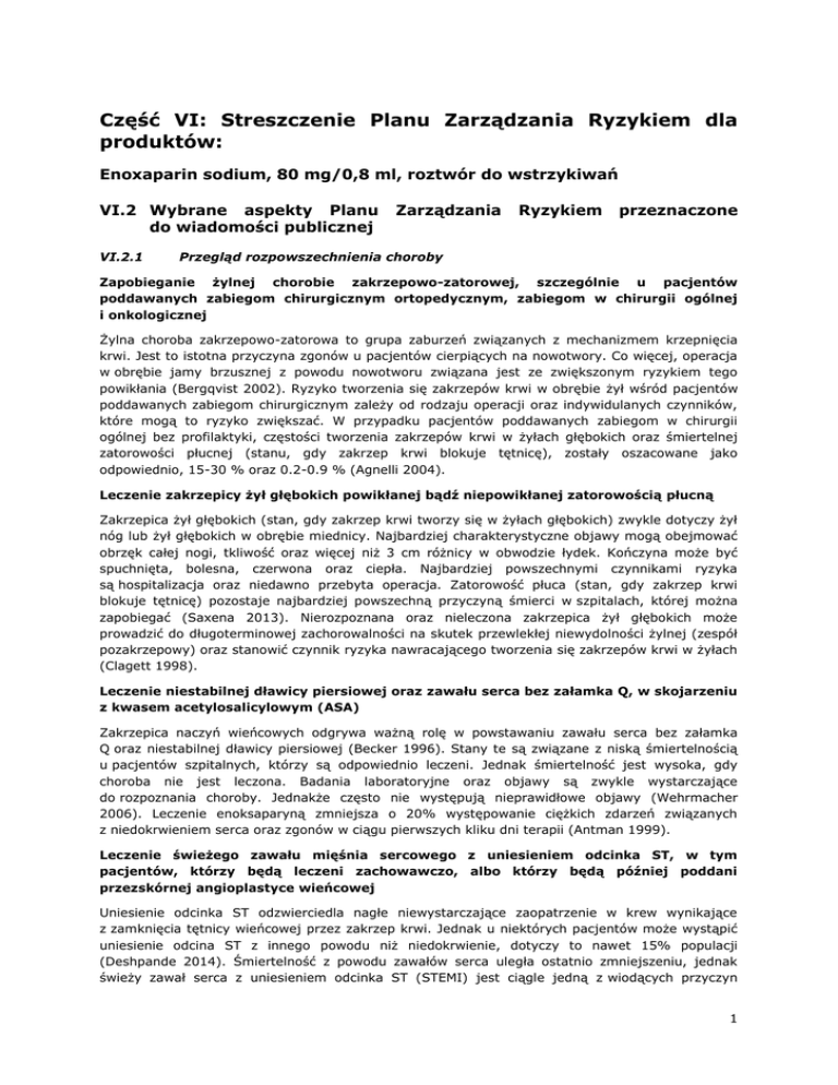 Część VI: Streszczenie Planu Zarządzania Ryzykiem dla produktów: Enoxaparin sodium, 80 mg/0,8 ml, roztwór do wstrzykiwań VI.2 Wybrane aspekty Planu do wiadomości publicznej VI.2.1 Zarządzania Ryzykiem przeznaczone Przegląd rozpowszechnienia choroby Zapobieganie żylnej chorobie zakrzepowo-zatorowej, szczególnie u pacjentów poddawanych zabiegom chirurgicznym ortopedycznym, zabiegom w chirurgii ogólnej i onkologicznej Żylna choroba zakrzepowo-zatorowa to grupa zaburzeń związanych z mechanizmem krzepnięcia krwi. Jest to istotna przyczyna zgonów u pacjentów cierpiących na nowotwory. Co więcej, operacja w obrębie jamy brzusznej z powodu nowotworu związana jest ze zwiększonym ryzykiem tego powikłania (Bergqvist 2002). Ryzyko tworzenia się zakrzepów krwi w obrębie żył wśród pacjentów poddawanych zabiegom chirurgicznym zależy od rodzaju operacji oraz indywidulanych czynników, które mogą to ryzyko zwiększać. W przypadku pacjentów poddawanych zabiegom w chirurgii ogólnej bez profilaktyki, częstości tworzenia zakrzepów krwi w żyłach głębokich oraz śmiertelnej zatorowości płucnej (stanu, gdy zakrzep krwi blokuje tętnicę), zostały oszacowane jako odpowiednio, 15-30 % oraz 0.2-0.9 % (Agnelli 2004). Leczenie zakrzepicy żył głębokich powikłanej bądź niepowikłanej zatorowością płucną Zakrzepica żył głębokich (stan, gdy zakrzep krwi tworzy się w żyłach głębokich) zwykle dotyczy żył nóg lub żył głębokich w obrębie miednicy. Najbardziej charakterystyczne objawy mogą obejmować obrzęk całej nogi, tkliwość oraz więcej niż 3 cm różnicy w obwodzie łydek. Kończyna może być spuchnięta, bolesna, czerwona oraz ciepła. Najbardziej powszechnymi czynnikami ryzyka są hospitalizacja oraz niedawno przebyta operacja. Zatorowość płuca (stan, gdy zakrzep krwi blokuje tętnicę) pozostaje najbardziej powszechną przyczyną śmierci w szpitalach, której można zapobiegać (Saxena 2013). Nierozpoznana oraz nieleczona zakrzepica żył głębokich może prowadzić do długoterminowej zachorowalności na skutek przewlekłej niewydolności żylnej (zespół pozakrzepowy) oraz stanowić czynnik ryzyka nawracającego tworzenia się zakrzepów krwi w żyłach (Clagett 1998). Leczenie niestabilnej dławicy piersiowej oraz zawału serca bez załamka Q, w skojarzeniu z kwasem acetylosalicylowym (ASA) Zakrzepica naczyń wieńcowych odgrywa ważną rolę w powstawaniu zawału serca bez załamka Q oraz niestabilnej dławicy piersiowej (Becker 1996). Stany te są związane z niską śmiertelnością u pacjentów szpitalnych, którzy są odpowiednio leczeni. Jednak śmiertelność jest wysoka, gdy choroba nie jest leczona. Badania laboratoryjne oraz objawy są zwykle wystarczające do rozpoznania choroby. Jednakże często nie występują nieprawidłowe objawy (Wehrmacher 2006). Leczenie enoksaparyną zmniejsza o 20% występowanie ciężkich zdarzeń związanych z niedokrwieniem serca oraz zgonów w ciągu pierwszych kliku dni terapii (Antman 1999). Leczenie świeżego zawału mięśnia sercowego z uniesieniem odcinka ST, w tym pacjentów, którzy będą leczeni zachowawczo, albo którzy będą później poddani przezskórnej angioplastyce wieńcowej Uniesienie odcinka ST odzwierciedla nagłe niewystarczające zaopatrzenie w krew wynikające z zamknięcia tętnicy wieńcowej przez zakrzep krwi. Jednak u niektórych pacjentów może wystąpić uniesienie odcina ST z innego powodu niż niedokrwienie, dotyczy to nawet 15% populacji (Deshpande 2014). Śmiertelność z powodu zawałów serca uległa ostatnio zmniejszeniu, jednak świeży zawał serca z uniesieniem odcinka ST (STEMI) jest ciągle jedną z wiodących przyczyn 1 śmiertelności (Sadowski 2013). Częstość występowania STEMI jest inna w różnych krajach. Niektóre czynniki, takie jak zbyt późne zastosowanie leczenia, wiek, przebyte wcześniej zawały serca, rodzaj zastosowanego leczenia, niewydolność nerek, cukrzyca, liczba tętnic wieńcowych dotkniętych chorobą, leczenie oraz parametry takie jak frakcja wyrzutowa serca mogą mieć wpływ na śmiertelność z powodu STEMI (Steg 2012). Zapobieganie tworzeniu się skrzepów w krążeniu pozaustrojowym podczas hemodializy Hemodializa może być związana z ryzykiem tworzenia się skrzepów. Najważniejszymi czynnikami, które mogą spowodować tworzenie skrzepów krwi są zmiany w ścianie naczyń krwionośnych, spowolnienie przepływu krwi, zmiany we krwi oraz rodzaj sztucznych błon. Skuteczność dializy może być zaburzona przez proces krzepnięcia. Biorąc pod uwagę te informacje, leczenie przeciwzakrzepowe przy hemodializie jest kluczowe do zapobiegania procesowi krzepnięcia (Hofbauer 1999). Powikłania związane z dostępem do krwioobiegu podczas hemodializy, w tym zdarzenia zakrzepowe są przyczyną 17 – 25% hospitalizacji wśród pacjentów poddawanych dializie. Co więcej, zwiększona tendencja do tworzenia zakrzepów może skutkować śmiertelnymi powikłaniami (Smits 2000). VI.2.2 Podsumowanie korzyści wynikających z terapii Enoksaparyna jest szeroko stosowaną heparyną o niskiej masie cząsteczkowej, charakteryzującą się działaniem przeciwzakrzepowym. Stosowana jest w leczeniu oraz zapobieganiu żylnej choroby zakrzepowo-zatorowej, szczególnie u pacjentów poddawanych zabiegom chirurgicznym, leczeniu zakrzepicy żył głębokich oraz zapobieganiu krzepnięcia podczas krążenia pozaustrojowego. Jest także stosowana w celu leczenia pacjentów z niestabilną dławicą piersiową oraz zawałem serca (Martindale 2014: Enoxaparin Sodium). Terapia enoksaparyną jest korzystna dla pacjentów, gdyż zapobiega powikłaniom związanym z zaburzeniami zakrzepowo-zatorowymi poprzez zmniejszenie ryzyka zakrzepicy żył głębokich (Leclerc 1992). Zapobieganie powikłaniom zakrzepowo-zatorowym u pacjentów poddawanym różnym zabiegom w chirurgii ogólnej jest bezpieczne i skuteczne (Haas 1993). Badania wykazują 