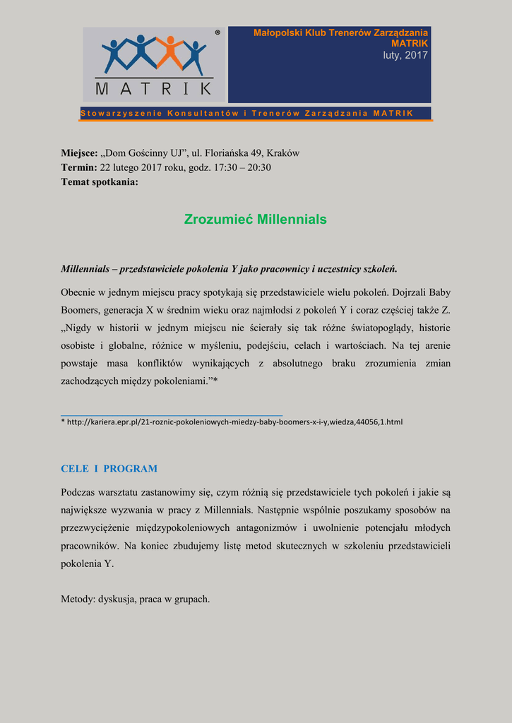 Małopolski Klub Trenerów Zarządzania MATRIK luty, 2017 Stow arz yszenie Konsultantów i Trenerów Zarządzania MATRIK Miejsce: „Dom Gościnny UJ”, ul. Floriańska 49, Kraków Termin: 22 lutego 2017 roku, godz. 17:30 – 20:30 Temat spotkania: Zrozumieć Millennials Millennials – przedstawiciele pokolenia Y jako pracownicy i uczestnicy szkoleń. Obecnie w jednym miejscu pracy spotykają się przedstawiciele wielu pokoleń. Dojrzali Baby Boomers, generacja X w średnim wieku oraz najmłodsi z pokoleń Y i coraz częściej także Z. „Nigdy w historii w jednym miejscu nie ścierały się tak różne światopoglądy, historie osobiste i globalne, różnice w myśleniu, podejściu, celach i wartościach. Na tej arenie powstaje masa konfliktów wynikających z absolutnego braku zrozumienia zmian zachodzących między pokoleniami.”* ___________________________________________ * http://kariera.epr.pl/21-roznic-pokoleniowych-miedzy-baby-boomers-x-i-y,wiedza,44056,1.html CELE I PROGRAM Podczas warsztatu zastanowimy się, czym różnią się przedstawiciele tych pokoleń i jakie są największe wyzwania w pracy z Millennials. Następnie wspólnie poszukamy sposobów na przezwyciężenie międzypokoleniowych antagonizmów i uwolnienie potencjału młodych pracowników. Na koniec zbudujemy listę metod skutecznych w szkoleniu przedstawicieli pokolenia Y. Metody: dyskusja, praca w grupach. TRENER: Magdalena PIERZCHAŁA Techniczny Trener w Brown Brothers Harriman – zajmuje się analizą potrzeb na poziomie globalnym firmy, prowadzeniem szkoleń stacjonarnych, webinariow i wideo konferencji, tworzeniem materiałów szkoleniowych oraz zarządza lokalnym zespołem trenerów. W branży funduszy inwestycyjnych pracuje od 2007 roku, od 2009 jako trener techniczny z dziedziny księgowości funduszy inwestycyjnych. Dodatkowo ma w swoim portfolio szkolenia objaśniające działanie instrumentów finansowych, mechanizmy fuzji i przejęć spółek międzynarodowych oraz arkusza kalkulacyjnego MS Excel na potrzeby księgowości inwestycyjnej. Od września 2016 prowadzi wykłady w ramach Professional Certificate in International Investment Fund Services – kwalifikacji przyznawanej przez Irish Institute of Banking. Zapraszam, Piotr Wiroński Koordynator Małopolskiego KTZM