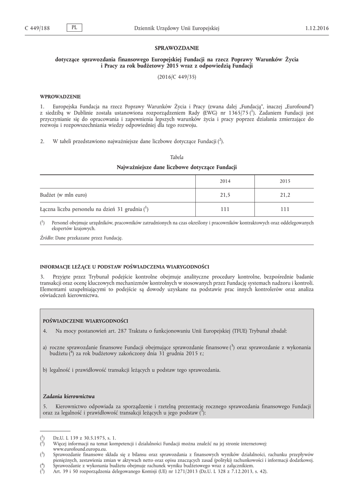 C 449/188 PL Dziennik Urzędowy Unii Europejskiej 1.12.2016 SPRAWOZDANIE dotyczące sprawozdania finansowego Europejskiej Fundacji na rzecz Poprawy Warunków Życia i Pracy za rok budżetowy 2015 wraz z odpowiedzią Fundacji (2016/C 449/35) WPROWADZENIE 1. Europejska Fundacja na rzecz Poprawy Warunków Życia i Pracy (zwana dalej „Fundacją”, inaczej „Eurofound”) z siedzibą w Dublinie została ustanowiona rozporządzeniem Rady (EWG) nr 1365/75 (1). Zadaniem Fundacji jest przyczynianie się do opracowania i zapewnienia lepszych warunków życia i pracy poprzez działania zmierzające do rozwoju i rozpowszechniania wiedzy odpowiedniej dla tego rozwoju. 2. W tabeli przedstawiono najważniejsze dane liczbowe dotyczące Fundacji (2). Tabela Najważniejsze dane liczbowe dotyczące Fundacji 2014 2015 Budżet (w mln euro) 21,5 21,2 Łączna liczba personelu na dzień 31 grudnia (1) 111 111 (1) Personel obejmuje urzędników, pracowników zatrudnionych na czas określony i pracowników kontraktowych oraz oddelegowanych ekspertów krajowych. Źródło: Dane przekazane przez Fundację. INFORMACJE LEŻĄCE U PODSTAW POŚWIADCZENIA WIARYGODNOŚCI 3. Przyjęte przez Trybunał podejście kontrolne obejmuje analityczne procedury kontrolne, bezpośrednie badanie transakcji oraz ocenę kluczowych mechanizmów kontrolnych w stosowanych przez Fundację systemach nadzoru i kontroli. Elementami uzupełniającymi to podejście są dowody uzyskane na podstawie prac innych kontrolerów oraz analiza oświadczeń kierownictwa. POŚWIADCZENIE WIARYGODNOŚCI 4. Na mocy postanowień art. 287 Traktatu o funkcjonowaniu Unii Europejskiej (TFUE) Trybunał zbadał: a) roczne sprawozdanie finansowe Fundacji obejmujące sprawozdanie finansowe (3) oraz sprawozdanie z wykonania budżetu (4) za rok budżetowy zakończony dnia 31 grudnia 2015 r.; b) legalność i prawidłowość transakcji leżących u podstaw tego sprawozdania. Zadania kierownictwa 5. Kierownictwo odpowiada za sporządzenie i rzetelną prezentację rocznego sprawozdania finansowego Fundacji oraz za legalność i prawidłowość transakcji leżących u jego podstaw (5): (1) (2) (3) (4) (5) Dz.U. L 139 z 30.5.1975, s. 1. Więcej informacji na temat kompetencji i działalności Fundacji można znaleźć na jej stronie internetowej: www.eurofound.europa.eu. Sprawozdanie finansowe składa się z bilansu oraz sprawozdania z finansowych wyników działalności, rachunku przepływów pieniężnych, zestawienia zmian w aktywach netto oraz opisu znaczących zasad (polityki) rachunkowości i informacji dodatkowej. Sprawozdanie z wykonania budżetu obejmuje rachunek wyniku budżetowego wraz z załącznikiem. Art. 39 i 50 rozporządzenia delegowanego Komisji (UE) nr 1271/2013 (Dz.U. L 328 z 7.12.2013, s. 42). 1.12.2016 PL Dziennik Urzędowy Unii Europejskiej C 449/189 a) Zadania kierownictwa w zakresie rocznego sprawozdania finansowego Fundacji obejmują: zaprojektowanie, wdrożenie i utrzymywanie systemu kontroli wewnętrznej umożliwiającego sporządzenie i rzetelną prezentację sprawozdania finansowego, które nie zawiera istotnych zniekształceń spowodowanych nadużyciem lub błędem, a także wybór i stosowanie właściwych zasad (polityki) rachunkowości na podstawie zasad rachunkowości przyjętych przez księgowego Komisji (6) oraz sporządzanie szacunków księgowych, które są racjonalne w danych okolicznościach. Dyrektor zatwierdza roczne sprawozdanie finansowe Fundacji po tym, jak zostanie ono sporządzone przez księgowego Fundacji na podstawie wszystkich dostępnych informacji. Do sprawozdania finansowego księgowy dołącza oświadczenie, w którym stwierdza między innymi, że uzyskał wystarczającą pewność, że daje ono prawdziwy i rzetelny obraz sytuacji finansowej Fundacji we wszystkich istotnych aspektach. b) Zadania kierownictwa w zakresie legalności i prawidłowości transakcji leżących u podstaw rozliczeń i zgodności z zasadą należytego zarządzania finansami obejmują zaprojektowanie, wdrożenie i utrzymywanie skutecznego i wydajnego systemu kontroli wewnętrznej, w tym właściwego nadzoru, jak również podejmowanie odpowiednich działań w celu zapobiegania nieprawidłowościom i nadużyciom finansowym oraz – w razie konieczności – podejmowanie kroków prawnych w celu odzyskania nienależnie wypłaconych lub niewłaściwie wykorzystanych środków finansowych. Zadania Trybunału 6. Zadaniem Trybunału jest przedstawienie Parlamentowi Europejskiemu i Radzie (7), na podstawie przeprowadzonej przez siebie kontroli, poświadczenia wiarygodności dotyczącego rocznego sprawozdania finansowego Fundacji oraz legalności i prawidłowości transakcji leżących u podstaw tego sprawozdania. Trybunał przeprowadza kontrolę zgodnie z wydanymi przez IFAC Międzynarodowymi Standardami Rewizji Finansowej i kodeksem etyki oraz z Międzynarodowymi Standardami Najwyższych Organów Kontroli wydanymi przez INTOSAI (ISSAI). Zgodnie z tymi standardami Trybunał zobowiązany jest zaplanować i przeprowadzić kontrolę w taki sposób, aby uzyskać wystarczającą pewność, że roczne sprawozdanie finansowe Fundacji nie zawiera istotnych zniekształceń, a leżące u jego podstaw transakcje są legalne i prawidłowe. 7. W ramach kontroli stosuje się procedury mające na celu uzyskanie dowodów kontroli potwierdzających kwoty i informacje zawarte w rocznym sprawozdaniu finansowym oraz legalność i prawidłowość transakcji leżących u jego podstaw. Dobór procedur zależy od osądu kontrolera, w tym od oceny ryzyka wystąpienia – w wyniku nadużycia lub błędu – istotnego zniekształcenia w rocznym sprawozdaniu finansowym lub istotnej niezgodności transakcji leżących u podstaw tego sprawozdania z wymogami przepisów Unii Europejskiej. W celu zaprojektowania procedur kontroli odpowiednich w danych okolicznościach kontroler, dokonując oceny ryzyka, bierze pod uwagę system kontroli wewnętrznej w zakresie dotyczącym sporząd