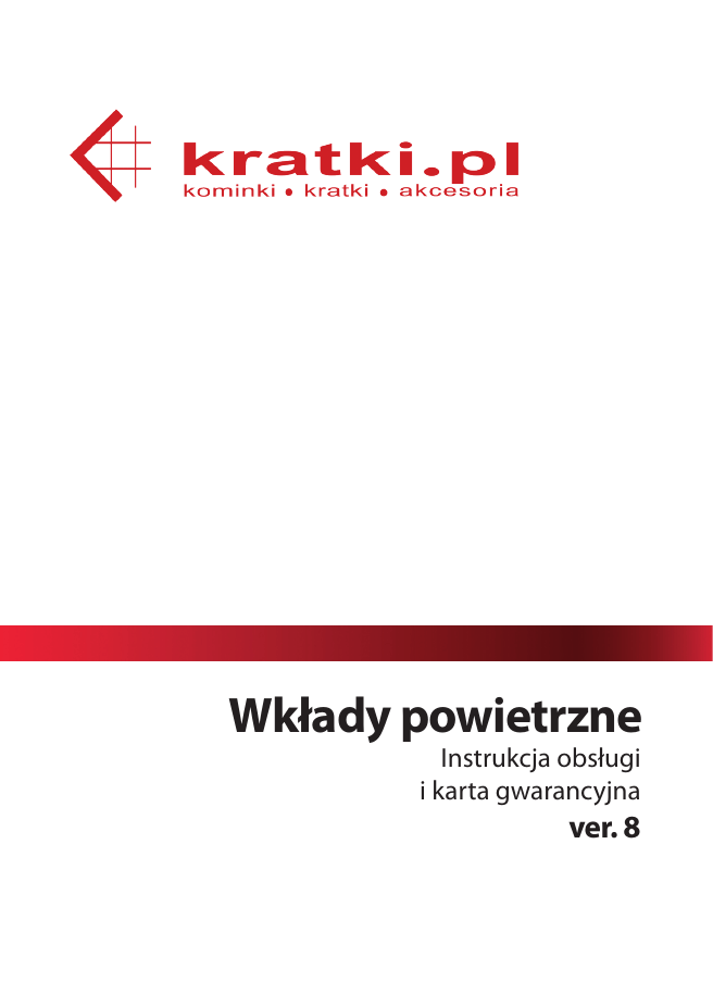 Wkłady powietrzne Instrukcja obsługi i karta gwarancyjna ver. 8 Dziękujemy Państwu za zaufanie, które okazaliście nam dokonując zakupu wkładu kominkowego produkcji firmy kratki.pl. Przed przystąpieniem do montażu i użytkowania wkładu prosimy o zapoznanie się z niniejszą instrukcją obsługi. 1. Uwagi ogólne a)Przed przystąpieniem do instalacji wkładu kominkowego należy wykonać ekspertyzę i odbiór przewodu kominowego pod kątem jego parametrów technicznych oraz stanu technicznego. b)Instalacja i uruchomienie wkładu kominkowego powinny być wykonane przez firmę instalacyjną posiadającą odpowiednie do tego celu uprawnienia i doświadczenie. c) Wkład kominkowy powinien być usytuowany jak najbliżej przewodu kominowego. Pomieszczenie, w którym będzie on zainstalowany, musi posiadać sprawny system wentylacji oraz niezbędną ilość powietrza wymaganą do prawidłowego działania wkładu. d)Przenosząc wkład kominkowy nie należy łapać za elementy szybra, gdyż grozi to uszkodzeniem jego mechanizmu. e)Przed przystąpieniem do użytkowania wkładu należy usunąć z szyby naklejki. f ) Parametry techniczne wkładu obowiązują dla paliwa określonego niniejszą instrukcją. g)Należy bezwzględnie dotrzymywać terminy przeglądów przewodów kominowych (minimum 2 razy w roku). h)W myśl obowiązującego prawa kominek nie może być jedynym źródłem ciepła, a jedynie uzupełnieniem istniejącej instalacji grzewczej. Powodem tego typu regulacji jest konieczność zapewnienia ogrzewania budynku w przypadku długotrwałej nieobecności mieszkańców. Instalację wkładu kominkowego należy przeprowadzić zgodnie z postanowieniami obowiązujących w tym zakresie norm, wymogami prawa budowlanego i obowiązującymi w tym zakresie normami pożarowymi. Szczegółowe przepisy dotyczące bezpieczeństwa konstrukcji, bezpieczeństwa pożarowego oraz bezpieczeństwa użytkowania zawiera Ustawa prawo budowlane z dnia 7 lipca 1994 roku (Dz. U. nr 156, poz. 1118 z 2006 roku, z późniejszymi zmianami), Rozporządzenie Ministra Infrastruktury z dnia 12 kwietnia 2002 roku w sprawie warunków technicznych, jakimi powinny odpowiadać budynki i ich usytuowanie (Dz. U. nr 75, poz. 690 z 2002 roku oraz Dz. U. nr 109, poz. 1156 2 z 2004 roku), Norma PN-EN 13229:2002 „Wkłady kominkowe wraz z kominkami otwartymi na paliwa stałe. Wymagania i badania.” Oraz norma PN-EN 13240:2002 „Ogrzewacze pomieszczeń na paliwa stałe. Wymagania i badania.” 2. Przeznaczenie urządzenia Wkłady kominkowe firmy kratki.pl zaliczane są do palenisk stałopalnych z ręcznym wkładem paliwa i zamykanymi drzwiczkami paleniskowymi. Przewidziane są do obudowania lub wbudowania w niszę. Przeznaczone są do spalania drewna liściastego (dopuszczalny jest również brykiet węgla brunatnego). Służą jako dodatkowe źródło ciepła w pomieszczeniach, w których są zainstalowane. Zabudowa wkładu powinna być skonstruowana w sposób, który będzie umożliwiał montaż i demontaż kominka, bez konieczności jej zniszczenia lub uszkodzenia. Ponadto powinna zapewniać dostęp powietrza potrzebnego do spalania i do wentylacji, poprzez zastosowanie w niej kratek kominkowych (po obu stronach kominka, w dolnej części zabudowy) oraz kratki wylotowej większych rozmiarów (na górze obudowy), a także stały dostęp do obsługi przepustnicy spalin lub regulatora ciągu kominowego (szyber). 3. Opis urządzenia Wszystkie żeliwne oraz ceramiczne części składowe wkładów kominkowych dostępne są u producenta. 3.1. Części składowe powietrznego wkładu kominkowego wykonanego z żeliwa Elementy żeliwne: • Kaptur • Podstawa • Płyta tylna (ewentualnie futryna tylna i futryna tylna wewnętrzna) • Płyta boczna (ewentualnie futryna/okno boczne) • Futryna przednia • Drzwi przednie • Ruszt kominka • Osłona popielnika • Deflektor spalin • Płotek • Wylot spalin • Przysłona komina 3 Uwaga: Wkłady kominkowe: Antek, Eryk, Wiktor, Felix, Mila, Ala, Blanka, Blanka 910, posiadają w standardzie deflektor wykonany z wermikulitu. Elementy nie odlewane: • Elementy złączeniowe • Sznury uszczelniające • Żaroodporna ceramika szklana • Szuflada popielnika • Mechanizm sterowania przysłoną komina • Klamki/gałki • Kierownica powietrza Uwaga: ruszt powinien być ułożony użebrowaniem do góry. Uwaga: wkłady kominkowe Mila, Blanka, Blanka 910, są wykonane ze stali, nie zawierają elementów żeliwnych, wkłady kominkowe Natala, Maja wieża, Zuzia z wermikulitem są wykonane z żeliwa oraz stali kotłowej. 3.2. Części składowe powietrznego wkładu kominkowego wykonanego ze stali; Stalowy wkład kominkowy wykonany jest ze stali kotłowej grubości 4 mm. Wykonanie kominka nie pozwala na samodzielne montowanie którejkolwiek ze stalowych części kominka. Wymianie mogą podlegać: • Sznury uszczelniające • Szyba żaroodporna • Szuflada popielnika (jeżeli wkład takową posiada) • Klamki/gałki • Formatki wermikulitowe 4 5 Podstawowe dane techniczne: Powietrzne ANTEK MAJA ERYK WIKTOR ZUZIA FELIX OLIWIA AMELIA ANTEK/ LUX MAJA/ LUX ERYK/ LUX WIKTOR/ LUX ZUZIA/LUX ZUZIA/700 FELIX/ LUX OLIWIA/ LUX AMELIA/ LUX Moc nominalna (kW) 10 12 12 14 16 16 18 25 Średnica czopucha (mm) 180 200 200 200 200 200 200 200 Sprawność cieplna (%) ~ 62 71 70 70 70 73 79 71 0,61% 0,65% 0,61% 0,61% 0,48% 0,61% 0,15% 0,78% Emisja pyłków C (PYŁ)* 99,7 89,7 99,7 99,7 82 99,7 31 80,6 Temperatura spalin (C°) 352 330 352 352 301 352 406,9 308 Waga (kg) 94 115 104 110 149 125 162 205 80-100 90-120 100-130 120-140 120-160 140-160 150-180 200-250 330 330 330 450 500 450 500 500 Emisja CO (przy 13% O2) ≤ Powierzchnia grzewcza (m2)** Długość polan (mm) Rodzaj paliwa Materiał wykonania żeliwo szare sezonowane drewno liściaste, (wilgotność max 20%), brykiet węgla brunatnego + stal kotłowa wyłożenie komory spalania - wermikulit wyłożenie komory spalania - thermotte * ** mg/mn3 w 