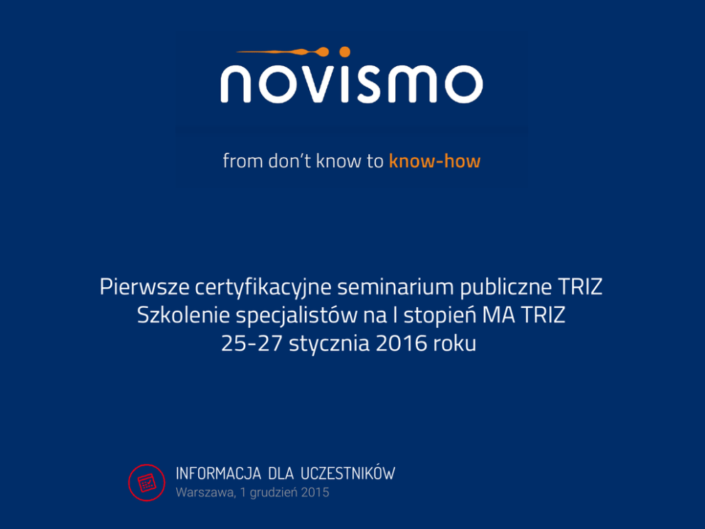 Pierwsze certyfikacyjne seminarium publiczne TRIZ Szkolenie specjalistów na I stopień MA TRIZ 25-27 stycznia 2016 roku INFORMACJA DLA UCZESTNIKÓW Warszawa, 1 grudzień 2015 - kim jesteśmy? NOVISMO to kilkunastoosobowy, zintegrowany zespół z dużym doświadczeniem, rzadkich umiejętnościach i wysokiej sprawności działania w niszowym obszarze. Każdego dnia poddawani w swojej pracy intelektualnym wyzwaniom, specjalizujemy się w rozwiązywaniu najtrudniejszych zadań innowacyjnych – tworzeniu innowacji. NOVISMO, Zespół należy do Rady Programowej Fundacja TRIZ Polska (http://triz.org.pl), a ta jest częścią Międzynarodowej Asocjacji TRIZ MA TRIZ (http://matriz.org) Na świecie jest 17 000 certyfikowanych przez MA TRIZ specjalistów MA TRIZ w Polsce - Fundacja TRIZ-Polska to polska organizacja, której misją jest zwiększanie innowacyjności polskiej gospodarki poprzez propagowanie TRIZ. Grupa NOVISMO zrzesza jej członków, i obecna jest na rynku polskim pracując już ponad 18 miesięcy. Powstała z inicjatywy firm Aerfortis i Hive oraz osób zaangażowanych w szerzenie idei TRIZ (Teoria Rozwiązywania Innowacyjnych Zadań). 2z9 - czym się zajmujemy propagowanie metodologii TRIZ i innowacyjności w Polsce szkolenia z dbałością o jakość nauczania TRIZ w Polsce wsparcie w uzyskaniu certyfikatów specjalistów MA TRIZ tłumaczenie i publikacja literatury TRIZ wdrożenia TRIZ w zakładach przemysłowych, instytucjach i na uczelniach konsulting w zakresie m.in.: redukcja kosztów oraz usprawnienia produktów i procesów rozwój nowych produktów, procesów i START-UP’ów prognozowanie rozwoju produktu i technologii tworzenie strategii dla własności intelektualnej ocena i weryfikacji technologii, innowacyjnego przedsięwzięcia poszukiwanie odpowiedniej technologii opracowania innowacyjnej strategii produktu analityczny przegląd rynku 3z9 Szkolenie specjalistów na I stopień MA TRIZ ORGANIZATOR WYDARZENIA WYKŁADOWCA Grupa NOVISMO Master TRIZ, Prezydent MA TRIZ, Profesor MIT Sergei Ikovenko JĘZYK j. angielski z symultanicznym tłumaczeniem na j. polski DLA KOGO? W wieku 25+, szukających nowatorskich rozwiązań, zorientowanych na rezultaty, innowacyjnych w działaniu. TERMIN 25 - 27.01.2016 (3 dni, łącznie 24 godziny zajęć) MIEJSCE Warszawa LICZBA UCZESTNIKÓW 100 osób LICZBA SPONSORÓW Do 10 (partnerzy i organizacje około-rządowe) REJESTRACJA www.novismo.com 4z9 Szkolenie specjalistów na I stopień MA TRIZ - profil uczestników DEMOGRAFICZNY PSYCHOGRAFICZNY Średnia wieku: 25 - 45 lat Ciągle podnoszący kwalifikacje Największe ośrodki technologiczne, rozwojowe i naukowe Innowacyjni Wynagrodzenie wyższe (mediana+) Czynni specjaliści R&D, dyrektorzy techniczni, kierownicy produkcji Aktywni w rozwiązywaniu problemów Otwarci na nowości 5z 9 Szkolenie specjalistów na I stopień MA TRIZ - profil uczestników Podnieść poziom innowacyjności polskiej gospodarki Zwiększyć jakość i ilość polskich patentów Upowszechnienie wiedzy i najlepszych praktyk z wykorzystaniem nowoczesnych narzędzi TRIZ w kreatywnej pracy Budować więź społeczną wśród uczestników – networking 6z9 Szkolenie specjalistów na I stopień MA TRIZ - profil uczestników Nasi Słuchacze mogą liczyć na szereg związanych z tym korzyści, a przede wszystkim na: Podniesienie statusu organizacji jako wspierającej profesjonalne, innowacyjne rozwiązania. Wprowadzenie do organizacji wiedzy o ciągłym podnoszeniu kwalifikacji w zakresie zwiększania kreatywności rozwiązywania problemów. Nawiązanie długoterminowej współpracy z organizacjami zajmującymi się TRIZ jako nowoczesnym partnerem 7z9 Co oferujemy PAKIETY DLA UCZESTNIKÓW Ceny podane w poniższej tabeli są cenami netto i należy do nich doliczyć podatek VAT w aktualnie obowiązującej stawce. Do 20 grudnia 2015 obowiązują ceny “Erly Birds” obniżone o 10%. Ceny na pierwsze Seminarium są objęte promocją. Ceny kolejnych seminarium mogą ulec zmianie. 8z9 Pierwsze certyfikacyjne seminarium publiczne TRIZ Szkolenie specjalistów na I stopień MA TRIZ 25-27 stycznia 2016 roku OFERTA SZKOLENIA Warszawa, 1 grudzień 2015