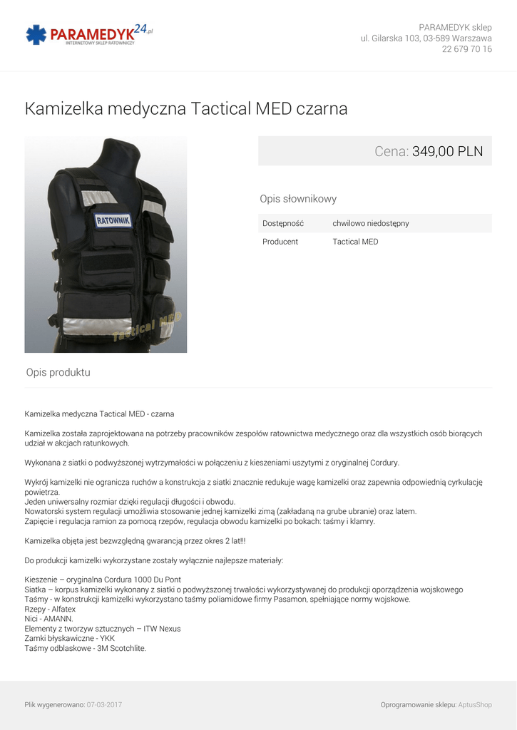 PARAMEDYK sklep ul. Gilarska 103, 03-589 Warszawa 22 679 70 16 Kamizelka medyczna Tactical MED czarna Cena: 349,00 PLN Opis słownikowy Dostępność chwilowo niedostępny Producent Tactical MED Opis produktu Kamizelka medyczna Tactical MED - czarna Kamizelka została zaprojektowana na potrzeby pracowników zespołów ratownictwa medycznego oraz dla wszystkich osób biorących udział w akcjach ratunkowych. Wykonana z siatki o podwyższonej wytrzymałości w połączeniu z kieszeniami uszytymi z oryginalnej Cordury. Wykrój kamizelki nie ogranicza ruchów a konstrukcja z siatki znacznie redukuje wagę kamizelki oraz zapewnia odpowiednią cyrkulację powietrza. Jeden uniwersalny rozmiar dzięki regulacji długości i obwodu. Nowatorski system regulacji umożliwia stosowanie jednej kamizelki zimą (zakładaną na grube ubranie) oraz latem. Zapięcie i regulacja ramion za pomocą rzepów, regulacja obwodu kamizelki po bokach: taśmy i klamry. Kamizelka objęta jest bezwzględną gwarancją przez okres 2 lat!!! Do produkcji kamizelki wykorzystane zostały wyłącznie najlepsze materiały: Kieszenie – oryginalna Cordura 1000 Du Pont Siatka – korpus kamizelki wykonany z siatki o podwyższonej trwałości wykorzystywanej do produkcji oporządzenia wojskowego Taśmy - w konstrukcji kamizelki wykorzystano taśmy poliamidowe firmy Pasamon, spełniające normy wojskowe. Rzepy - Alfatex Nici - AMANN. Elementy z tworzyw sztucznych – ITW Nexus Zamki błyskawiczne - YKK Taśmy odblaskowe - 3M Scotchlite. Plik wygenerowano: 07-03-2017 Oprogramowanie sklepu: AptusShop PARAMEDYK sklep ul. Gilarska 103, 03-589 Warszawa 22 679 70 16 Kamizelka objęta jest bezwzględną gwarancją przez okres 2 lat - przez ten czas usuniemy wszelkie usterki lub awarie kamizelki. Uwaga! Cena kamizelki nie obejmuje emblematów. Można je zakupić oddzielnie. Galeria Plik wygenerowano: 07-03-2017 Powered by TCPDF (www.tcpdf.org) Oprogramowanie sklepu: AptusShop