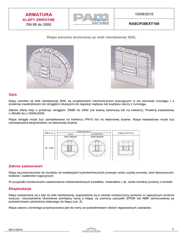 ARMATURA 10/08/2015 KLAPY ZWROTNE DN 80 do 2000 RASCP28EXT100 Klapa zwrotna (końcowa) ze stali nierdzewnej 304L Opis Klapy zwrotne ze stali nierdzewnej 304L są urządzeniami mechanicznymi pracującymi w osi pionowej rurociągu ( o przekroju kwadratowym lub okrągłym) służącymi do regulacji napływu lub wypływu cieczy z rurociągu. Zakres oferty klap o przekroju okrągłym: DN80 do 2000 (na ścianę betonową lub na kołnierz), Przekrój kwadratowy L=80x80 do L=2000x2000. Klapa okrągła może być zainstalowana na kołnierzu PN10 lub na betonowej ścianie. Klapa kwadratowa może być zainstalowana bezpośrednio na betonowej ścianie. Zakres zastosowań Klapy są przeznaczone do montażu na instalacjach hydrotechnicznych przesyłu wody czystej surowej, wód deszczowych, ścieków i systemów irygacyjnych. W przypadku konieczności zastosowania niestandardowych kształtów, materiałów ( np. woda morska) prosimy o kontakt. Eksploatacja Klapy wytwarzane są z płyt ze stali nierdzewnej, wyposażone są w zawias umieszczony poziomo w najwyższym punkcie korpusu. Uszczelnienie obwodowe pomiędzy ramą a klapą: za pomocą uszczelki EPDM lub NBR zamocowanej za pośrednictwem pierścienia stalowego do klapy (rys. 2). Klapa zaworu zwrotnego przymocowana jest do ramy za pośrednictwem dwóch regulowanych zawiasów. 09/11/2015 1 09/11/2015 ARMATURA 10/08/2015 KLAPY ZWROTNE DN 80 do 2000 RASCP28EXT100 2 ARMATURA 10/08/2015 KLAPY ZWROTNE DN 80 do 2000 RASCP28EXT100 Wymiary i masy Klapa zwrotna okrągła (instalacja na ścianę betonową) DN ØD ØK Ød N A B C J R Masa mm mm mm mm mm mm mm mm mm mm kg Referencje 80 200 160 10 4 128 170 - - 195 7,5 232179 100 220 180 10 4 128 170 - - 215 8,5 232181 150 285 240 10 4 128 208 - - 260 15,0 232182 200 340 295 10 4 128 208 - - 325 20,0 232183 250 395 350 10 6 128 208 - - 355 26,0 232184 300 445 400 10 6 128 208 - - 405 32,0 232187 350 505 460 10 6 128 208 - - 470 38,0 232188 400 565 515 10 6 128 228 50 - 510 46,0 232190 450 615 565 12 8 128 228 50 - 570 62,0 232192 500 670 620 12 8 128 228 50 - 610 74,0 232193 600 780 725 12 8 128 228 50 20 725 84,0 232195 700 895 840 12 8 128 228 50 20 815 106,0 232198 800 1015 950 12 8 128 228 80 20 920 124,0 232200 900 1115 1050 14 12 128 248 80 20 1035 155,0 232203 1000 1230 1160 14 12 128 248 80 20 1125 185,0 232238 1100 1340 1270 14 12 128 248 80 20 1230 225,0 232255 1200 1455 1380 14 12 128 248 100 20 1320 255,0 232767 1300 1565 1485 14 16 148 268 100 20 1445 267,0 232875 1400 1675 1590 14 16 148 268 100 20 1550 297,0 232922 1500 1785 1695 14 16 148 268 120 20 1645 327,0 232923 1600 1915 1820 14 20 148 288 120 20 1750 360,0 232925 1800 2115 2020 14 20 148 288 120 20 1960 429,0 232927 2000 2325 2230 14 20 148 308 120 20 2145 505,0 232929 (*) Referencje zawierają niezbędne śruby. Przeciwwaga nie jest wliczona w cenę. 09/11/2015 3 ARMATURA 10/08/2015 KLAPY ZWROTNE DN 80 do 2000 RASCP28EXT100 Klapa zwrotna okrągła PN10 montaż na kołnierz DN ØD ØK mm mm mm 80 200 160 100 220 150 285 200 250 N A B C J R Masa mm mm mm mm mm mm kg M10x55 4 128 170 - 20 195 8,0 236139 180 M10x55 8 128 170 - 20 220 9,0 236140 240 M10x60 8 128 208 - 22 260 16,0 236151 340 295 M10x60 8 128 208 - 24 325 21,0 236152 395 350 M12x70 12 128 208 - 26 355 27,0 235838 300 445 400 M12x70 12 128 208 - 26 405 33,0 236154 350 505 460 M12x70 16 128 208 - 28 470 40,0 236155 400 565 515 M12x70 16 128 228 60 32 515 48,0 236156 450 615 565 M12x80 20 128 228 60 38 570 62,0 236157 500 670 620 M12x80 20 128 228 60 38 610 74,0 236158 600 780 725 M12x80 20 128 228 60 38 725 84,0 236160 700 895 840 M16x90 24 128 228 60 40 815 106,0 236161 800 1015 950 M16x90 24 145 245 80 44 920 136,0 236162 900 1115 1050 M16x90 28 145 245 80 48 1020 155,0 236163 1000 1230 1160 M16x100 28 145 245 80 50 1120 185,0 236164 1100 1340 1270 M16x100 32 145 245 80 50 1220 225,0 236142 1200 1455 1380 M16x100 32 145 245 100 52 1320 255,0 236143 1300 1565 1485 M16x100 36 145 245 100 52 1420 267,0 236144 1400 1675 1590 M16x100 36 145 245 100 52 1520 297,0 236145 1500 1785 1695 M16x100 36 165 285 120 52 1635 327,0 236146 1600 1915 1820 M18x110 40 165 285 120 52 1735 360,0 236147 1800 2115 2020 M18x110 44 165 285 120 54 1935 429,0 236148 2000 2325 2230 M18x110 48 165 285 120 58 2135 505,0 236149 Śruby Referencje (*) Referencje nie zawierają elementów połączeniowych ( Śruby nakrętki, podkładki) oraz przeciwwagi.. 09/11/2015 4 ARMATURA 10/08/2015 KLAPY ZWROTNE DN 80 do 2000 RASCP28EXT100 Klapa zwrotna kwadratowa (instalacja na ścianę betonową) (DN) LxH X/Y K Ød N A B C J R Masa mm mm mm mm mm mm mm mm mm mm kg 80x80 280x310 15 10 4 130 215 - - 230 25,0 232768 100x100 300x330 15 10 4 130 215 - - 250 30,0 232769 150x150 350x380 15 10 8 130 215 - - 300 40,0 232770 200x200 400x430 15 10 8 130 215 - - 350 45,0 232772 250x250 450x480 15 12 8 130 215 - - 400 50,0 232773 300x300 500x430 15 12 12 130 215 - - 450 55,0 232775 350x350 550x580 15 12 12 130 215 - - 500 60,0 232777 400x400 600x630 15 12 12 130 215 60 - 580 65,0 232778 450x450 650x680 15 12 12 130 215 60 - 630 70,0 232779 500x500 720x750 25 12 12 130 215 60 20 380 85,0 232780 600x600 820x850 25 12 14 130 215 60 20 890 105,0 232781 700x700 920x950 25 16 14 130 215 60 20 880 120,0 232782 800x800 1020/1050 25 16 14 150 215 80 20 980 135,0 232783 900x900 1120/1150 25 16 14 150 215 80 20 1080 165,0 232784 1000x1000 1220/1250 25 16 14 150 215 80 20 1180 195,0 232785 1100x1100 1320/1350 25 16 18 150 215 80 20 1280 235,0 232787 1200x1200 1420/1450 25 16 18 150 215 100 20 1380 260,0 232788 1300x1300 1520/1550 25 16 18 150 215 100 20 1480 280,0 232931 1400x1400 1620/1650 25 16 18 150 215 100 20 1580 310,0 232932 1500x1500 1720/1750 25 16 18 170 255 120 20 1700 340,0 232933 1600x1600 1820/1850 25 18 22 170 255 120 20 1800 380,0 232934 1800x1800 2020/2050 25 18 22 170 255 120 20 2000 435,0 232936 2000x2000 2220/2250 25 18 22 170 255 120 20 2200 520,0 232940 Referencje (*) Referencje zawierają niezbędne śruby. Przeciwwaga nie je