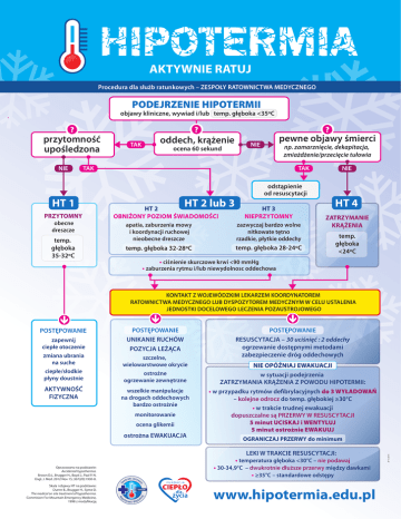 HIPOTERMIA AKTYWNIE RATUJ Procedura dla służb ratunkowych – ZESPOŁY RATOWNICTWA MEDYCZNEGO PODEJRZENIE HIPOTERMII objawy kliniczne, wywiad i/lub temp. głęboka <35ºC ? przytomność upośledzona NIE ? TAK oddech, krążenie ocena 60 sekund ? pewne objawy śmierci NIE np. zamarznięcie, dekapitacja, zmiażdżenie/przecięcie tułowia TAK HT 1 PRZYTOMNY obecne dreszcze temp. głęboka 35-32ºC TAK HT 2 lub 3 HT 2 OBNIŻONY POZIOM ŚWIADOMOŚCI odstąpienie od resuscytacji HT 3 NIEPRZYTOMNY apatia, zaburzenia mowy i koordynacji ruchowej nieobecne dreszcze zazwyczaj bardzo wolne nitkowate tętno rzadkie, płytkie oddechy temp. głęboka 32-28ºC temp. głęboka 28-24ºC NIE HT 4 ZATRZYMANIE KRĄŻENIA temp. głęboka <24ºC • ciśnienie skurczowe krwi <90 mmHg • zaburzenia rytmu i/lub niewydolnosc oddechowa KONTAKT Z WOJEWÓDZKIM LEKARZEM KOORDYNATOREM RATOWNICTWA MEDYCZNEGO LUB DYSPOZYTOREM MEDYCZNYM W CELU USTALENIA JEDNOSTKI DOCELOWEGO LECZENIA POZAUSTROJOWEGO zapewnij ciepłe otoczenie zmiana ubrania na suche ciepłe/słodkie płyny doustnie AKTYWNOŚĆ FIZYCZNA POSTĘPOWANIE UNIKANIE RUCHÓW POZYCJA LEŻĄCA szczelne, wielowarstwowe okrycie ostrożne ogrzewanie zewnętrzne wszelkie manipulacje na drogach oddechowych bardzo ostrożnie monitorowanie ocena glikemii ostrożna EWAKUACJA POSTĘPOWANIE RESUSCYTACJA – 30 uciśnięć : 2 oddechy ogrzewanie dostępnymi metodami zabezpieczenie dróg oddechowych NIE OPÓŹNIAJ EWAKUACJI w sytuacji podejrzenia ZATRZYMANIA KRĄŻENIA Z POWODU HIPOTERMII: • w przypadku rytmów defibrylacyjnych do 3 WYŁADOWAŃ – kolejne odrocz do temp. głębokiej ≥30°C • w trakcie trudnej ewakuacji dopuszczalne są PRZERWY W RESUSCYTACJI 5 minut UCISKAJ i WENTYLUJ 5 minut ostrożnie EWAKUUJ OGRANICZAJ PRZERWY do minimum LEKI W TRAKCIE RESUSCYTACJI: • temperatura głęboka <30°C – nie podawaj Opracowano na podstawie: Accidental hypothermia. Brown D.J., Brugger H., Boyd J., Paal P. N. Engl. J. Med. 2012 Nov 15; 367(20):1930-8. Skala i objawy HT na podstawie: Durrer B., Brugger H., Syme D. The medical on site treatment of hypothermia. Commision For Mountain Emergency Medicine, 1998 z modyfikacją • 30-34,9°C – dwukrotnie dłuższe przerwy między dawkami • ≥35°C – standardowe odstępy www.hipotermia.edu.pl ZP 12.2015 POSTĘPOWANIE