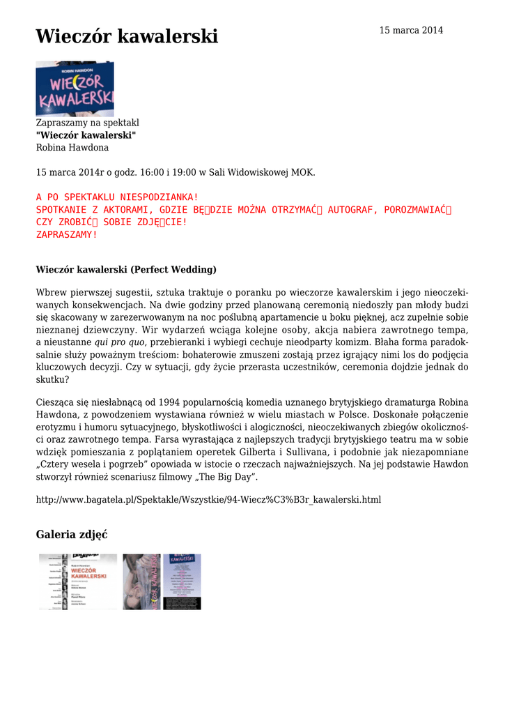 Wieczór kawalerski 15 marca 2014 Zapraszamy na spektakl "Wieczór kawalerski" Robina Hawdona 15 marca 2014r o godz. 16:00 i 19:00 w Sali Widowiskowej MOK. A PO SPEKTAKLU NIESPODZIANKA! SPOTKANIE Z AKTORAMI, GDZIE BĘDZIE MOŻNA OTRZYMAĆ AUTOGRAF, POROZMAWIAĆ CZY ZROBIĆ SOBIE ZDJĘCIE! ZAPRASZAMY! Wieczór kawalerski (Perfect Wedding) Wbrew pierwszej sugestii, sztuka traktuje o poranku po wieczorze kawalerskim i jego nieoczekiwanych konsekwencjach. Na dwie godziny przed planowaną ceremonią niedoszły pan młody budzi się skacowany w zarezerwowanym na noc poślubną apartamencie u boku pięknej, acz zupełnie sobie nieznanej dziewczyny. Wir wydarzeń wciąga kolejne osoby, akcja nabiera zawrotnego tempa, a nieustanne qui pro quo, przebieranki i wybiegi cechuje nieodparty komizm. Błaha forma paradoksalnie służy poważnym treściom: bohaterowie zmuszeni zostają przez igrający nimi los do podjęcia kluczowych decyzji. Czy w sytuacji, gdy życie przerasta uczestników, ceremonia dojdzie jednak do skutku? Ciesząca się niesłabnącą od 1994 popularnością komedia uznanego brytyjskiego dramaturga Robina Hawdona, z powodzeniem wystawiana również w wielu miastach w Polsce. Doskonałe połączenie erotyzmu i humoru sytuacyjnego, błyskotliwości i alogiczności, nieoczekiwanych zbiegów okoliczności oraz zawrotnego tempa. Farsa wyrastająca z najlepszych tradycji brytyjskiego teatru ma w sobie wdzięk pomieszania z poplątaniem operetek Gilberta i Sullivana, i podobnie jak niezapomniane „Cztery wesela i pogrzeb” opowiada w istocie o rzeczach najważniejszych. Na jej podstawie Hawdon stworzył również scenariusz filmowy „The Big Day”. http://www.bagatela.pl/Spektakle/Wszystkie/94-Wiecz%C3%B3r_kawalerski.html Galeria zdjęć