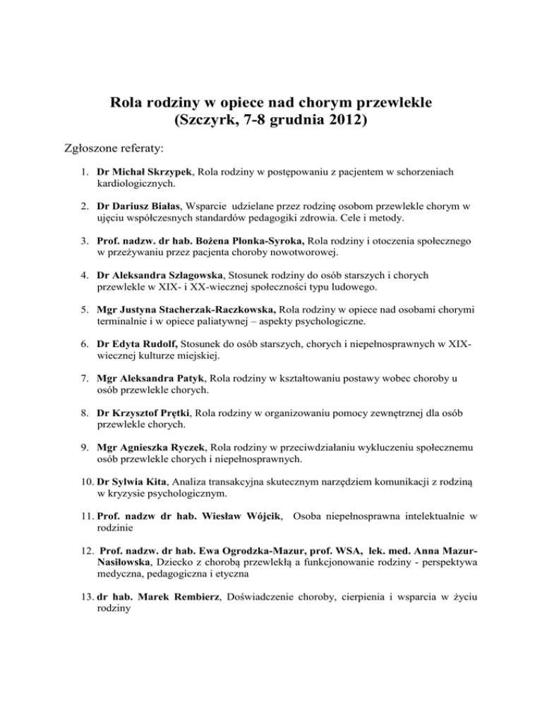 Rola rodziny w opiece nad chorym przewlekle (Szczyrk, 7-8 grudnia 2012) Zgłoszone referaty: 1. Dr Michał Skrzypek, Rola rodziny w postępowaniu z pacjentem w schorzeniach kardiologicznych. 2. Dr Dariusz Białas, Wsparcie udzielane przez rodzinę osobom przewlekle chorym w ujęciu współczesnych standardów pedagogiki zdrowia. Cele i metody. 3. Prof. nadzw. dr hab. Bożena Płonka-Syroka, Rola rodziny i otoczenia społecznego w przeżywaniu przez pacjenta choroby nowotworowej. 4. Dr Aleksandra Szlagowska, Stosunek rodziny do osób starszych i chorych przewlekle w XIX- i XX-wiecznej społeczności typu ludowego. 5. Mgr Justyna Stacherzak-Raczkowska, Rola rodziny w opiece nad osobami chorymi terminalnie i w opiece paliatywnej – aspekty psychologiczne. 6. Dr Edyta Rudolf, Stosunek do osób starszych, chorych i niepełnosprawnych w XIXwiecznej kulturze miejskiej. 7. Mgr Aleksandra Patyk, Rola rodziny w kształtowaniu postawy wobec choroby u osób przewlekle chorych. 8. Dr Krzysztof Prętki, Rola rodziny w organizowaniu pomocy zewnętrznej dla osób przewlekle chorych. 9. Mgr Agnieszka Ryczek, Rola rodziny w przeciwdziałaniu wykluczeniu społecznemu osób przewlekle chorych i niepełnosprawnych. 10. Dr Sylwia Kita, Analiza transakcyjna skutecznym narzędziem komunikacji z rodziną w kryzysie psychologicznym. 11. Prof. nadzw dr hab. Wiesław Wójcik, Osoba niepełnosprawna intelektualnie w rodzinie 12. Prof. nadzw. dr hab. Ewa Ogrodzka-Mazur, prof. WSA, lek. med. Anna MazurNasiłowska, Dziecko z chorobą przewlekłą a funkcjonowanie rodziny - perspektywa medyczna, pedagogiczna i etyczna 13. dr hab. Marek Rembierz, Doświadczenie choroby, cierpienia i wsparcia w życiu rodziny