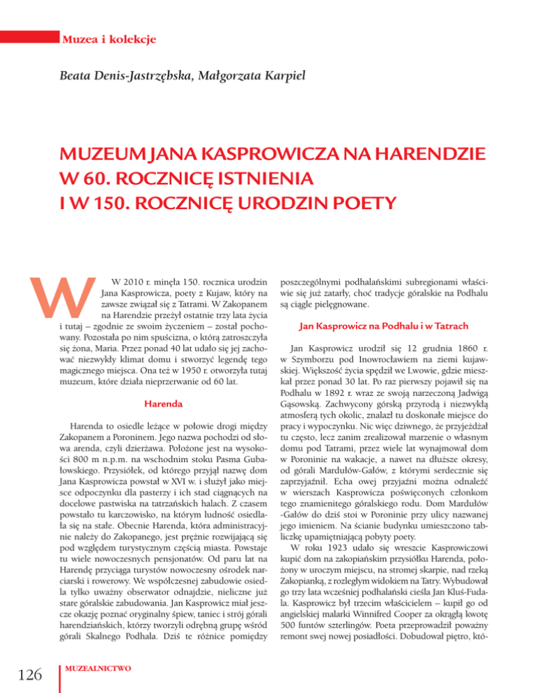 Muzea i kolekcje Beata Denis-Jastrzębska, Małgorzata Karpiel MUZEUM JANA KASPROWICZA NA HARENDZIE W 60. ROCZNICĘ ISTNIENIA I W 150. ROCZNICĘ URODZIN POETY W 2010 r. minęła 150. rocznica urodzin Jana Kasprowicza, poety z Kujaw, który na zawsze związał się z Tatrami. W Zakopanem na Harendzie przeżył ostatnie trzy lata życia i tutaj – zgodnie ze swoim życzeniem – został pochowany. Pozostała po nim spuścizna, o którą zatroszczyła się żona, Maria. Przez ponad 40 lat udało się jej zachować niezwykły klimat domu i stworzyć legendę tego magicznego miejsca. Ona też w 1950 r. otworzyła tutaj muzeum, które działa nieprzerwanie od 60 lat. Harenda Harenda to osiedle leżące w połowie drogi między Zakopanem a Poroninem. Jego nazwa pochodzi od słowa arenda, czyli dzierżawa. Położone jest na wysokości 800 m n.p.m. na wschodnim stoku Pasma Gubałowskiego. Przysiółek, od którego przyjął nazwę dom Jana Kasprowicza powstał w XVI w. i służył jako miejsce odpoczynku dla pasterzy i ich stad ciągnących na docelowe pastwiska na tatrzańskich halach. Z czasem powstało tu karczowisko, na którym ludność osiedlała się na stałe. Obecnie Harenda, która administracyjnie należy do Zakopanego, jest prężnie rozwijającą się pod względem turystycznym częścią miasta. Powstaje tu wiele nowoczesnych pensjonatów. Od paru lat na Harendę przyciąga turystów nowoczesny ośrodek narciarski i rowerowy. We współczesnej zabudowie osiedla tylko uważny obserwator odnajdzie, nieliczne już stare góralskie zabudowania. Jan Kasprowicz miał jeszcze okazję poznać oryginalny śpiew, taniec i strój górali harendziańskich, którzy tworzyli odrębną grupę wśród górali Skalnego Podhala. Dziś te różnice pomiędzy 126 MUZEALNICTWO poszczególnymi podhalańskimi subregionami właściwie się już zatarły, choć tradycje góralskie na Podhalu są ciągle pielęgnowane. Jan Kasprowicz na Podhalu i w Tatrach Jan Kasprowicz urodził się 12 grudnia 1860 r. w Szymborzu pod Inowrocławiem na ziemi kujawskiej. Większość życia spędził we Lwowie, gdzie mieszkał przez ponad 30 lat. Po raz pierwszy pojawił się na Podhalu w 1892 r. wraz ze swoją narzeczoną Jadwigą Gąsowską. Zachwycony górską przyrodą i niezwykłą atmosferą tych okolic, znalazł tu doskonałe miejsce do pracy i wypoczynku. Nic więc dziwnego, że przyjeżdżał tu często, lecz zanim zrealizował marzenie o własnym domu pod Tatrami, przez wiele lat wynajmował dom w Poroninie na wakacje, a nawet na dłuższe okresy, od górali Mardułów-Gałów, z którymi serdecznie się zaprzyjaźnił. Echa owej przyjaźni można odnaleźć w wierszach Kasprowicza poświęconych członkom tego znamienitego góralskiego rodu. Dom Mardułów -Gałów do dziś stoi w Poroninie przy ulicy nazwanej jego imieniem. Na ścianie budynku umieszczono tabliczkę upamiętniającą pobyty poety. W roku 1923 udało się wreszcie Kasprowiczowi kupić dom na zakopiańskim przysiółku Harenda, położony w uroczym miejscu, na stromej skarpie, nad rzeką Zakopianką, z rozległym widokiem na Tatry. Wybudował go trzy lata wcześniej podhalański cieśla Jan Kluś-Fudala. Kasprowicz był trzecim właścicielem – kupił go od angielskiej malarki Winnifred Cooper za okrągłą kwotę 500 funtów szterlingów. Poeta przeprowadził poważny remont swej nowej posiadłości. Dobudował piętro, któ- Muzea i kolekcje 1. i 2. Muzeum Jana Kasprowicza na Harendzie w Zakopanem latem i zimą 1. and 2. Jan Kasprowicz Museum at the Harenda in Zakopane in summer and winter Jan Kasprowicz zmarł 1 sierpnia 1926 r. w swoim ukochanym domu na Harendzie, powierzając żonie pieczę nad własną spuścizną literacką. re miało być przeznaczone na wakacyjne mieszkanie dla dwóch córek i ich rodzin. Dodał również parę pomieszczeń, które miały służyć jemu i jego ostatniej towarzyszce życia, Marusi z Buninów Kasprowiczowej, której muzeum zawdzięcza swoje powstanie. Wśród tych pomieszczeń znalazła się pracownia-biblioteka, kuchnia, łazienka i pokoje gościnne. Jan Kasprowicz krótko cieszył się swoim pierwszym własnym domem. Mieszkał w nim zaledwie trzy lata, z których dwa ostatnie walczył z ciężką chorobą. Mimo problemów ze zdrowiem gospodarza życie towarzyskie na Harendzie toczyło się niezwykle bujnie. Mówiono, że ona jest zakopiańskim salonem artystycznym. Poetę odwiedzali tutaj jego przyjaciele, znane postaci życia kulturalnego okresu międzywojennego, jak Karol Szymanowski, Leopold Staff, Witold Gombrowicz, Kornel Makuszyński, Stanisław Ignacy Witkiewicz („Witkacy”) – nie sposób wymienić wszystkich. Wielu z nich zostawiło materialne pamiątki swoich pobytów, które dziś stanowią interesujące eksponaty muzealne. Tuż przed śmiercią zdążył jeszcze Kasprowicz ukończyć ostatni tomik poetycki pod tytułem Mój świat. Pieśni na gęśliczkach i malowanki na szkle1. Nadal istnieją przedmioty, które stały się inspiracją do napisania utworów z tego tomiku. Życie Marii Kasprowiczowej na Harendzie. Powstanie muzeum Jan Kasprowicz w swym testamencie podzielił dom na Harendzie na trzy części, między dwie córki i żonę. Pani Maria z Buninów Kasprowiczowa zajmowała jego dolną część przez następne 42 lata. Przez cały ten czas pomimo śmierci gospodarza Harenda nadal pełniła rolę salonu artystycznego. Do grona stałych bywalców dołączyło młode pokolenie pisarzy, malarzy i muzyków. Zaczęli też pojawiać się turyści, którzy chcieli zobaczyć, jak poeta mieszkał. Pani Maria była otwarta na każde odwiedziny. Nie tylko wpuszczała ciekawskich do prywatnych wnętrz, ale również udzielała informacji na temat życia i twórczości męża. W końcu dom na Harendzie stał się stałym punktem wycieczek osób indywidualnych, a także grup szkolnych i turystycznych. W tej sytuacji, w roku 1950, Maria Kasprowiczowa zdecydowała się ofiarować społeczeńs