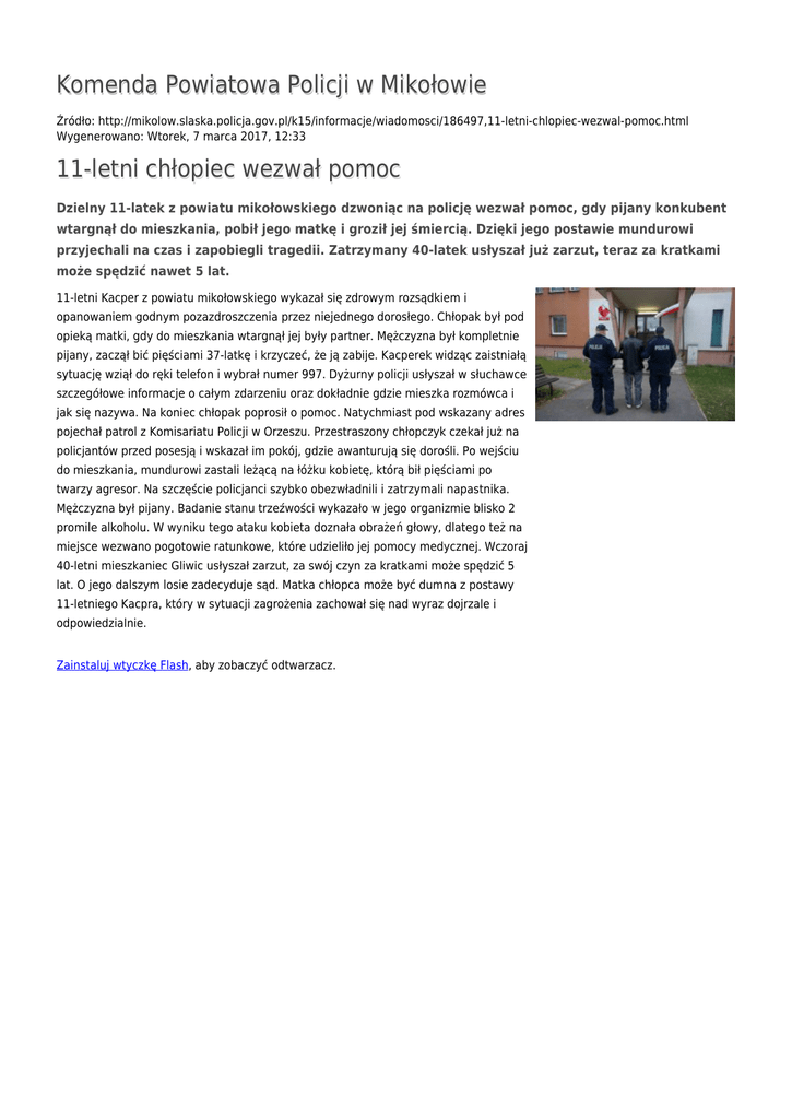Komenda Powiatowa Policji w Mikołowie Źródło: http://mikolow.slaska.policja.gov.pl/k15/informacje/wiadomosci/186497,11-letni-chlopiec-wezwal-pomoc.html Wygenerowano: Wtorek, 7 marca 2017, 12:33 11-letni chłopiec wezwał pomoc Dzielny 11-latek z powiatu mikołowskiego dzwoniąc na policję wezwał pomoc, gdy pijany konkubent wtargnął do mieszkania, pobił jego matkę i groził jej śmiercią. Dzięki jego postawie mundurowi przyjechali na czas i zapobiegli tragedii. Zatrzymany 40-latek usłyszał już zarzut, teraz za kratkami może spędzić nawet 5 lat. 11-letni Kacper z powiatu mikołowskiego wykazał się zdrowym rozsądkiem i opanowaniem godnym pozazdroszczenia przez niejednego dorosłego. Chłopak był pod opieką matki, gdy do mieszkania wtargnął jej były partner. Mężczyzna był kompletnie pijany, zaczął bić pięściami 37-latkę i krzyczeć, że ją zabije. Kacperek widząc zaistniałą sytuację wziął do ręki telefon i wybrał numer 997. Dyżurny policji usłyszał w słuchawce szczegółowe informacje o całym zdarzeniu oraz dokładnie gdzie mieszka rozmówca i jak się nazywa. Na koniec chłopak poprosił o pomoc. Natychmiast pod wskazany adres pojechał patrol z Komisariatu Policji w Orzeszu. Przestraszony chłopczyk czekał już na policjantów przed posesją i wskazał im pokój, gdzie awanturują się dorośli. Po wejściu do mieszkania, mundurowi zastali leżącą na łóżku kobietę, którą bił pięściami po twarzy agresor. Na szczęście policjanci szybko obezwładnili i zatrzymali napastnika. Mężczyzna był pijany. Badanie stanu trzeźwości wykazało w jego organizmie blisko 2 promile alkoholu. W wyniku tego ataku kobieta doznała obrażeń głowy, dlatego też na miejsce wezwano pogotowie ratunkowe, które udzieliło jej pomocy medycznej. Wczoraj 40-letni mieszkaniec Gliwic usłyszał zarzut, za swój czyn za kratkami może spędzić 5 lat. O jego dalszym losie zadecyduje sąd. Matka chłopca może być dumna z postawy 11-letniego Kacpra, który w sytuacji zagrożenia zachował się nad wyraz dojrzale i odpowiedzialnie. Zainstaluj wtyczkę Flash, aby zobaczyć odtwarzacz. pobierz film - 5.23 MB Zainstaluj wtyczkę Flash, aby zobaczyć odtwarzacz. ZAŁĄCZNIKI DO STRONY 316.13 KB Ocena: 4.3/5 (7) Tweetnij