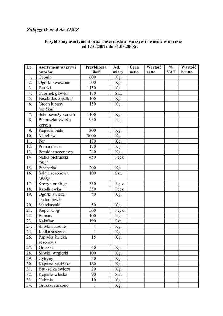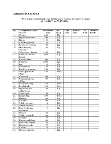 Załącznik nr 4 do SIWZ Przybliżony asortyment oraz ilości dostaw warzyw i owoców w okresie od 1.10.2007r.do 31.03.2008r. Lp. Asortyment warzyw i owoców 1. 2. 3. 4. 5. 6. Cebula Ogórki kwaszone Buraki Czosnek główki Fasola Jaś /op.5kg/ Groch łupany /op.5kg/ Seler świeży korzeń Pietruszka świeża korzeń Kapusta biała Marchew Por Pomarańcze Pomidor sezonowy Natka pietruszki /50g/ Pieczarka Sałata sezonowa /300g/ Szczypior /50g/ Rzodkiewka Ogórki świeże szklarniowe Mandarynki Koper /50g/ Banany Kalafior Śliwki suszone Jabłka suszone Papryka świeża sezonowa Gruszki Śliwki węgierki Cytryny Kapusta pekińska Brukselka świeża Kapusta włoska Cukinia Gruszki suszone 7. 8. 9. 10. 11. 12. 13. 14 15. 16. 17. 18. 19. 20. 21. 22. 23. 24. 25. 26. 27. 28. 29. 30. 31. 32. 33. 34. Przybliżona ilość Jed. miary 600 500 1150 170 100 150 Kg. Kg. Kg. Szt. Kg. Kg. 1100 950 Kg. Kg. 300 3000 170 170 240 450 Kg. Kg. Kg. Kg. Kg. Pęcz. 200 100 Kg. Szt. 350 350 50 Pęcz. Pęcz. Kg. 50 500 100 190 4 1 15 Kg. Pęcz. Kg. Szt. Kg. Kg. Kg. 40 100 50 160 20 90 10 1 Kg. Kg. Kg. Kg. Kg. Szt. Kg. Kg. Cena netto Wartość netto % VAT Wartość brutto 35. 36. 37. 38. Kapusta brunatna Kabaczek Pomidor szklarniowy Sałata szklarniowa /300g/ Wartość ogółem netto i brutto: 130 10 60 430 Kg. Kg Kg. Szt. Pieczęć i podpis Wykonawcy: ……………………………………………………………… …………………………….. Miejscowość i data: ………………………………………………………………………………