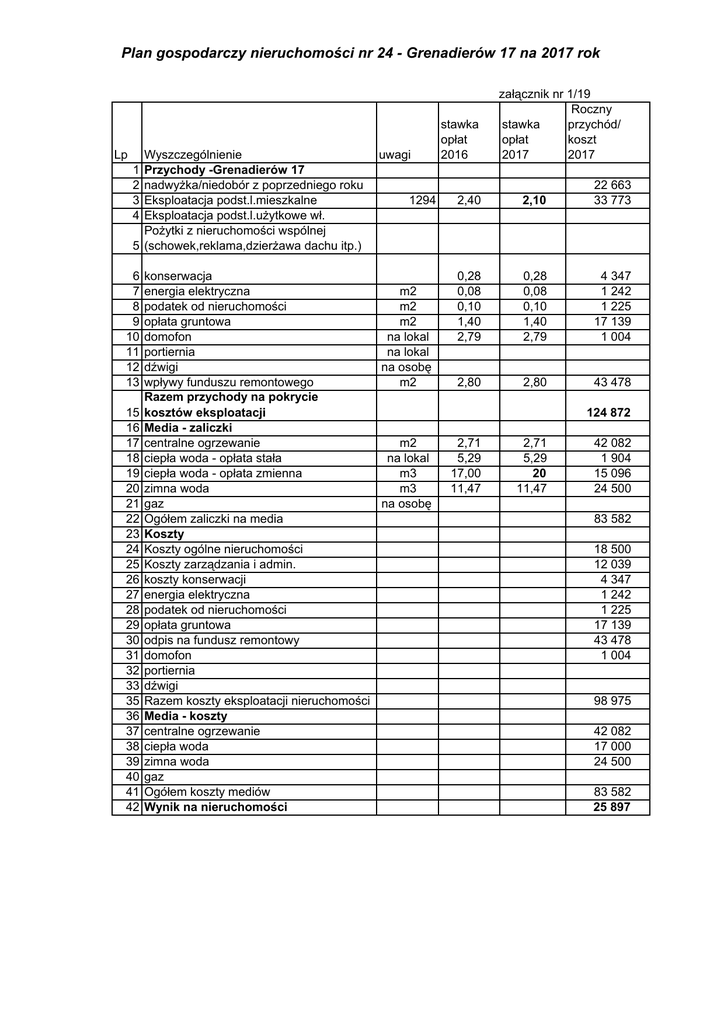 Plan gospodarczy nieruchomości nr 24 - Grenadierów 17 na 2017 rok Lp Wyszczególnienie Przychody -Grenadierów 17 nadwyżka/niedobór z poprzedniego roku Eksploatacja podst.l.mieszkalne Eksploatacja podst.l.użytkowe wł. Pożytki z nieruchomości wspólnej 5 (schowek,reklama,dzierżawa dachu itp.) 1 2 3 4 6 7 8 9 10 11 12 13 15 16 17 18 19 20 21 22 23 24 25 26 27 28 29 30 31 32 33 35 36 37 38 39 40 41 42 uwagi 1294 konserwacja energia elektryczna m2 podatek od nieruchomości m2 opłata gruntowa m2 domofon na lokal portiernia na lokal dźwigi na osobę wpływy funduszu remontowego m2 Razem przychody na pokrycie kosztów eksploatacji Media - zaliczki centralne ogrzewanie m2 ciepła woda - opłata stała na lokal ciepła woda - opłata zmienna m3 zimna woda m3 gaz na osobę Ogółem zaliczki na media Koszty Koszty ogólne nieruchomości Koszty zarządzania i admin. koszty konserwacji energia elektryczna podatek od nieruchomości opłata gruntowa odpis na fundusz remontowy domofon portiernia dźwigi Razem koszty eksploatacji nieruchomości Media - koszty centralne ogrzewanie ciepła woda zimna woda gaz Ogółem koszty mediów Wynik na nieruchomości stawka opłat 2016 załącznik nr 1/19 Roczny przychód/ stawka koszt opłat 2017 2017 2,40 2,10 22 663 33 773 0,28 0,08 0,10 1,40 2,79 0,28 0,08 0,10 1,40 2,79 4 347 1 242 1 225 17 139 1 004 2,80 2,80 43 478 124 872 2,71 5,29 17,00 11,47 2,71 5,29 20 11,47 42 082 1 904 15 096 24 500 83 582 18 500 12 039 4 347 1 242 1 225 17 139 43 478 1 004 98 975 42 082 17 000 24 500 83 582 25 897