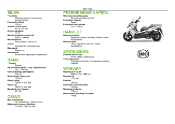2016 J125 SILNIK PRZENIESIENIE NAPĘDU Typ silnika Chłodzony cieczą, czterosuwowy jednocylindrowy Pojemność silnika 125 cm³ Średnica x skok tłoka 54.0 x 54.5 mm Stopień sprężania 11:7:1 Układ rozrządu/ilość zaworów SOHC, 4 zawory Układ zasilania Wtrysk paliwa: ø27 mm x 1 Zapłon Kontrola ECU (tranzystorowy) Rozrusznik Elektryczny Smarowanie Smarowanie wymuszone, mokra miska Układ przeniesienia napędu Skrzynia automatyczna CVT Przełożenie napędu Pasek Przełożenie podstawowe 2.201 ~ 0.829 RAMA Typ ramy Stalowa Kąt pochylenia główki ramy / Wyprzedzenie 28.0° / 113 mm Skok przedniego zawieszenia 110 mm Skok tylnego zawieszenia 100 mm Opony, przód 120/80-14 M/C 58S Opony, tył 150/70-13 M/C 64S Kąt skrętu, lewy / prawy 40˚ / 40˚ OSIĄGI Moc maksymalna 10.3 kW (14 KM) / 9,000 obr./min. Maksymalny moment obrotowy 11.5 Nm / 7,000 obr./min. HAMULCE Hamulce przednie Pojedyncza tarcza o średnicy 260 mm, zacisk dwutłoczkowy Hamulce tylne Tarcza pojedyncza 240 mm, zacisk dwutłoczkowy ZAWIESZENIE Przednie zawieszenie 37 mm widelec teleskopowy Tylne zawieszenie Podwójny amortyzator z 5-stopniową regulacją napięcia WYMIARY Wymiary (D x S x W) 2,235 x 775 x 1,260 mm Rozstaw osi 1,555 mm Prześwit 145 mm Pojemność zbiornika paliwa 13 litrów Wysokość siedzenia 775 mm Masa pojazdu gotowego do użytku 182kg