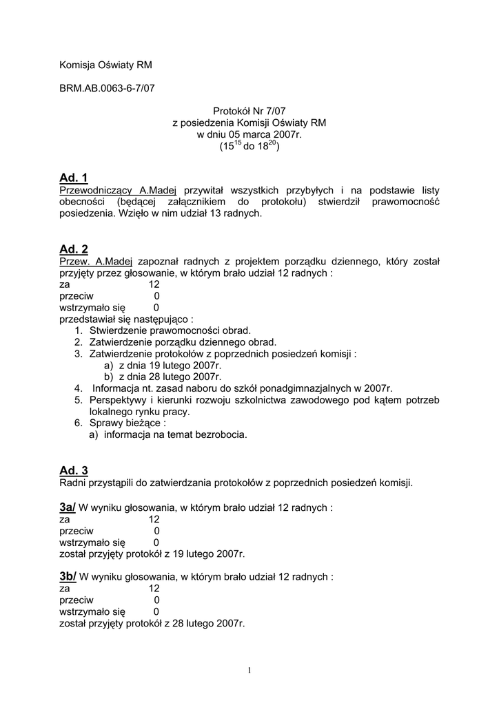 Komisja Oświaty RM BRM.AB.0063-6-7/07 Protokół Nr 7/07 z posiedzenia Komisji Oświaty RM w dniu 05 marca 2007r. (1515 do 1820) Ad. 1 Przewodniczący A.Madej przywitał wszystkich przybyłych i na podstawie listy obecności (będącej załącznikiem do protokołu) stwierdził prawomocność posiedzenia. Wzięło w nim udział 13 radnych. Ad. 2 Przew. A.Madej zapoznał radnych z projektem porządku dziennego, który został przyjęty przez głosowanie, w którym brało udział 12 radnych : za 12 przeciw 0 wstrzymało się 0 przedstawiał się następująco : 1. Stwierdzenie prawomocności obrad. 2. Zatwierdzenie porządku dziennego obrad. 3. Zatwierdzenie protokołów z poprzednich posiedzeń komisji : a) z dnia 19 lutego 2007r. b) z dnia 28 lutego 2007r. 4. Informacja nt. zasad naboru do szkół ponadgimnazjalnych w 2007r. 5. Perspektywy i kierunki rozwoju szkolnictwa zawodowego pod kątem potrzeb lokalnego rynku pracy. 6. Sprawy bieżące : a) informacja na temat bezrobocia. Ad. 3 Radni przystąpili do zatwierdzania protokołów z poprzednich posiedzeń komisji. 3a/ W wyniku głosowania, w którym brało udział 12 radnych : za 12 przeciw 0 wstrzymało się 0 został przyjęty protokół z 19 lutego 2007r. 3b/ W wyniku głosowania, w którym brało udział 12 radnych : za 12 przeciw 0 wstrzymało się 0 został przyjęty protokół z 28 lutego 2007r. 1 Przew. A.Madej przystąpił do sformułowania wniosków nieformalnych, zgłoszonych przez radnych na poprzednim posiedzeniu Komisji Oświaty, które brzmiały następująco : Komisja postuluje, aby Wiceprezydent spowodował opracowanie informacji o potrzebach inwestycyjnych i remontowych w miejskich placówkach oświatowych w układzie poszczególnych zadań i rozbiciu na rok bieżący oraz lata następne z określeniem przewidywanych źródeł ich finansowania, zobowiązać Wydział Edukacji do sporządzenia m.in. na podstawie ankiet, informacji nt. potrzeb w zakresie zajęć pozalekcynych i przyczyn ich nierealizowania oraz wskazanie, co należy zrobić, aby te zajęcia były w przyszłości realizowane, zobowiązać Wiceprezydenta do przedstawienia informacji na temat realizacji II etapu MOS-u, tj. prawdopodobieństwa współfinansowania inwestycji przez Ministerstwo Sportu oraz realizacji inwestycji w ramach partnerstwa publicznoprywatnego oraz koncepcji władz w przypadku braku możliwości finansowania przez Ministerstwo Sportu, w ramach programu budowy 2 boisk przyszkolnych rocznie komisja zwraca się do WED z prośbą o przedstawienie planu działań w tym zakresie na najbliższe lata, z określeniem, które boiska zostaną zrealizowane, w jakiej kolejności i za jakie pieniądze, Komisja prosi WED o informację jakie są przewidywane kwoty z funduszy przeciwalkoholowych na zadania w obrębie oświaty i jaki jest plan ich przeznaczenia, komisja postuluje o przygotowanie informacji nt. przebiegu nauki pływania oraz programu nauczania pływania dzieci i młodzieży w Sosnowcu, aby każde dziecko po gimnazjum w Sosnowcu mogło mieć kartę pływacką. Poinformował, że na skutek konsensusu w klubie Platformy Obywatelskiej i inicjatywy Przewodniczącego Rady Miejskiej, Radni Platformy Obywatelskiej chcą konsekwentnie doprowadzić do tego, aby z rezerwy budżetowej miasta zostały wykonane w każdej dzielnicy boiska ze sztuczną nawierzchnią. Poprosił radnych o poparcie tej inicjatywy poza układem partyjnym. Dodał, że jest także inicjatywa Platformy Obywatelskiej, aby pieniądze z rezerwy budżetowej zostały przeznaczone na poprawę estetyki osiedli. Do wtorku powinny zostać złożone projekty. Z-ca Przew. Z.Dziewanowski zaproponował przedstawienie tych wniosków w sprawach bieżących, bo nie ma dla nich ustalonego, odrębnego punktu porządku posiedzenia. Zaproponował dodanie dodatkowego punktu w porządku dziennym. Ad. 4 i 5 Przew. A.Madej poinformował, że tematyka posiedzenia została zmieniona na prośbę Urzędu, a tematy zostały wybrane nieprzypadkowo, bo wielokrotnie były omawiane na posiedzeniach komisji w poprzedniej kadencji. Problem skutecznego i zgodnego z oczekiwaniami lokalnego rynku pracy szkolenia jest trudny do zrealizowania. Istotne jest co i za ile ma szansę realizacji. Młodzieży i dzieci szkolnej ponadgimnazjalnej stwarza trudność wybór odpowiedniej szkoły pod kątem przyszłego zawodu. 2 Poinformował, że w piątek uczestniczył w dyskusji w klubie biznesu, z której wynikało, że Polacy liczą się jako fachowcy na zachodzie. Zatrudnienie w usługach stanowi tam ponad 60%, a w Polsce niewspólmiernie mniej. Dodał, że jest bardzo wysoki, ponad 16%, wskaźnik bezrobocia w Sosnowcu, a najwięcej bezrobotnych jest licealistów i absolwentów zawodowych szkół policealnych. Podziękował dyrektorom za przygotowanie obszernych materiałów. Dodał, że istotna jest diagnoza z Powiatowego Urzędu Pracy. Radni przystąpili do debaty nad perspektywami i kierunkami rozwoju szkolnictwa zawodowego pod kątem potrzeb lokalnego rynku pracy. Z-ca Dyrektora Zespołu Szkół Elektronicznych i Informatycznych L.Stawiarski przedstawił prezentację multimedialną pt. „Analiza i ocena stopnia dopasowania modelu kształcenia do potrzeb rynku pracy w podregionie centralnym województwa śląskiego (materiały w załączeniu do protokołu). Dodał, że na początku 2006r. byli badani pracodawcy i instytucje kształcące. W makroregionie licea ogólnokształcące stanowią 22%, technika 20% a szkoły policealne 13%. Rozkład ilościowy i procentowy badanej populacji wg kryteriów rodzaju placówek kształtuje się w następujący sposób : technik elektronik, technik mechanik, technik ekonomista, technik elektryk, technik-handlowiec, technik-informatyk, technik hotelarstwa. Dodał, że obecnie w Sosnowcu nie szkoli się techników -elektryków. Przew. A.Madej poinformował, że słyszał, iż z rezerwy budżetowej można by stworzyć klasę dla informatyków. Dyr. L.Stawiarski odpowiedział, że kiedyś 