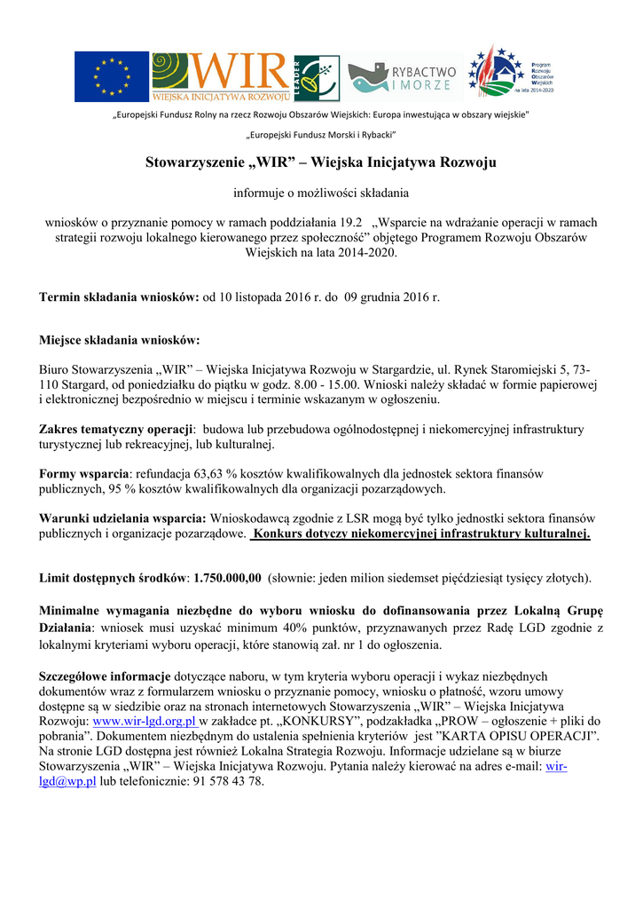 „Europejski Fundusz Rolny na rzecz Rozwoju Obszarów Wiejskich: Europa inwestująca w obszary wiejskie" „Europejski Fundusz Morski i Rybacki” Stowarzyszenie „WIR” – Wiejska Inicjatywa Rozwoju informuje o możliwości składania wniosków o przyznanie pomocy w ramach poddziałania 19.2 „Wsparcie na wdrażanie operacji w ramach strategii rozwoju lokalnego kierowanego przez społeczność” objętego Programem Rozwoju Obszarów Wiejskich na lata 2014-2020. Termin składania wniosków: od 10 listopada 2016 r. do 09 grudnia 2016 r. Miejsce składania wniosków: Biuro Stowarzyszenia „WIR” – Wiejska Inicjatywa Rozwoju w Stargardzie, ul. Rynek Staromiejski 5, 73110 Stargard, od poniedziałku do piątku w godz. 8.00 - 15.00. Wnioski należy składać w formie papierowej i elektronicznej bezpośrednio w miejscu i terminie wskazanym w ogłoszeniu. Zakres tematyczny operacji: budowa lub przebudowa ogólnodostępnej i niekomercyjnej infrastruktury turystycznej lub rekreacyjnej, lub kulturalnej. Formy wsparcia: refundacja 63,63 % kosztów kwalifikowalnych dla jednostek sektora finansów publicznych, 95 % kosztów kwalifikowalnych dla organizacji pozarządowych. Warunki udzielania wsparcia: Wnioskodawcą zgodnie z LSR mogą być tylko jednostki sektora finansów publicznych i organizacje pozarządowe. Konkurs dotyczy niekomercyjnej infrastruktury kulturalnej. Limit dostępnych środków: 1.750.000,00 (słownie: jeden milion siedemset pięćdziesiąt tysięcy złotych). Minimalne wymagania niezbędne do wyboru wniosku do dofinansowania przez Lokalną Grupę Działania: wniosek musi uzyskać minimum 40% punktów, przyznawanych przez Radę LGD zgodnie z lokalnymi kryteriami wyboru operacji, które stanowią zał. nr 1 do ogłoszenia. Szczegółowe informacje dotyczące naboru, w tym kryteria wyboru operacji i wykaz niezbędnych dokumentów wraz z formularzem wniosku o przyznanie pomocy, wniosku o płatność, wzoru umowy dostępne są w siedzibie oraz na stronach internetowych Stowarzyszenia „WIR” – Wiejska Inicjatywa Rozwoju: www.wir-lgd.org.pl w zakładce pt. „KONKURSY”, podzakładka „PROW – ogłoszenie + pliki do pobrania”. Dokumentem niezbędnym do ustalenia spełnienia kryteriów jest ”KARTA OPISU OPERACJI”. Na stronie LGD dostępna jest również Lokalna Strategia Rozwoju. Informacje udzielane są w biurze Stowarzyszenia „WIR” – Wiejska Inicjatywa Rozwoju. Pytania należy kierować na adres e-mail: [email protected] lub telefonicznie: 91 578 43 78.