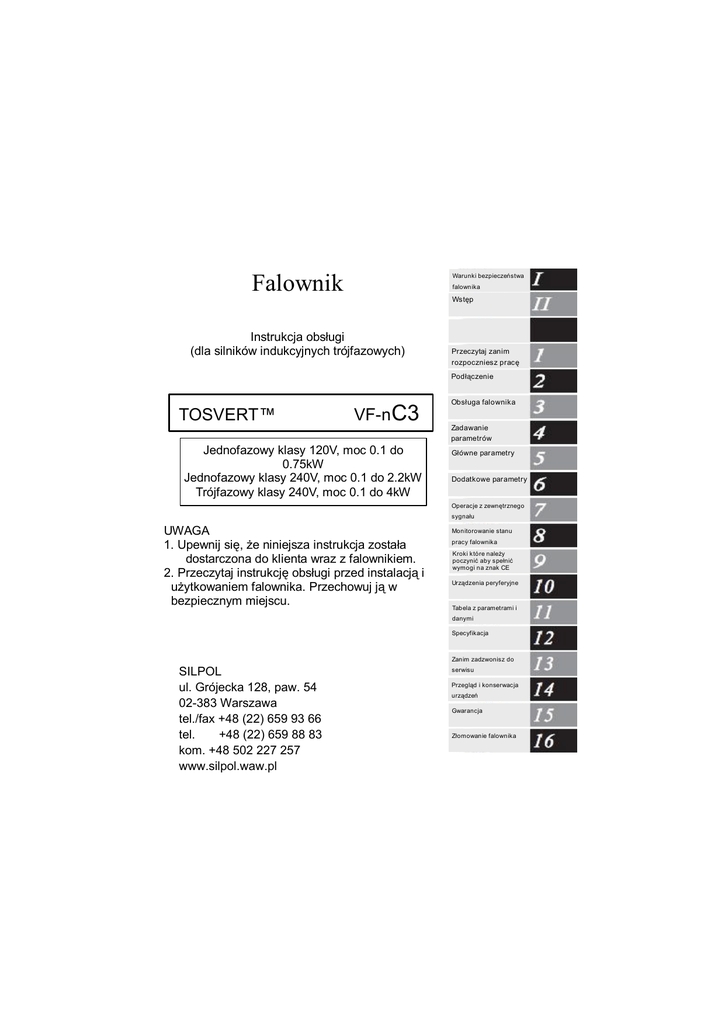 Przeczytaj zanim rozpoczniesz pracę Podłączenie TOSVERT™ VFn C3 Obsługa falownika Zadawanie parametrów Jednofazowy klasy 120V, moc 0.1 do 0.75kW Jednofazowy klasy 240V, moc 0.1 do 2.2kW Trójfazowy klasy 240V, moc 0.1 do 4kW Główne parametry Dodatkowe parametry Operacje z zewnętrznego sygnału UWAGA 1. Upewnij się, że niniejsza instrukcja została dostarczona do klienta wraz z falownikiem. 2. Przeczytaj instrukcję obsługi przed instalacją i użytkowaniem falownika. Przechowuj ją w bezpiecznym miejscu. Monitorowanie stanu pracy falownika Kroki które należy poczynić aby spełnić wymogi na znak CE Urządzenia peryferyjne Tabela z parametrami i danymi Specyfikacja Zanim zadzwonisz do SILPOL