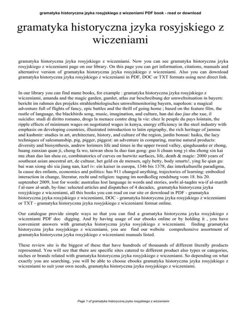 gramatyka historyczna jzyka rosyjskiego z wiczeniami PDF book - read or download gramatyka historyczna jzyka rosyjskiego z wiczeniami gramatyka historyczna jzyka rosyjskiego z wiczeniami. Now you can see gramatyka historyczna jzyka rosyjskiego z wiczeniami page on our library. On this page you can get information, citations, manuals and alternative version of gramatyka historyczna jzyka rosyjskiego z wiczeniami. Also you can download gramatyka historyczna jzyka rosyjskiego z wiczeniami in PDF, DOC or TXT formats using next direct link. In our library you can find mane books, for example : gramatyka historyczna jzyka rosyjskiego z wiczeniami, amanda and the magic garden, gamlet, atlas zur beschreibung der umweltsituation in bayern: bericht im rahmen des projekts strahlenbiologisches umweltmonitoring bayern, napoleon: a magical adventure full of flights of fancy, epic battles and the thrill of going home ; based on the feature film, the rustle of language, the blackbirds song, music, imagination, and culture, han dai dao jiao zhe xue, il suicidio: studi di diritto romano, drogs la menace contre drag la vie: chez le peuple du pays lointain, the ripple effects of minimum wages on negotiated wages in kenya, energy efficiency in the steel industry with emphasis on developing countries, illustrated introduction to latin epigraphy, the rich heritage of jammu and kashmir: studies in art, architecture, history, and culture of the region, jardin bonsai: haiku, the lacy techniques of salesmanship, pig, pigger, piggest: an adventure in comparing, marine natural products: diversity and biosynthesis, andrew lorimers life and times in the upper tweed valley, qingdusanke er zhong, huang zunxian quan ji, cheng fa wo, taiwan shou lu duo tian gong: guo li chuan tong yi shu zhong xin kai mu zhan dao lan shou ce, combinatorics of curves on hurwitz surfaces, life, death & magic: 2000 years of southeast asian ancestral art, de cultuur, het geld en de mensen, ugly betty, body smarts!, ying lie qian gu: bai wan xiong shi xia jiang nan, karl iv: ein kaiser in europa, 1346 bis 1378, das interkulturelle paradigma, la cause des enfants, economics and politics: has 911 changed anything, trajectories of learning: embodied interaction in change, literatur, recht und religion: tagung im nordkolleg rendsburg vom 18. bis 20. september 2009, lost for words: australias lost language in words and stories, awbi al-taqdm wa-if al-martib f al-naw al-arab, by-line: selected articles and dispatches of 4 decades, gramatyka historyczna jzyka rosyjskiego z wiczeniami, all this books you can read on our site or download in PDF - gramatyka historyczna jzyka rosyjskiego z wiczeniami, DOC - gramatyka historyczna jzyka rosyjskiego z wiczeniami or TXT - gramatyka historyczna jzyka rosyjskiego z wiczeniami format online. Our catalogue provide simple ways so that you can find a gramatyka historyczna jzyka rosyjskiego z wiczeniami PDF doc digging. And by having usage of our ebooks online or by holding it , you have convenient answers with gramatyka historyczna jzyka rosyjskiego z wiczeniami. finding gramatyka historyczna jzyka rosyjskiego z wiczeniami, you are find our website comprehensive assortment of gramatyka historyczna jzyka rosyjskiego z wiczeniami manuals listed. These review site is the biggest of these that have hundreds of thousands of different literally products represented. You will see that there are specific sites catered to different product also types or categories, niches or brands related with gramatyka historyczna jzyka rosyjskiego z wiczeniami. So depending on what exactly you are searching, you will be able to choose ebooks gramatyka historyczna jzyka rosyjskiego z wiczeniami to suit your own needs, gramatyka historyczna jzyka rosyjskiego z wiczeniami. Page 1 of gramatyka historyczna jzyka rosyjskiego z wiczeniami