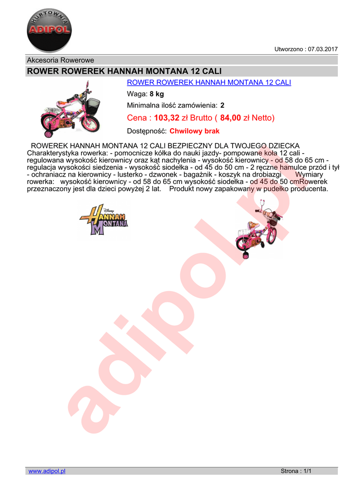 Utworzono : 07.03.2017 Akcesoria Rowerowe ROWER ROWEREK HANNAH MONTANA 12 CALI ROWER ROWEREK HANNAH MONTANA 12 CALI Waga: 8 kg Minimalna ilość zamówienia: 2 Cena : 103,32 zł Brutto ( 84,00 zł Netto) Dostępność: Chwilowy brak ad ip ol .p l ROWEREK HANNAH MONTANA 12 CALI BEZPIECZNY DLA TWOJEGO DZIECKA Charakterystyka rowerka: - pomocnicze kółka do nauki jazdy- pompowane koła 12 cali regulowana wysokość kierownicy oraz kąt nachylenia - wysokość kierownicy - od 58 do 65 cm regulacja wysokości siedzenia - wysokość siodełka - od 45 do 50 cm - 2 ręczne hamulce przód i tył - ochraniacz na kierownicy - lusterko - dzwonek - bagażnik - koszyk na drobiazgi Wymiary rowerka: wysokość kierownicy - od 58 do 65 cm wysokość siodełka - od 45 do 50 cmRowerek przeznaczony jest dla dzieci powyżej 2 lat. Produkt nowy zapakowany w pudełko producenta. www.adipol.pl Powered by TCPDF (www.tcpdf.org) Strona : 1/1