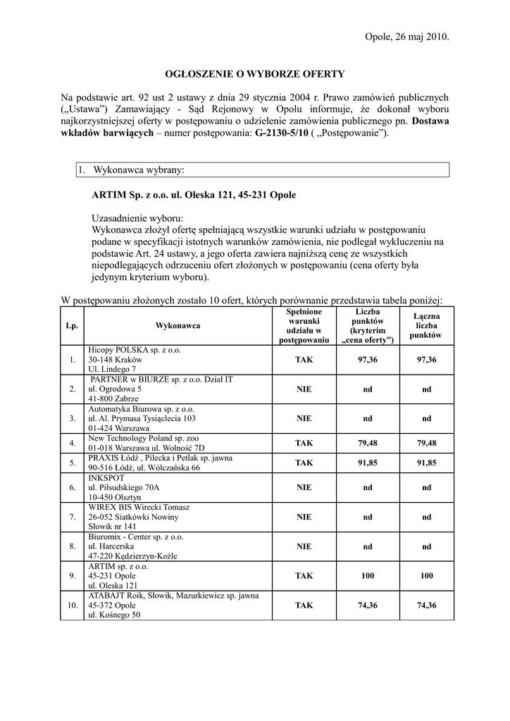 Opole, 26 maj 2010. OGŁOSZENIE O WYBORZE OFERTY Na podstawie art. 92 ust 2 ustawy z dnia 29 stycznia 2004 r. Prawo zamówień publicznych („Ustawa”) Zamawiający - Sąd Rejonowy w Opolu informuje, że dokonał wyboru najkorzystniejszej oferty w postępowaniu o udzielenie zamówienia publicznego pn. Dostawa wkładów barwiących – numer postępowania: G-2130-5/10 ( „Postępowanie”). 1. Wykonawca wybrany: ARTIM Sp. z o.o. ul. Oleska 121, 45-231 Opole Uzasadnienie wyboru: Wykonawca złożył ofertę spełniającą wszystkie warunki udziału w postępowaniu podane w specyfikacji istotnych warunków zamówienia, nie podlegał wykluczeniu na podstawie Art. 24 ustawy, a jego oferta zawiera najniższą cenę ze wszystkich niepodlegających odrzuceniu ofert złożonych w postępowaniu (cena oferty była jedynym kryterium wyboru). W postępowaniu złożonych zostało 10 ofert, których porównanie przedstawia tabela poniżej: Lp. 1. 2. 3. 4. 5. 6. 7. 8. 9. 10. Wykonawca Hicopy POLSKA sp. z o.o. 30-148 Kraków Ul. Lindego 7 PARTNER w BIURZE sp. z o.o. Dział IT ul. Ogrodowa 5 41-800 Zabrze Automatyka Biurowa sp. z o.o. ul. Al. Prymasa Tysiąclecia 103 01-424 Warszawa New Technology Poland sp. zoo 01-018 Warszawa ul. Wolność 7D PRAXIS Łódź , Pilecka i Petlak sp. jawna 90-516 Łódź, ul. Wólczańska 66 INKSPOT ul. Piłsudskiego 70A 10-450 Olsztyn WIREX BIS Wirecki Tomasz 26-052 Siatkówki Nowiny Słowik nr 141 Biuromix - Center sp. z o.o. ul. Harcerska 47-220 Kędzierzyn-Koźle ARTIM sp. z o.o. 45-231 Opole ul. Oleska 121 ATABAJT Roik, Słowik, Mazurkiewicz sp. jawna 45-372 Opole ul. Kośnego 50 Spełnione warunki udziału w postępowaniu Liczba punktów (kryterim „cena oferty”) Łączna liczba punktów TAK 97,36 97,36 NIE nd nd NIE nd nd TAK 79,48 79,48 TAK 91,85 91,85 NIE nd nd NIE nd nd NIE nd nd TAK 100 100 TAK 74,36 74,36