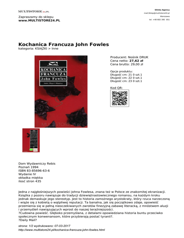 Glinka Agency mail;[email protected] Zapraszamy do sklepu www.MULTISTORE24.PL Warszawa tel. +48 602 395 051 Kochanica Francuza John Fowles kategoria: KSIĄŻKI > Inne Producent: Nośnik DRUK Cena netto: 27,62 zł Cena brutto: 29,00 zł Opcje produktu: Długość cm: 21 0 szt.1 Długość cm: 22 0 szt.1 Długość cm: 23 0 szt.1 Kod QR: Dom Wydawniczy Rebis Poznań 1994 ISBN 83-85696-63-6 Wydanie IV okładka miękka ilosć stron 435 Jedna z najgłośniejszych powieści Johna Fowlesa, znana też w Polsce ze znakomitej ekranizacji. Książka z pozoru nawiązuje do tradycji dziewiętnastowiecznego romansu, na każdym kroku jednak demaskuje jego stereotyp. Jest to historia zamożnego arystokraty, który rzuca narzeczoną i wiąże się z kobietą o wątpliwej reputacji. Ta banalna, jak się początkowo zdaje, opowieść przemienia się w pełną nieoczekiwanych zwrotów finezyjną zabawę literacką, z mnóstwem aluzji i przemyśleń nawiązujących wprost do naszej teraźniejszości. ?Cudowna powieść. Głęboko przemyślana, z detalami opowiedziana historia buntu przeciwko społecznym konwenansom, które przybierają postać tyranii?. ?Daily Mail? strona: 1/2 wydrukowano: 07-03-2017 http://www.multistore24.pl/kochanica-francuza-john-fowles.html John Fowles (1926-2005) to jeden z najbardziej interesujących pisarzy angielskich. Międzynarodową sławę zyskał już debiutancką powieścią Kolekcjoner, a jego pozycję ugruntowały kolejne, m.in. Mag, Daniel Martin, Mantissa i Kochanica Francuza. strona: 2/2 wydrukowano: 07-03-2017 http://www.multistore24.pl/kochanica-francuza-john-fowles.html
