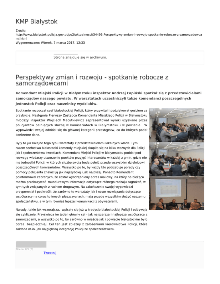 KMP Białystok Źródło: http://www.bialystok.policja.gov.pl/po2/aktualnosci/34496,Perspektywy-zmian-i-rozwoju-spotkanie-robocze-z-samorzadowca mi.html Wygenerowano: Wtorek, 7 marca 2017, 12:33 Strona znajduje się w archiwum. Perspektywy zmian i rozwoju - spotkanie robocze z samorządowcami Komendant Miejski Policji w Białymstoku inspektor Andrzej Łapiński spotkał się z przedstawicielami samorządów naszego powiatu. W warsztatach uczestniczyli także komendanci poszczególnych jednostek Policji oraz naczelnicy wydziałów. Spotkanie rozpoczął szef białostockiej Policji, który przywitał i podziękował gościom za przybycie. Następnie Pierwszy Zastępca Komendanta Miejskiego Policji w Białymstoku młodszy inspektor Wojciech Macutkiewicz zaprezentował wyniki uzyskane przez policjantów pełniących służbę w komisariatach w Białymstoku i w powiecie. W wypowiedzi swojej odniósł się do głównej kategorii przestępstw, co do których podał konkretne dane. Były to już kolejne tego typu warsztaty z przedstawicielami lokalnych władz. Tym razem szefostwo białostocki komendy miejskiej skupiło się na kilku ważnych dla Policji jak i społeczeństwa kwestiach. Komendant Miejski Policji w Białymstoku poddał pod rozwagę włodarzy utworzenie punktów przyjęć interesantów w każdej z gmin, gdzie nie ma jednostki Policji, w których służbę swoją będą pełnić przede wszystkim dzielnicowi poszczególnych komisariatów. Wszystko po to, by każdy kto potrzebuje porady czy pomocy policjanta znalazł ją jak najszybciej i jak najbliżej. Ponadto Komendant poinformował zebranych, że został wyodrębniony adres mailowy, na który na bieżąco można przekazywać mundurowym informacje dotyczące różnego rodzaju zagrożeń, w tym tych związanych z ruchem drogowym. Na zakończenie swojej wypowiedzi przypomniał i podkreślił, że zarówno te warsztaty jak i nowe rozwiązania dotyczące współpracy na coraz to innych płaszczyznach, mają przede wszystkim służyć naszemu społeczeństwu, a w tym również lepszej komunikacji z obywatelami. Narady, takie jak wczorajsza, wpisały się już w tradycje białostockiej Policji i odbywają się cyklicznie. Przyświeca im jeden główny cel - jak najszersza i najlepsza współpraca z samorządami, a wszystko po to, by zarówno w mieście jak i powiecie białostockim było coraz bezpieczniej. Cel ten jest zbieżny z założeniami kierownictwa Policji, które zakłada m.in. jak najgłębszą integrację Policji ze społeczeństwem. Ocena: 0/5 (0) Tweetnij