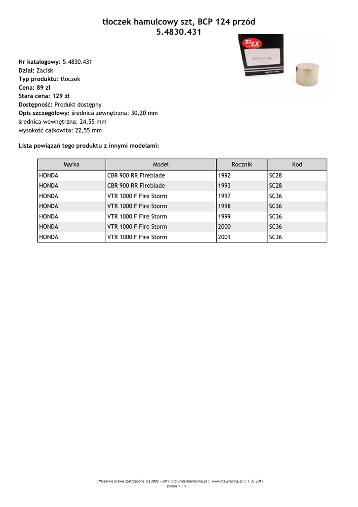 tłoczek hamulcowy szt, BCP 124 przód 5.4830.431 Nr katalogowy: 5.4830.431 Dział: Zacisk Typ produktu: tłoczek Cena: 89 zł Stara cena: 129 zł Dostępność: Produkt dostępny Opis szczegółowy: średnica zewnętrzna: 30,20 mm średnica wewnętrzna: 24,55 mm wysokość całkowita: 22,55 mm Lista powiązań tego produktu z innymi modelami: Marka Model Rocznik Kod HONDA CBR 900 RR Fireblade 1992 SC28 HONDA CBR 900 RR Fireblade 1993 SC28 HONDA VTR 1000 F Fire Storm 1997 SC36 HONDA VTR 1000 F Fire Storm 1998 SC36 HONDA VTR 1000 F Fire Storm 1999 SC36 HONDA VTR 1000 F Fire Storm 2000 SC36 HONDA VTR 1000 F Fire Storm 2001 SC36 :: Wszelkie prawa zastrzeżone (c) 2002 - 2017 :: [email protected] :: www.italyracing.pl :: 7.03.2017 strona 1 / 1