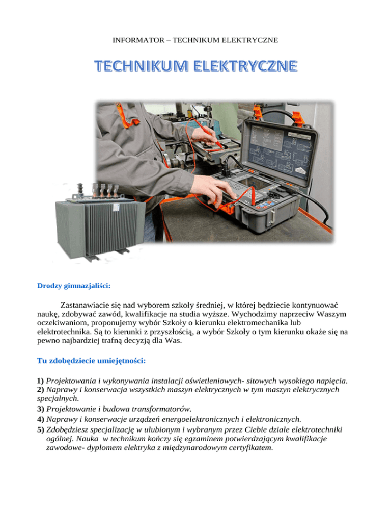 INFORMATOR – TECHNIKUM ELEKTRYCZNE Drodzy gimnazjaliści: Zastanawiacie się nad wyborem szkoły średniej, w której będziecie kontynuować naukę, zdobywać zawód, kwalifikacje na studia wyższe. Wychodzimy naprzeciw Waszym oczekiwaniom, proponujemy wybór Szkoły o kierunku elektromechanika lub elektrotechnika. Są to kierunki z przyszłością, a wybór Szkoły o tym kierunku okaże się na pewno najbardziej trafną decyzją dla Was. Tu zdobędziecie umiejętności: 1) Projektowania i wykonywania instalacji oświetleniowych- sitowych wysokiego napięcia. 2) Naprawy i konserwacja wszystkich maszyn elektrycznych w tym maszyn elektrycznych specjalnych. 3) Projektowanie i budowa transformatorów. 4) Naprawy i konserwacje urządzeń energoelektronicznych i elektronicznych. 5) Zdobędziesz specjalizację w ulubionym i wybranym przez Ciebie dziale elektrotechniki ogólnej. Nauka w technikum kończy się egzaminem potwierdzającym kwalifikacje zawodowe- dyplomem elektryka z międzynarodowym certyfikatem. Informacja o kierunku kształcenia: Technikum elektryczne- nauka trwa 4 lata. Po ukończeniu uczeń- absolwent otrzymuje średnie wykształcenie, maturę, dyplom technika elektryka. W czasie nauki uczniowie zdobywają wiedzę teoretyczna i praktyczną w zakresie: - budowy maszyn i urządzeń elektrycznych - budowy i modernizacji sieci elektroenergetycznej - obsługi wszystkich urządzeń elektrotechnicznych i elektronicznych Zajęcia praktyczne odbywają się w specjalnych pracowniach- laboratoriach oraz w czasie praktyki zawodowej 4-tygodniowej w wybranym przez Ciebie zakładzie lub firmie. Przedmioty zawodowe: - Podstawy elektrotechniki i elektroniki - Technologia i materiałoznawstwo elektryczne - Maszyny elektryczne - Aparaty i urządzenia elektryczne - Instalacje elektryczne - Projektowanie instalacji elektrycznych - Ochrona przeciwporażeniowa - Eksploatacja maszyn i urządzeń Elektrycznych - Język obcy zawodowy - Pracowania elektryczna i elektroniczna - Pracownia eksploatacji maszyn i urządzeń elektrycznych - Pracownia badań i montażu maszyn i urządzeń - Pracownia projektowania instalacji instalacji elektrycznych - Zajęcia praktyczne - Pracownia Montażu instalacji elektrycznych - Pracownia eksploatacji instalacji elektrycznych - Praktyka zawodowa Perspektywy zatrudnienia: Po ukończeniu Szkoły możesz podjąć pracę w całej sieci firm branży elektrotechnicznej, elektronicznej w kraju i za granicą (ważny certyfikat w krajach Unii Europejskiej). Dobrze wykształcony i przygotowany do pracy zawodowej technik elektryk znajdzie zatrudnienie niemal we wszystkich gałęziach przemysłu na stanowisku utrzymania ruchu konserwacji i naprawy urządzeń, maszyn, robotów, automatycznych linii technologicznych itd. Dużą szansą są również powstające nowe fabryki urządzeń elektrotechnicznych budowane przez koncerny państw Unii Europejskiej w naszym kraju. Elektrotechnika i elektronika to zdecydowanie najszybciej rozwijające się gałęzie przemysłu na całym świecie i w Polsce również. Wybierając ten kierunek bądź spokojny o znalezienie pracy po ukończeniu szkoły, możesz zapytać twoich starszych kolegów. W czasie nauki oferujemy bardzo dobrze przygotowaną kadrę pedagogiczną, dobrze wyposażone pracownie pozwalające realizować program ze wszystkich przedmiotów zawodowych, a tym samym dobre przygotowanie Was do przyszłej pracy zawodowej, a tym samym dobre przygotowanie Was do przyszłej pracy zawodowej tej specjalności. Nie przeocz tej szansy i skorzystaj z naszej oferty edukacyjnej. Kierunek elektryczny objęty jest patronatem Firmy „Pex-Pool” - producenta rozdzielnic elektrycznych niskiego napięcia i agregatów prądotwórczych