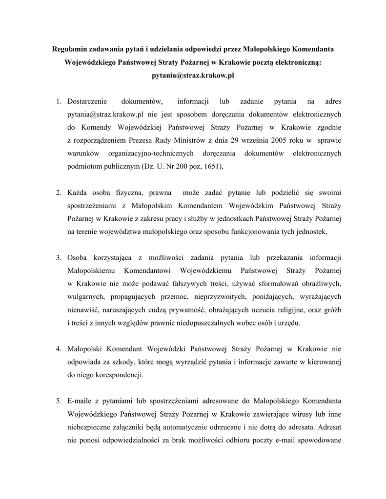 Regulamin zadawania pytań i udzielania odpowiedzi przez Małopolskiego Komendanta Wojewódzkiego Państwowej Straty Pożarnej w Krakowie pocztą elektroniczną: [email protected] 1. Dostarczenie dokumentów, informacji lub zadanie pytania na adres [email protected] nie jest sposobem doręczania dokumentów elektronicznych do Komendy Wojewódzkiej Państwowej Straży Pożarnej w Krakowie zgodnie z rozporządzeniem Prezesa Rady Ministrów z dnia 29 września 2005 roku w sprawie warunków organizacyjno-technicznych doręczania dokumentów elektronicznych podmiotom publicznym (Dz. U. Nr 200 poz, 1651), 2. Każda osoba fizyczna, prawna może zadać pytanie lub podzielić się swoimi spostrzeżeniami z Małopolskim Komendantem Wojewódzkim Państwowej Straży Pożarnej w Krakowie z zakresu pracy i służby w jednostkach Państwowej Straży Pożarnej na terenie województwa małopolskiego oraz sposobu funkcjonowania tych jednostek, 3. Osoba korzystająca z możliwości zadania pytania lub przekazania informacji Małopolskiemu Komendantowi Wojewódzkiemu Państwowej Straży Pożarnej w Krakowie nie może podawać fałszywych treści, używać sformułowań obraźliwych, wulgarnych, propagujących przemoc, nieprzyzwoitych, poniżających, wyrażających nienawiść, naruszających cudzą prywatność, obrażających uczucia religijne, oraz gróźb i treści z innych względów prawnie niedopuszczalnych wobec osób i urzędu. 4. Małopolski Komendant Wojewódzki Państwowej Straży Pożarnej w Krakowie nie odpowiada za szkody, które mogą wyrządzić pytania i informacje zawarte w kierowanej do niego korespondencji. 5. E-maile z pytaniami lub spostrzeżeniami adresowane do Małopolskiego Komendanta Wojewódzkiego Państwowej Straży Pożarnej w Krakowie zawierające wirusy lub inne niebezpieczne załączniki będą automatycznie odrzucane i nie dotrą do adresata. Adresat nie ponosi odpowiedzialności za brak możliwości odbioru poczty e-mail spowodowane przez osoby trzecie a w szczególności operatorów telekomunikacyjnych, dostawców łącz telekomunikacyjnych, i energii elektrycznej itp., 6. Odpowiedź udzielona przez Małopolskiego Komendanta Wojewódzkiego Państwowej Straży Pożarnej w Krakowie nie jest wykładnią prawa, nie rodzi skutków prawnych, nie może być wykorzystana przez adresata oraz osoby trzecie w postępowaniu administracyjnym lub sądowym. 7. Każda osoba przekazująca informację lub zadająca pytanie jest zobowiązana do podania co najmniej adresu poczty e-mailowej na który zostanie przesłana odpowiedź Małopolskiego Komendanta Wojewódzkiego Państwowej Straży Pożarnej w Krakowie 8. Dane dotyczące autora pytania lub informacji skierowanej do Małopolskiego Komendanta Wojewódzkiego Państwowej Straży Pożarnej w Krakowie służą wyłącznie do udzielenia odpowiedzi osobie zainteresowanej i nie są w żaden sposób przechowywane ani przetwarzane. 9. Małopolski Komendant Wojewódzki Państwowej Straży Pożarnej w Krakowie zastrzega sobie prawo do publikowania części lub całości zadanego pytania lub przekazanej informacji (bez podania jej autora) na stronie internetowej Komendy Wojewódzkiej Państwowej Straży Pożarnej w Krakowie wraz z ustosunkowaniem się do poruszanej tematyki oraz pisemnego przekazania tej informacji do wszystkich podległych jednostek organizacyjnych Państwowej Straży Pożarnej w województwie małopolskim.