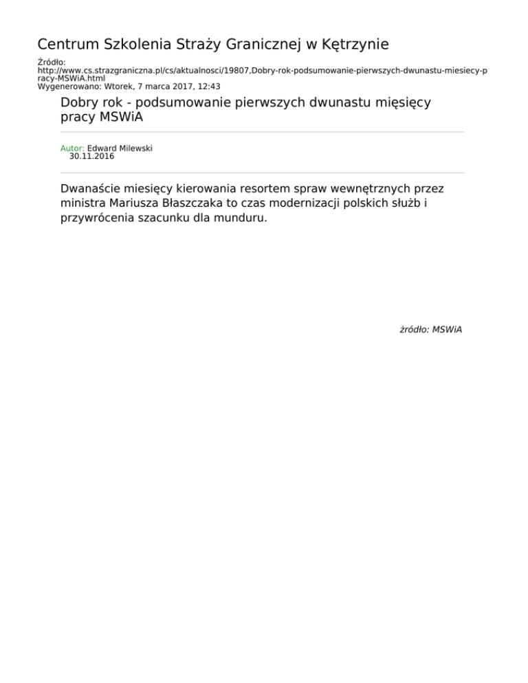 Centrum Szkolenia Straży Granicznej w Kętrzynie Źródło: http://www.cs.strazgraniczna.pl/cs/aktualnosci/19807,Dobry-rok-podsumowanie-pierwszych-dwunastu-miesiecy-p racy-MSWiA.html Wygenerowano: Wtorek, 7 marca 2017, 12:43 Dobry rok - podsumowanie pierwszych dwunastu mięsięcy pracy MSWiA Autor: Edward Milewski 30.11.2016 Dwanaście miesięcy kierowania resortem spraw wewnętrznych przez ministra Mariusza Błaszczaka to czas modernizacji polskich służb i przywrócenia szacunku dla munduru. żródło: MSWiA