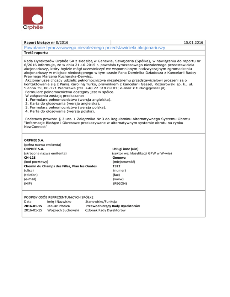 Raport bieżący nr 8/2016 15.01.2016 Powołanie tymczasowego niezależnego przedstawiciela akcjonariuszy Treść raportu Rada Dyrektorów Orphée SA z siedzibą w Genewie, Szwajcaria (Spółka), w nawiązaniu do raportu nr 6/2016 informuje, że w dniu 21.10.2015 r. powołała tymczasowego niezależnego przedstawiciela akcjonariuszy, który będzie mógł uczestniczyć we wspomnianym nadzwyczajnym zgromadzeniu akcjonariuszy w miejsce niedostępnego w tym czasie Pana Dominika Dziadosza z Kancelarii Radcy Prawnego Marzena Kucharska-Derwisz. Akcjonariusze chcący udzielić pełnomocnictwa niezależnemu przedstawicielowi proszeni są o kontaktowanie się z Panią Karoliną Turko, prawnikiem z kancelarii Gessel, Koziorowski sp. k., ul. Sienna 39, 00-121 Warszawa (tel. +48 22 318 69 01; e-mail:[email protected]). Formularz pełnomocnictwa dostępny jest w spółce. W załączeniu zostają przekazane: 1. Formularz pełnomocnictwa (wersja angielska). 2. Karta do głosowania (wersja angielska). 3. Formularz pełnomocnictwa (wersja polska). 4. Karta do głosowania (wersja polska). Podstawa prawna: § 3 ust. 1 Załącznika Nr 3 do Regulaminu Alternatywnego Systemu Obrotu "Informacje Bieżące i Okresowe przekazywane w alternatywnym systemie obrotu na rynku NewConnect" ORPHEE S.A. (pełna nazwa emitenta) ORPHEE S.A. (skrócona nazwa emitenta) CH-128 (kod pocztowy) Chemin du Champs des Filles, Plan les Ouates (ulica) (telefon) (e-mail) (NIP) Usługi inne (uin) (sektor wg. klasyfikacji GPW w W-wie) Genewa (miejscowość) 1922 (numer) (fax) (www) (REGON) PODPISY OSÓB REPREZENTUJĄCYCH SPÓŁKĘ Data Imię i Nazwisko Stanowisko/Funkcja 2016-01-15 Janusz Płocica Przewodniczący Rady Dyrektorów 2016-01-15 Wojciech Suchowski Członek Rady Dyrektorów