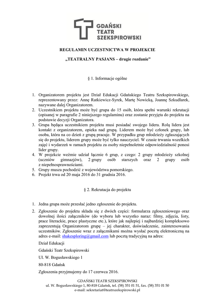 REGULAMIN UCZESTNICTWA W PROJEKCIE „TEATRALNY PASJANS – drugie rozdanie” § 1. Informacje ogólne 1. Organizatorem projektu jest Dział Edukacji Gdańskiego Teatru Szekspirowskiego, reprezentowany przez: Annę Ratkiewicz-Syrek, Martę Nowicką, Joannę Szkudlarek, nazywane dalej Organizatorem. 2. Uczestnikiem projektu może być grupa do 15 osób, która spełni warunki rekrutacji (opisanej w paragrafie 2 niniejszego regulaminu) oraz zostanie przyjęta do projektu na podstawie decyzji Organizatora. 3. Grupa będąca uczestnikiem projektu musi posiadać swojego lidera. Rolą lidera jest kontakt z organizatorem, opieka nad grupą. Liderem może być członek grupy, lub osoba, która na co dzień z grupą pracuje. W przypadku grup młodzieży zgłaszających się do projektu, liderem grupy może być tylko nauczyciel. W czasie trwania wszelkich zajęć i wydarzeń w ramach projektu za osoby niepełnoletnie odpowiedzialność ponosi lider grupy. 4. W projekcie weźmie udział łącznie 6 grup, z czego: 2 grupy młodzieży szkolnej (uczniów gimnazjów), 2 grupy osób starszych oraz 2 grupy osób z niepełnosprawnościami. 5. Grupy musza pochodzić z województwa pomorskiego. 6. Projekt trwa od 20 maja 2016 do 31 grudnia 2016. § 2. Rekrutacja do projektu 1. Jedna grupa może przesłać jedno zgłoszenie do projektu. 2. Zgłoszenie do projektu składa się z dwóch części: formularza zgłoszeniowego oraz dowolnej ilości załączników (do wyboru lub wszystko naraz: filmy, zdjęcia, listy, prace literackie, prace plastyczne etc.), które jak najlepiej i najbardziej kompleksowo zaprezentują Organizatorom grupę – jej charakter, doświadczenie, zainteresowania uczestników. Zgłoszenie wraz z załącznikami można wysłać pocztą elektroniczną na adres e-mail: [email protected] lub pocztą tradycyjną na adres: Dział Edukacji Gdański Teatr Szekspirowski Ul. W. Bogusławskiego 1 80-818 Gdańsk Zgłoszenia przyjmujemy do 17 czerwca 2016. GDAŃSKI TEATR SZEKSPIROWSKI ul. W. Bogusławskiego 1, 80-818 Gdańsk, tel. (58) 351 01 51, fax. (58) 351 01 50 e-mail: [email protected] 3. Jeśli grupa zdecyduje się wysłać film - może on być fragmentem spektaklu/próby lub kompilacją powyższych, może też być przygotowany specjalnie na potrzeby zgłoszenia i zostać wykonany dowolnym urządzeniem rejestrującym video, także aparatem lub telefonem komórkowym. Prosimy o przesłanie linku do filmu, który został zamieszczony na portalu YouTube lub Vimeo. Linki zamieszczone na innych portalach lub na serwerach nie będą brane pod uwagę przy ocenie zgłoszeń. Film można także wysłać na płycie CD/DVD pocztą tradycyjną. 4. Formularz zgłoszeniowy wypełniony przez lidera grupy należy przesłać do dnia 17 czerwca 2016 na adres e-mail: [email protected]. Aby uniknąć problemów technicznych z dostarczeniem wiadomości, w ciągu 24 godzin od przesłania formularza przez lidera, Organizator prześle na adres e-mail nadawcy potwierdzenie o otrzymaniu zgłoszenia. W przypadku nie otrzymania takiego potwierdzenia, lider grupy ma obowiązek skontaktować się z Organizatorem i potwierdzić, czy formularz został dostarczony. Organizator nie ponosi odpowiedzialności za niedostarczenie formularza. 5. Wszystkie materiały, które grupa chce wysłać pocztą, muszą zostać wysłane najpóźniej 17 czerwca 2016 przesyłką priorytetową. 6. Grupy zostaną poinformowane o wynikach rekrutacji drogą telefoniczną lub za pomocą poczty e-mail. § 3. Regulamin udziału w projekcie 1. Udział w Projekcie jest bezpłatny. Podczas szkolenia liderów i spektakli finałowych w GTS organizator zapewnia wyżywienie. Organizator nie zapewnia transportu dla liderów w ramach szkolenia dla liderów 15 lipca 2016. W pozostałych wydarzeniach w Projekcie (jak przyjazd na spektakle), jeśli Organizator zapewnia transport, w gestii Organizatora leży decyzja dotycząca usługodawcy. 2. Grupa, która zostanie uczestnikiem projektu ma obowiązek wziąć udział we wszystkich wydarzeniach zaplanowanych w projekcie, ze szczególnym uwzględnieniem: - uczestnictwa lidera lub zastępcy w szkoleniu integracyjnym z udziałem ekspertów w Gdańsku (15 lipca 2016), - odbycia z grupą cyklu spotkań z ekspertem prowadzącym grupę w swoim środowisku lokalnym (w wymiarze 20 godzin). - przygotowania spektaklu, o którym mowa w punkcie 5 niniejszego paragrafu, - zaprezentowania spektaklu w społeczności lokalnej (np. w pobliskim domu kultury, bibliotece itp.) - zaprezentowania spektaklu w ramach przeglądu w dniach 29-30 listopada 2016 w Gdańskim Teatrze Szekspirowskim. GDAŃSKI TEATR SZEKSPIROWSKI ul. W.Bogusławskiego1, 80-818 Gdańsk, tel. (58) 351 01 51, fax (58) 351 01 50 e-mail: [email protected] 3. Nie wywiązanie się z powyższych zobowiązań skutkuje bezterminowym brakiem możliwości korzystania z darmowej oferty edukacyjnej Gdańskiego Teatru Szekspirowskiego. 4. Grupa musi mieć możliwość przyjąć eksperta w jakiejś przestrzeni, która nadaje się do pracy nad spektaklem. Może to być sala lekcyjna, sala warsztatowa, większe pomieszczenie, lokalna scena. W zależności od ilości osób w grupie, różne są wymagania dot. przestrzeni. Prosimy jednak wziąć pod uwagę, iż Organizator nie będzie w stanie zapewnić Państwu sali na warsztaty w Państwa miejscowości. 5. Spektakl przygotowywany przez każdą z grup teatralnych stworzony zostanie na podstawie jednego z dwóch tekstów: „Balladyna” Juliusza Słowackiego lub „Boska komedia” Dantego Alighieri. Teksty, nad którymi będzie pracować dana grupa, wybiera Organizator na podstawie zgłoszeń grupy. 6. Eksperta, z którym będzie pracować dana grupa, wybiera i przypisuje grupie Organizator na podstawie zgłoszeń grupy. GDAŃSKI TEATR SZEKSPIROWSKI ul. W.Bogusławskiego1, 80-818 Gdańsk, tel. (58) 351 01 51, fax (58) 351 01 50 e-mail: [email protected]