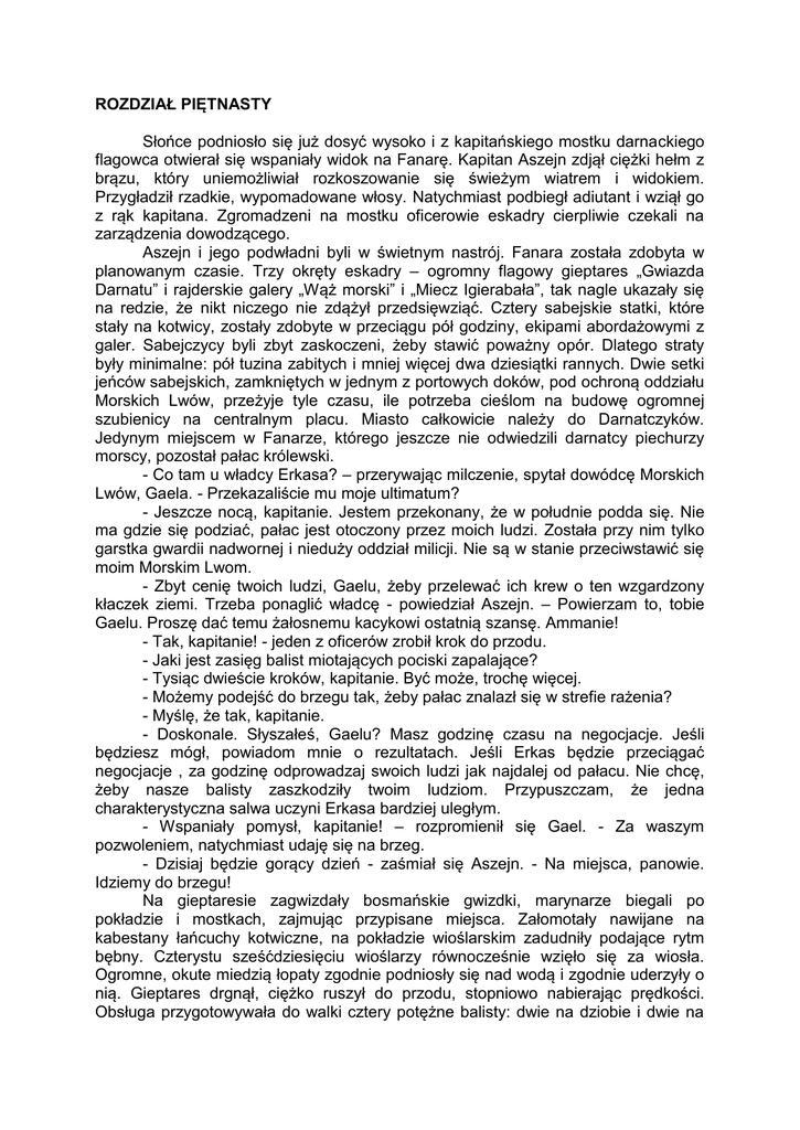 ROZDZIAŁ PIĘTNASTY Słońce podniosło się już dosyć wysoko i z kapitańskiego mostku darnackiego flagowca otwierał się wspaniały widok na Fanarę. Kapitan Aszejn zdjął ciężki hełm z brązu, który uniemożliwiał rozkoszowanie się świeżym wiatrem i widokiem. Przygładził rzadkie, wypomadowane włosy. Natychmiast podbiegł adiutant i wziął go z rąk kapitana. Zgromadzeni na mostku oficerowie eskadry cierpliwie czekali na zarządzenia dowodzącego. Aszejn i jego podwładni byli w świetnym nastrój. Fanara została zdobyta w planowanym czasie. Trzy okręty eskadry – ogromny flagowy gieptares „Gwiazda Darnatu” i rajderskie galery „Wąż morski” i „Miecz Igierabała”, tak nagle ukazały się na redzie, że nikt niczego nie zdążył przedsięwziąć. Cztery sabejskie statki, które stały na kotwicy, zostały zdobyte w przeciągu pół godziny, ekipami abordażowymi z galer. Sabejczycy byli zbyt zaskoczeni, żeby stawić poważny opór. Dlatego straty były minimalne: pół tuzina zabitych i mniej więcej dwa dziesiątki rannych. Dwie setki jeńców sabejskich, zamkniętych w jednym z portowych doków, pod ochroną oddziału Morskich Lwów, przeżyje tyle czasu, ile potrzeba cieślom na budowę ogromnej szubienicy na centralnym placu. Miasto całkowicie należy do Darnatczyków. Jedynym miejscem w Fanarze, którego jeszcze nie odwiedzili darnatcy piechurzy morscy, pozostał pałac królewski. - Co tam u władcy Erkasa? – przerywając milczenie, spytał dowódcę Morskich Lwów, Gaela. - Przekazaliście mu moje ultimatum? - Jeszcze nocą, kapitanie. Jestem przekonany, że w południe podda się. Nie ma gdzie się podziać, pałac jest otoczony przez moich ludzi. Została przy nim tylko garstka gwardii nadwornej i nieduży oddział milicji. Nie są w stanie przeciwstawić się moim Morskim Lwom. - Zbyt cenię twoich ludzi, Gaelu, żeby przelewać ich krew o ten wzgardzony kłaczek ziemi. Trzeba ponaglić władcę - powiedział Aszejn. – Powierzam to, tobie Gaelu. Proszę dać temu żałosnemu kacykowi ostatnią szansę. Ammanie! - Tak, kapitanie! - jeden z oficerów zrobił krok do przodu. - Jaki jest zasięg balist miotających pociski zapalające? - Tysiąc dwieście kroków, kapitanie. Być może, trochę więcej. - Możemy podejść do brzegu tak, żeby pałac znalazł się w strefie rażenia? - Myślę, że tak, kapitanie. - Doskonale. Słyszałeś, Gaelu? Masz godzinę czasu na negocjacje. Jeśli będziesz mógł, powiadom mnie o rezultatach. Jeśli Erkas będzie przeciągać negocjacje , za godzinę odprowadzaj swoich ludzi jak najdalej od pałacu. Nie chcę, żeby nasze balisty zaszkodziły twoim ludziom. Przypuszczam, że jedna charakterystyczna salwa uczyni Erkasa bardziej uległym. - Wspaniały pomysł, kapitanie! – rozpromienił się Gael. - Za waszym pozwoleniem, natychmiast udaję się na brzeg. - Dzisiaj będzie gorący dzień - zaśmiał się Aszejn. - Na miejsca, panowie. Idziemy do brzegu! Na gieptaresie zagwizdały bosmańskie gwizdki, marynarze biegali po pokładzie i mostkach, zajmując przypisane miejsca. Załomotały nawijane na kabestany łańcuchy kotwiczne, na pokładzie wioślarskim zadudniły podające rytm bębny. Czterystu sześćdziesięciu wioślarzy równocześnie wzięło się za wiosła. Ogromne, okute miedzią łopaty zgodnie podniosły się nad wodą i zgodnie uderzyły o nią. Gieptares drgnął, ciężko ruszył do przodu, stopniowo nabierając prędkości. Obsługa przygotowywała do walki cztery potężne balisty: dwie na dziobie i dwie na rufie. Obnażeni do pasa artylerzyści pokładowi, stękając z wysiłku, obracali dźwignie mechanizmów bojowych, polewali olejem naprowadzające wyżłobienia. Z ładowni, z bronią, wyciągano pociski miotające – ciężkie, opierzone strzały, długie na sześć łokci i kosze, w których leżały dokładnie owinięte wojłokiem, granaty z pirocieczą. Na dolnym pokładzie, poza zasięgiem wzroku Aszejna, przygotowywało się do walki jeszcze osiem mniejszych balist, ale był przekonany, że załoga Ammana, bardzo szybko pośle druzgocącą salwę w pałac władców Orgiełły. Uśmiech zadowolenia zagościł pod jego siwym wąsem. Gieptares powoli i majestatycznie szedł do brzegu. Jego śladem podążała galera „Miecz Igierabała”. Tymczasem, „Wąż morski” skierował się do wyjścia z portu. Ich zadaniem było uniemożliwienie barkasom wypłynięcie z Fanary. Najwyższy także czas, by pomyśleć o wysłaniu zwycięskiego raportu do Admiralicji. Gdy uderzono w dzwon okrętowy, na mostku zjawił się służący. Aszejn wziął z tacy srebrny puchar z ponczem, upił łyk. - Kurs bojowy! – rozkazał półgłosem. Bębny na wioślarskim pokładzie zadudniły szybciej. Gieptares nabierał prędkości i brzeg stawał się coraz bliższy. Aszejn już mógł dostrzec na przystani zastygłe figury mieszkańców miasta, którzy śledzili zbliżanie się darnackich statków. Domyślał się, jakie uczucia nimi targają. Są przestraszeni. Nigdy nie widzieli nic podobnego i wątpliwe, czy jeszcze kiedykolwiek zobaczą. Takie widowisko, powinno narzucać strach, nawet bogom. - Godzina minęła - powiedział, zwracając się ni to do służącego, ni to do tkwiącego obok adiutanta, ni to do drewnianej figurki Igierabała na ołtarzu w centralnym punkcie mostka. - Są jakieś wieści od Gaela? - Nie, mój panie - odpowiedział adiutant. - Otworzyć ogień! – polecił wciąż tym samym spokojnym tonem. Zadudniły balisty, zgodnie wyrzuciły pociski z pirocieczą. Minęło kilka sekund i zobaczył, jak zza drzew i dachów domów Fanary, podnosi się ogromny obłok czarnego dymu. ***************** Wszyscy, wolni od wachty, marynarze „Jerzyka” zebrali się na dziobie statku. Był tu także kapitan Fasis. Kasta podeszła do niego i zaniepokoiła się wyrazem twarzy kapitana. - Co się stało? - Nie wiem. Ale mi się to nie podoba. Nie taki wyobrażałem sobie nasz powr