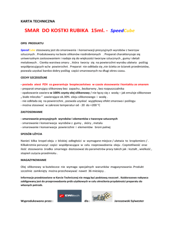 KARTA TECHNICZNA SMAR DO KOSTKI RUBIKA 15ml. - SpeedCube OPIS PRODUKTU SpeedCube stosowany jest do smarowania i konserwacji precyzyjnych wyrobów z tworzyw sztucznych . Produkowany na bazie silikonów rozdrobnionych . Preparat charakteryzuje się uniwersalnym zastosowaniem i nadaje się do większości tworzyw sztucznych , gumy i detali metalowych . Cienka warstwa smaru , która tworzy się na powierzchni wyrobu ułatwia poślizg współpracujących w/w powierzchni . Preparat nie odkłada się ,nie ścieka ze ścianek przedmiotów, pozwala uzyskać bardzo dobry poślizg części smarowanych na długi okres czasu. CECHY SZCZEGÓLNE - posiada atest PZH co gwarantuje bezpieczeństwo w czasie stosowania i kontaktu ze smarem - preparat smarujący silikonowy bez zapachu , bezbarwny , bez rozpuszczalnika - opakowanie zawiera w 100% czysty olej silikonowy / nie łączy się z wodą – jak emulsje silikonowe „ białe mleczko ” zawierające ok.30% oleju silikonowego i wodę . - nie odkłada się na powierzchni , pozwala uzyskać wyjątkowy efekt smarowa i poślizgu - można stosować w zakresie temperatur od - 20 do +200 °C ZASTOSOWANIE - smarowanie precyzyjnych wyrobów i elementów z tworzyw sztucznych - smarowanie i konserwacja wyrobów z gumy , skóry , metalu - smarowanie i konserwacja powierzchni i elementów broni palnej SPOSÓB UŻYCIA Nanieś kilka kropel oleju z bliskiej odległości w wymagane miejsce / ułatwia to kroplomierz / . Kilkakrotnie poruszyć części współpracujące w celu rozprowadzenia oleju . Częstotliwość oraz ilość stosowania środka smarnego dostosować do parametrów pracy takich jak : kształt , wielkość , stopień zużycia przedmiotu . MAGAZYNOWANIE Olej silikonowy w buteleczce nie wymaga specjalnych warunków magazynowania .Produkt szczelnie zamknięty można przechowywać nawet 36 miesięcy . Informacje przedstawione w Karcie Technicznej nie mogą być podstawą roszczeń . Każdorazowo nabywca zobligowany jest do przeprowadzenia prób użytkowych w celu określenia przydatności preparatu do własnych potrzeb. Wyprodukowano przez : dla : Jaroszewski Sylwester