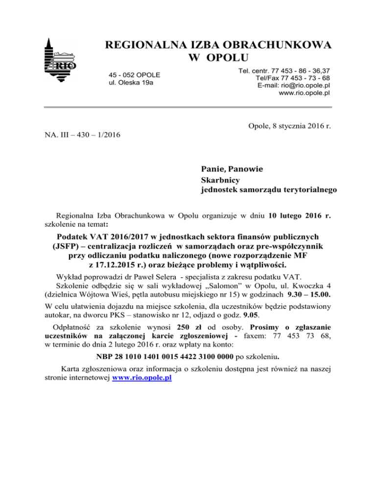 REGIONALNA IZBA OBRACHUNKOWA W OPOLU 45 - 052 OPOLE ul. Oleska 19a Tel. centr. 77 453 - 86 - 36,37 Tel/Fax 77 453 - 73 - 68 E-mail: [email protected] www.rio.opole.pl Opole, 8 stycznia 2016 r. NA. III – 430 – 1/2016 Panie, Panowie Skarbnicy jednostek samorządu terytorialnego Regionalna Izba Obrachunkowa w Opolu organizuje w dniu 10 lutego 2016 r. szkolenie na temat: Podatek VAT 2016/2017 w jednostkach sektora finansów publicznych (JSFP) – centralizacja rozliczeń w samorządach oraz pre-współczynnik przy odliczaniu podatku naliczonego (nowe rozporządzenie MF z 17.12.2015 r.) oraz bieżące problemy i wątpliwości. Wykład poprowadzi dr Paweł Selera - specjalista z zakresu podatku VAT. Szkolenie odbędzie się w sali wykładowej „Salomon” w Opolu, ul. Kwoczka 4 (dzielnica Wójtowa Wieś, pętla autobusu miejskiego nr 15) w godzinach 9.30 – 15.00. W celu ułatwienia dojazdu na miejsce szkolenia, dla uczestników będzie podstawiony autokar, na dworcu PKS – stanowisko nr 12, odjazd o godz. 9.05. Odpłatność za szkolenie wynosi 250 zł od osoby. Prosimy o zgłaszanie uczestników na załączonej karcie zgłoszeniowej - faxem: 77 453 73 68, w terminie do dnia 2 lutego 2016 r. oraz wpłaty na konto: NBP 28 1010 1401 0015 4422 3100 0000 po szkoleniu. Karta zgłoszeniowa oraz informacja o szkoleniu dostępna jest również na naszej stronie internetowej www.rio.opole.pl Program szkolenia dla skarbników w dniu 10.02.2016 r.: Podatek VAT 2016/2017 w jednostkach sektora finansów publicznych (JSFP) – centralizacja rozliczeń w samorządach oraz pre-współczynnik przy odliczaniu podatku naliczonego (nowe rozporządzenie MF z 17.12.2015 r.) oraz bieżące problemy i wątpliwości. Celem szkolenia jest analiza specyfiki funkcjonowania VAT w obszarze j.s.t., ze szczególnym uwzględnieniem zmian obowiązujących od 1 stycznia 2016 r. (pre-współczynnik). W kontekście pre-współczynnika przedmiotem zajęć będzie zwłaszcza analiza nowego Rozporządzenia Ministra Finansów uszczegóławiającego metody kalkulacji prewspółczynnika dla niektórych podatników. Przedstawiony zostanie także zakres centralizacji rozliczeń VAT w samorządach mający obowiązywać obowiązkowo od 1.1.2017 r. I. JSFP a status podmiotowy VAT – CENTRALIZACJA ROZLICZEŃ VAT 1. Gmina jako podatnik VAT a status urzędu (podwójna rejestracja na VAT?) 2. Zakład budżetowy jako podatnika VAT? – uchwała NSA z 26 października 2015 r. sygn. akt I FPS 4/15 3. Jednostka budżetowa nie jest odrębnym podatnikiem VAT (Wyrok TSUE z 29 września 2015 r. w sprawie C-276/14, Gmina Wrocław przeciwko Ministrowi Finansów) 4. JST a spółki komunalne – wzajemne relacje. 5. Komunikaty MF dotyczące centralizacji rozliczeń VAT w samorządach po wyroku w sprawie Gmina Wrocław przeciwko MF - jakich podmiotów dotyczy centralizacja? - od kiedy jest obowiązkowa? - dobrowolność centralizacji - centralizacja w „w przód” a korygowanie przeszłych rozliczeń. II. Proporcja VAT 1. Prymat alokacji bezpośredniej a subiektywne trudności podatnika z tym związane. 2. Optymalizacja alokacji bezpośredniej – daleko idąca alokacja bezpośrednia (podział podatku naliczonego w ramach pojedynczej faktury). 3. Proporcja – metodologia ustalania proporcji, licznik i mianownik proporcji. 4. Czynności nie uwzględnienie w proporcji. 5. Refakturowania a proporcja VAT. 6. Czynności niepodlegające VAT a proporcja – uchwała NSA z 2011 r. 7. Proporcja wstępna i ostateczna. III. „Prewspółczynnik” i Korekta – zmiany od 1 stycznia 2016 r. Koncepcja „prewspółczynnika” – podział podatku naliczonego. 1. Podział podatku naliczonego pomiędzy różne sfery (sfera działalności gospodarczej i sfera poza tą działalnością – publiczna). - czym jest sfera nie będąca działalnością gospodarczą? - jak traktować dotacje i subwencje? - czy należy różnicować dotacje z uwagi na ich specyfikę? - dotacje mieszane a prewspółczynnik. 2. „Prewspółczynnik” a alokacja bezpośrednia ? 3. Metody ustalania „prewspółczynnika” – analiza proponowanych kluczy podziału. 4. Korekta „prewspółczynnika” IV. Szczegółowe metody podziału i wzory pre-współczynnika w nowym Rozporządzeniu Ministra Finansów z 17.12.2015 (1.1.2016) 1. Jednostki samorządu terytorialnego proporcję ustalają odrębnie dla każdej z jednostek organizacyjnych jednostki samorządu terytorialnego (konsekwencje, zakres zastosowania) 2. Zakres podmiotowy rozporządzenia (jakich podmiotów dotyczy?) 2 3. Objaśnienie pojęć i definicji zawartych w rozporządzeniu. 4. Omówienie poszczególnych wzorów pre-współczynnika i ich części składowych: - wzór proporcji w urzędzie obsługującym jednostkę samorządu terytorialnego - wzór proporcji w przypadku jednostki budżetowej - wzór proporcji w przypadku zakładu budżetowego - przychody (dochody) niewliczane do proporcji - wzór proporcji w przypadku samorządowej instytucji kultury - wzór proporcji w przypadku państwowej instytucji kultury - wzór proporcji w przypadku uczelni publicznej. V. Bieżące wybrane problemy i wątpliwości interpretacyjne 1. Obowiązek podatkowy a) Moment dokonania dostawy i moment wykonania usługi jako wyznaczniki momentu powstania obowiązku podatkowego b) Dotacje, subwencje i dopłaty a obowiązek podatkowy c) Kredyty i pożyczki a obowiązek podatkowy d) Media – moment wystawienia faktury a obowiązek podatkowy e) Usługi budowlane – wystawienie faktury a pojęcie wykonania usługi budowlanej f) Aporty a obowiązek podatkowy g) Wywłaszczenie za odszkodowaniem a obowiązek podatkowy h) Zaliczki, przedpłaty i zadatki a obowiązek podatkowy 2. Nieruchomości i towary używane a) Pierwsze zasiedlenie – pojęcie i zakres w kontekście wyroku NSA z października 2014 r. b) Użytkowanie wieczyste i jego rozliczanie oraz dokumentacja c) Najem nieruchomości i media d) Zwolnienie dla dostawy towarów używanych po 1.1.2014 