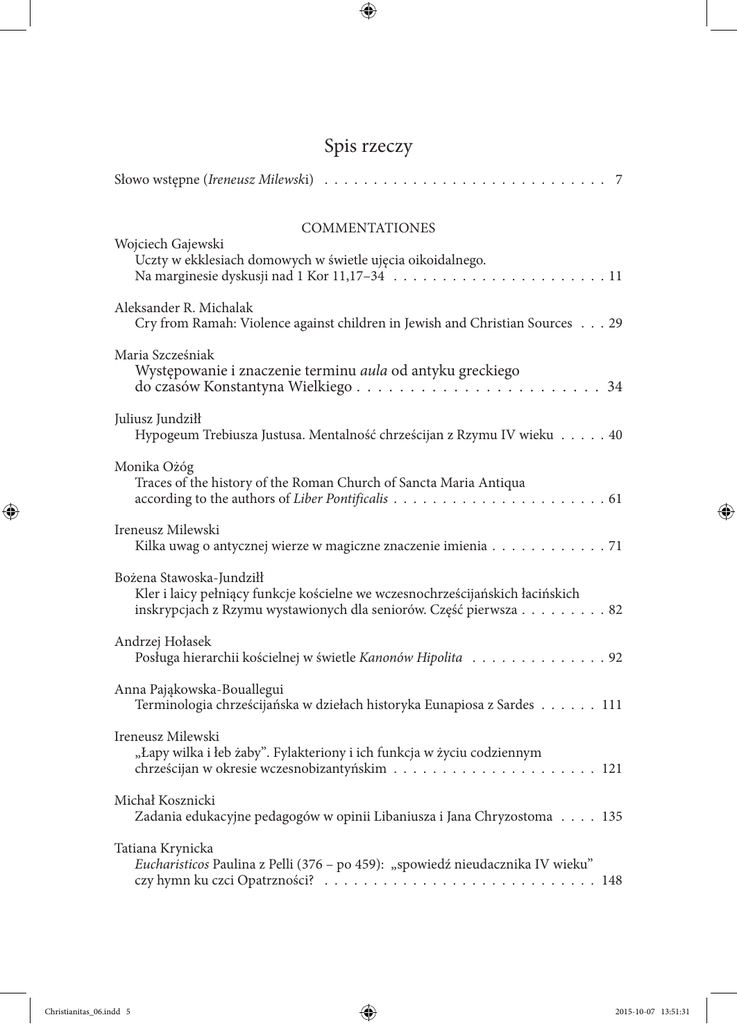 Spis rzeczy Słowo wstępne (Ireneusz Milewski) . . . . . . . . . . . . . . . . . . . . . . . . . . . . . 7 COMMENTATIONES Wojciech Gajewski Uczty w ekklesiach domowych w świetle ujęcia oikoidalnego. Na marginesie dyskusji nad 1 Kor 11,17–34 . . . . . . . . . . . . . . . . . . . . . . 11 Aleksander R. Michalak Cry from Ramah: Violence against children in Jewish and Christian Sources ���������29 Maria Szcześniak Występowanie i znaczenie terminu aula od antyku greckiego do czasów Konstantyna Wielkiego . . . . . . . . . . . . . . . . . . . . . . . .34 Juliusz Jundziłł Hypogeum Trebiusza Justusa. Mentalność chrześcijan z Rzymu IV wieku . . . . . 40 Monika Ożóg Traces of the history of the Roman Church of Sancta Maria Antiqua according to the authors of Liber Pontificalis . . . . . . . . . . . . . . . . . . . . . . 61 Ireneusz Milewski Kilka uwag o antycznej wierze w magiczne znaczenie imienia . . . . . . . . . . . . 71 Bożena Stawoska‑Jundziłł Kler i laicy pełniący funkcje kościelne we wczesnochrześcijańskich łacińskich inskrypcjach z Rzymu wystawionych dla seniorów. Część pierwsza . . . . . . . . . 82 Andrzej Hołasek Posługa hierarchii kościelnej w świetle Kanonów Hipolita . . . . . . . . . . . . . . 92 Anna Pająkowska‑Bouallegui Terminologia chrześcijańska w dziełach historyka Eunapiosa z Sardes . . . . . . .111 Ireneusz Milewski „Łapy wilka i łeb żaby”. Fylakteriony i ich funkcja w życiu codziennym chrześcijan w okresie wczesnobizantyńskim . . . . . . . . . . . . . . . . . . . . . .121 Michał Kosznicki Zadania edukacyjne pedagogów w opinii Libaniusza i Jana Chryzostoma . . . . .135 Tatiana Krynicka Eucharisticos Paulina z Pelli (376– po 459): „spowiedź nieudacznika IV wieku” czy hymn ku czci Opatrzności? . . . . . . . . . . . . . . . . . . . . . . . . . . . . .148 Christianitas_06.indd 5 2015‑10‑07 13:51:31 6 Spis rzeczy Paweł Filipczak Przełom konstantyński i funkcjonowanie administracji rzymskiej w Syrii . . . . .163 Maciej Wojcieszak Obraz społeczeństwa Italii w listach Ambrożego z Mediolanu . . . . . . . . . . . .177 Mirosław J. Leszka Wątki religijne w propagandzie wczesnobizantyńskich uzurpatorów. Przypadek Illusa i Leoncjusza (484) . . . . . . . . . . . . . . . . . . . . . . . . . . .188 Teresa Wolińska Sympatyk pogan i heretyków? Prokopiusz z Cezarei o polityce religijnej Justyniana . . . . . . . . . . . . . . . . . . . . . . . . . . . . . . . . . . . . . . . . .194 Ireneusz Milewski Antyczne prywatne uroczystości kommemoratywne praktykowane przez chrześcijan w okresie wczesnobizantyńskim . . . . . . . . . . . . . . . . . .212 FONTES Jan Iluk Jana Chryzostoma homilia trzecia z cyklu 21 homilii Do Antiocheńczyków o posągach . . . . . . . . . . . . . . . . . . . . . . . . . . . . .229 CENSURAE LIBRORUM Jan Prostko‑Prostyński, Roma‑solium Imperii. Elekcja, koronacja i uznanie w Rzymie w IV–VIII wieku, Wydawnictwo Contact, Poznań 2014, ss. 171 [Bibliotheca Classica et Byzantina] (Mirosław J. Leszka) . . . . . . . . . . . . . . . . . .251 Marcin Wołoszyn, Theophylaktos Simokates und die Slawen am Ende des westlichen Ozeans – die Erste Erwähnung der Ostseeslawen? Zum Bild der Slawen in der frühbyzantinischen Literatur. Eine Fallstudien / Teofilakt Simokatta i Słowianie znad brzegu Oceanu Zachodniego – najstarsze świadectwo obecności Słowian nad Bałtykiem? Przyczynek do studiów nad obrazem Słowian w literaturze wczesnobizantyńskiej, Instytut Archeologii i Etnologii Polskiej Akademii Nauk, Kraków 2014, ss. 202 (Mirosław J. Leszka) . . . . . . . . . . . . . . . . . . . . . . . . . .257 Andrzej Kompa, Mirosław J. Leszka, Teresa Wolińska, Mieszkańcy stolicy świata. Konstantynopolitańczycy między starożytnością a średniowieczem, „Byzantina Lodziensia” XVII, Wydawnictwo Uniwersytetu Łódzkiego, Łódź 2014, ss. 490 (Andrzej Hołasek) . . . . . . . . . . . . . . . . . . . . . . . . . . . .260 Skróty edycji wydawniczych (źródłowych, encyklopedycznych, leksykonów) . . . . .270 Christianitas_06.indd 6 2015‑10‑07 13:51:32