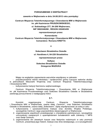 POROZUMIENIE O WSPÓŁPRACY zawarte w Wejherowie w dniu 24.08.2012 roku pomiędzy: Centrum Wsparcia Teleinformatycznego i Dowodzenia MW w Wejherowie im. płk Kazimierza PRUSZKOWSKIEGO, ul. Sobieskiego 277, 84-200 Wejherowo, NIP 5882246288 , REGON 220483459 reprezentowanym przez: Komendanta Centrum Wsparcia Teleinformatycznego i Dowodzenia MW w Wejherowie komandora Romana KREFTA a Sołectwem Strzebielino Osiedle ul. Handlowa 4, 84-220 Strzebielino reprezentowanym przez: Sołtysa Sołectwa Strzebielino Osiedle Grzegorza MAZIUKA Mając na względzie zapewnienie warunków współpracy w zakresie: - popularyzowania wśród młodzieży i społeczności gminy Łęczyce walorów służby w jednostkach Marynarki Wojennej oraz Centrum Wsparcia Teleinformatycznego i Dowodzenia MW; - kultywowania tradycji Garnizonu wejherowskiego; Centrum Wsparcia Teleinformatycznego i Dowodzenia MW w Wejherowie im. płk Kazimierza Pruszkowskiego oraz Sołectwo Strzebielino Osiedle w Strzebielinie zawierają porozumienie o następującej treści: § 1. Komórki organizacyjne Centrum Wsparcia Teleinformatycznego i Dowodzenia MW w Wejherowie, zwane dalej „Centrum”, oraz Sołectwo Strzebielino Osiedle w Strzebielinie, zwana dalej „Sołectwem”, będą współpracować ze sobą w celu: 1. kultywowania i upowszechniania tradycji oraz dorobku Wojska Polskiego, szczególnie Centrum i jego poprzedników stacjonujących w Wejherowie; 2. organizowania wspólnych przedsięwzięć o charakterze patriotycznym, szczególnie uroczystości związanych z upamiętnianiem bohaterskich walk żołnierzy 1 MPS oraz świąt Centrum; 3. organizowania dni otwartych koszar oraz festynów rodzinnych w celu promocji Centrum, prezentacji jego historii, tradycji oraz dnia dzisiejszego, a w szczególności 1 4. 5. 6. 7. 8. udziału jego żołnierzy w ćwiczeniach na szczeblu Marynarki Wojennej i Sił Zbrojnych, a także służących w kontyngentach międzynarodowych; upamiętniania miejsc pamięci narodowej związanych z walką o wolność i niepodległość Polski; podtrzymywania więzi i solidarności weteranów, byłych żołnierzy zawodowych oraz sympatyków wojska z żołnierzami służącymi w Centrum; popularyzacji oraz upowszechnienia dorobku Centrum i jego poprzedników; popularyzowania wizerunku dowódców Centrum; ochrony czci, godności i honoru żołnierza polskiego oraz integrowania środowiska żołnierskiego ze środowiskiem cywilnym. § 2. Sołectwo Strzebielino Osiedle w Strzebielinie zobowiązuje się do: 1. konsultowania z Komendantem Centrum przedsięwzięć promujących i popularyzujących bieżącą działalność Centrum, Marynarki Wojennej oraz Sił Zbrojnych Rzeczypospolitej Polskiej w rejonie stacjonowania jednostki; 2. upowszechniania patriotycznych postaw oraz historii i tradycji oręża polskiego, między innymi poprzez nawiązywanie i utrzymywanie kontaktów ze szkołami; 3. przywracania pamięci i upamiętniania osób, wydarzeń mających miejsce w przeszłości na terenie Ziemi Wejherowskiej, Pomorza, a związanych z historią kraju i jednostki w okresie międzywojennym, czasach wojennych i powojennych; 4. przekazywania eksponatów o charakterze patriotycznym do Sali Tradycji Centrum; 5. udziału w uroczystościach patriotycznych, a także pokazach i ćwiczeniach wojskowych, szczególnie organizowanych przez Marynarkę Wojenną i Centrum; 6. współdziałania z Komendantem Centrum w przygotowaniu i prowadzeniu spraw związanych z obchodami rocznic i świąt Centrum, Marynarki Wojennej oraz uroczystości o charakterze państwowym; 7. ubezpieczania od następstw nieszczęśliwych wypadków i odpowiedzialności cywilnej cywilnych uczestników realizowanych wspólnych przedsięwzięć organizowanych na terenie i w obiektach Centrum. § 3. Centrum zobowiązuje się udzielić Sołectwu pomocy w prowadzeniu działalności związanej popularyzacją historii, patriotyzmu i wizerunku Sił Zbrojnych RP wśród społeczności Strzebielina, w szczególności poprzez: 1. udostępnienie nieruchomości, pomieszczeń – na podstawie uprzedniej umowy – zawartej z szefem właściwego terytorialnie zarządu infrastruktury; 2. udostępnienie sprzętu i środków łączności, w miarę możliwości, na podstawie umów cywilno – prawnych zawartych zgodnie z następującymi zasadami: a. udostępnione mienie może być wykorzystane wyłącznie do realizacji celów zawartych w planie współpracy, o którym mowa w § 4; b. Sołectwo ponosi zwykłe koszty eksploatacyjne udostępnionego mienia oraz refunduje Centrum poniesione z tego tytułu wydatki; c. wszelkie zawinione straty zaistniałe w udostępnionym mieniu Sołectwo pokrywa z własnych środków; 3. popularyzowanie działalności Sołectwa, w miarę możliwości, w publikacjach Centrum; 4. wsparcie logistyczne przedsięwzięć realizowanych w celu promocji służby wojskowej i służby w Narodowych Siłach Rezerwowych. 2 § 4. Sołectwo i upoważniona przez Komendanta Centrum komórka organizacyjna będą uzgadniać, do dnia 30 sierpnia każdego roku, plan wspólnych przedsięwzięć na kolejny rok kalendarzowy oraz będą corocznie dokonywać oceny efektów współpracy. § 5. Strony porozumienia nie ponoszą wobec siebie odpowiedzialności cywilnej za zdarzenia, które wystąpią podczas lub w związku z realizacją porozumienia, z zastrzeżeniem § 3 pkt 2 lit. c. § 6. Porozumienie nie powoduje dodatkowych wydatków z budżetu Centrum Wsparcia Teleinformatycznego i Dowodzenia MW w Wejherowie. § 7. Sołectwo zobowiązuje się do informowania o wszystkich zdarzeniach mogących mieć wpływ na ze szczególnym uwzględnieniem § 12. Komendanta Centrum realizację porozumienia, § 8. W sprawach nie uregulowanych w porozumieniu mają zastosowanie postanowienia przedstawione w Decyzji Nr 187/MON Ministra Obrony Narodowej z dnia 9 czerwca 2009r. w sprawie wprowadzenia zasad współpracy resortu obrony narodowej z organizacjami pozarządowymi i innymi partnerami społecznymi 