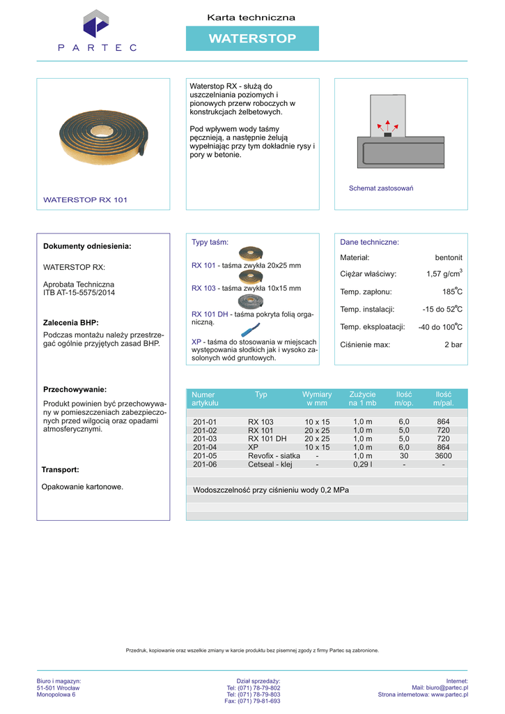 Karta techniczna P A R T E C WATERSTOP Waterstop RX - służą do uszczelniania poziomych i pionowych przerw roboczych w konstrukcjach żelbetowych. Pod wpływem wody taśmy pęcznieją, a następnie żelują wypełniając przy tym dokładnie rysy i pory w betonie. Schemat zastosowań WATERSTOP RX 101 Dokumenty odniesienia: Dane techniczne: Typy taśm: Materiał: WATERSTOP RX: RX 101 - taśma zwykła 20x25 mm Aprobata Techniczna ITB AT-15-5575/2014 RX 103 - taśma zwykła 10x15 mm Przechowywanie: Produkt powinien być przechowywany w pomieszczeniach zabezpieczonych przed wilgocią oraz opadami atmosferycznymi. XP - taśma do stosowania w miejscach występowania słodkich jak i wysoko zasolonych wód gruntowych. Numer artykułu 201-01 201-02 201-03 201-04 201-05 201-06 Typ RX 103 RX 101 RX 101 DH XP Revofix - siatka Cetseal - klej 1,57 g/cm Temp. zapłonu: RX 101 DH - taśma pokryta folią organiczną. Podczas montażu należy przestrzegać ogólnie przyjętych zasad BHP. Opakowanie kartonowe. 3 Ciężar właściwy: Zalecenia BHP: Transport: bentonit 185 C Temp. instalacji: -15 do 52 C Temp. eksploatacji: -40 do 100 C 2 bar Ciśnienie max: Wymiary w mm Zużycie na 1 mb Ilość m/op. Ilość m/pal. 10 x 15 20 x 25 20 x 25 10 x 15 - 1,0 m 1,0 m 1,0 m 1,0 m 1,0 m 0,29 l 6,0 5,0 5,0 6,0 30 - 864 720 720 864 3600 - Wodoszczelność przy ciśnieniu wody 0,2 MPa Przedruk, kopiowanie oraz wszelkie zmiany w karcie produktu bez pisemnej zgody z firmy Partec są zabronione. Biuro i magazyn: 51-501 Wrocław Monopolowa 6 Dział sprzedaży: Tel: (071) 78-79-802 Tel: (071) 78-79-803 Fax: (071) 79-81-693 Internet: Mail: [email protected] Strona internetowa: www.partec.pl