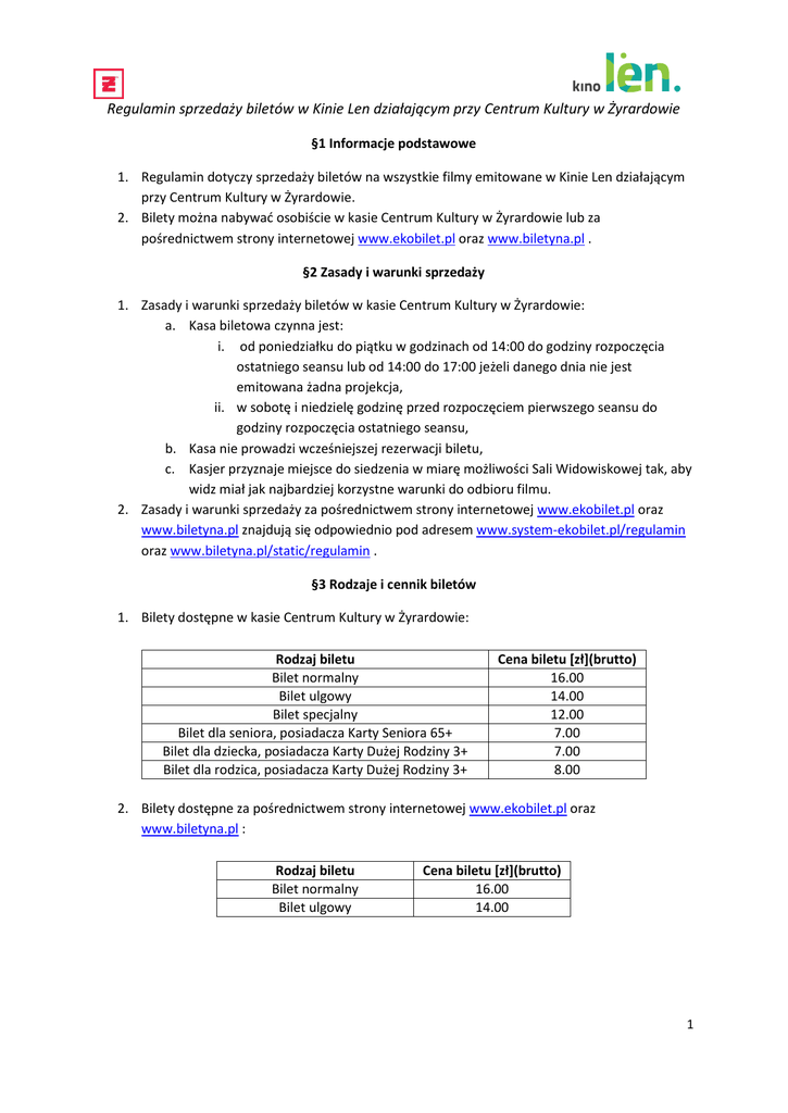 Regulamin sprzedaży biletów w Kinie Len działającym przy Centrum Kultury w Żyrardowie §1 Informacje podstawowe 1. Regulamin dotyczy sprzedaży biletów na wszystkie filmy emitowane w Kinie Len działającym przy Centrum Kultury w Żyrardowie. 2. Bilety można nabywać osobiście w kasie Centrum Kultury w Żyrardowie lub za pośrednictwem strony internetowej www.ekobilet.pl oraz www.biletyna.pl . §2 Zasady i warunki sprzedaży 1. Zasady i warunki sprzedaży biletów w kasie Centrum Kultury w Żyrardowie: a. Kasa biletowa czynna jest: i. od poniedziałku do piątku w godzinach od 14:00 do godziny rozpoczęcia ostatniego seansu lub od 14:00 do 17:00 jeżeli danego dnia nie jest emitowana żadna projekcja, ii. w sobotę i niedzielę godzinę przed rozpoczęciem pierwszego seansu do godziny rozpoczęcia ostatniego seansu, b. Kasa nie prowadzi wcześniejszej rezerwacji biletu, c. Kasjer przyznaje miejsce do siedzenia w miarę możliwości Sali Widowiskowej tak, aby widz miał jak najbardziej korzystne warunki do odbioru filmu. 2. Zasady i warunki sprzedaży za pośrednictwem strony internetowej www.ekobilet.pl oraz www.biletyna.pl znajdują się odpowiednio pod adresem www.system-ekobilet.pl/regulamin oraz www.biletyna.pl/static/regulamin . §3 Rodzaje i cennik biletów 1. Bilety dostępne w kasie Centrum Kultury w Żyrardowie: Rodzaj biletu Bilet normalny Bilet ulgowy Bilet specjalny Bilet dla seniora, posiadacza Karty Seniora 65+ Bilet dla dziecka, posiadacza Karty Dużej Rodziny 3+ Bilet dla rodzica, posiadacza Karty Dużej Rodziny 3+ Cena biletu [zł](brutto) 16.00 14.00 12.00 7.00 7.00 8.00 2. Bilety dostępne za pośrednictwem strony internetowej www.ekobilet.pl oraz www.biletyna.pl : Rodzaj biletu Bilet normalny Bilet ulgowy Cena biletu [zł](brutto) 16.00 14.00 1 §4 Uprawnienia do zniżek 1. Bilet ulgowy – do zakupu biletu uprawnione są następujące osoby: a. Uczniowie, którzy posiadają i okażą w momencie kontroli biletów ważną legitymację uczniowską, b. Studenci do 26-go roku życia, którzy posiadają i okażą w momencie kontroli biletów ważną legitymację studencką, c. Renciści, którzy posiadają i okażą w momencie kontroli biletów ważną legitymację rencisty, d. Emeryci, którzy posiadają i okażą w momencie kontroli biletów ważną legitymację emeryta, 2. Bilet specjalny – do zakupu biletu uprawnione są następujące osoby: a. Osoby niepełnosprawne, którzy posiadają i okażą w momencie kontroli biletów ważne orzeczenie lekarskie, b. Opiekunowie osób niepełnosprawnych, którzy zostaną wskazani przez osobę niepełnosprawną (jednej osobie niepełnosprawnej może towarzyszyć jeden opiekun), c. Członkowie i opiekunowie grup zorganizowanych, kiedy grupa liczy przynajmniej 15 osób, d. Dzieci do 3-go roku życia, kiedy zajmują własne miejsce na sali, e. Dawcy krwi, którzy posiadają i okażą w momencie kontroli biletów ważną legitymację Honorowego Dawcy Krwi (czas ostatniego oddania nie może przekraczać 6-ciu miesięcy) lub Zasłużonego Honorowego Dawcy Krwi. f. Wszystkie osoby, które zakupią bilet na seans oznaczony hasłem „Seans promocyjny” lub „Poranek dla dzieci”. 3. Bilet dla seniora, posiadacza Karty Seniora 65+ – do zakupu biletu uprawnione są osoby, które posiadają i okażą w momencie kontroli biletów ważną Kartę Seniora 65+ wydaną w Urzędzie Miasta Żyrardowa. 4. Bilet dla dziecka, posiadacza Karty Dużej Rodziny 3+ - do zakupu biletu uprawnione są dzieci rodzin wielodzietnych, które posiadają i okażą w momencie zakupu oraz kontroli biletów ważną Kartę Dużej Rodziny 3+ (lub jej odpowiednik) wydaną w Urzędzie Miasta Żyrardowa, Urzędzie Gminy Jaktorów lub Urzędzie Gminy Baranów. 5. Bilet dla rodzica, posiadacza Karty Dużej Rodziny 3+ – do zakupu biletu uprawnieni są rodzice rodzin wielodzietnych, którzy posiadają i okażą w momencie zakupu oraz kontroli biletów ważną Kartę Dużej Rodziny 3+ (lub jej odpowiednik) wydaną w Urzędzie Miasta Żyrardowa, Urzędzie Gminy Jaktorów lub Urzędzie Gminy Baranów. 6. Zniżki na bilety nie łączą się. §5 Honorowanie kuponów partnerów 1. W Kinie Len honorowane są następujące rodzaje kuponów: a. Multibilet, b. QlturaProfit i CinemaProfit. 2. Kupony podlegają wymianie na bilety w kasie Kina Len. 3. Za jeden kupon można otrzymać wyłącznie jeden bilet. 2 §6 Kontrola biletów 1. Do kontroli biletów upoważniony jest bileter. 2. Widz zobowiązany jest do okazania biletu i dokumentów warunkujących uzyskanie zniżki na każdą prośbę biletera. 3. Bilet staje się ważny w momencie: a. Oderwania części biletu zawierającego jego unikalny numer, b. Zeskanowania kodu QR z biletu zawierającego unikalny numer. §7 Zwrot biletów 1. Zwrot biletów możliwy jest w przypadku, gdy: a. Projekcja filmu została przełożona lub odwołana, b. Pozostało nie mniej niż 30 minut do rozpoczęcia seansu. 2. Za zwrócony bilet wypłaca się 100% ceny biletu. 3. Zwrot możliwy jest za okazaniem dokumentu sprzedaży oraz biletu. §8 Postanowienia końcowe 1. W kwestiach spornych głos decydujący należy do Centrum Kultury w Żyrardowie. 2. Centrum Kultury w Żyrardowie zastrzega sobie prawo do zmiany regulaminu w dowolnym momencie. 3